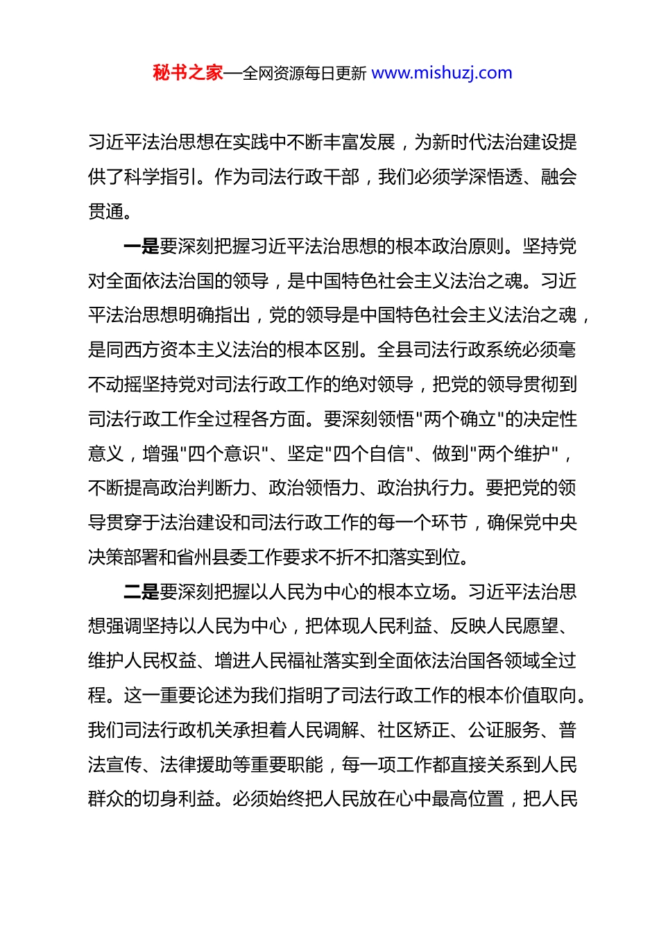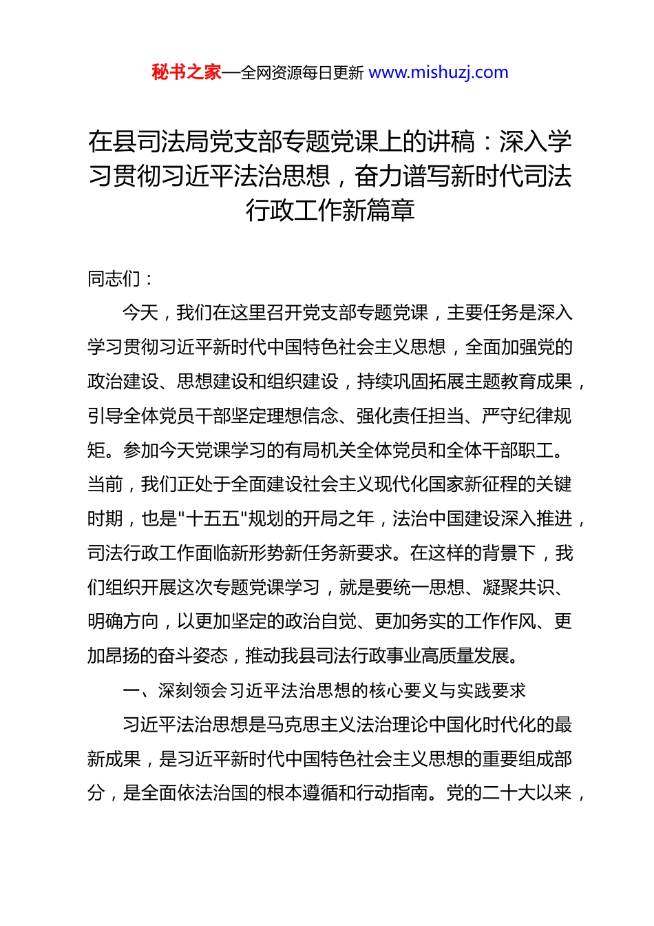 秘书之家—全网资源每日更新 www.mishuzj.com在县司法局党支部专题党课上的讲稿:深入学习贯彻习近平法治思想,奋力谱写新时代司法行政工作新篇章 同志们:今天,我们在这里召开党支部专题党课,主要任务是深入学习贯彻习近平新时代中国特色社会主义思想,全面加强党的政治建设、思想建设和组织建设,持续巩固拓展主题教育成果,引导全体党员干部坚定理想信念、强化责任担当、严守纪律规矩。参加今天党课学习的有局机关全体党员和全体干部职工。当前,我们正处于全面建设社会主义现代化国家新征程的关键时期,也是"十五五"规划的开局之年,法治中国建设深入推进,司法行政工作面临新形势新任务新要求。在这样的背景下,我们组织开展这次专题党课学习,就是要统一思想、凝聚共识、明确方向,以更加坚定的政治自觉、更加务实的工作作风、更加昂扬的奋斗姿态,推动我县司法行政事业高质量发展。一、深刻领会习近平法治思想的核心要义与实践要求习近平法治思想是马克思主义法治理论中国化时代化的最新成果,是习近平新时代中国特色社会主义思想的重要组成部分,是全面依法治国的根本遵循和行动指南。党的二十大以来,秘书之家—全网资源每日更新 www.mishuzj.com习近平法治思想在实践中不断丰富发展,为新时代法治建设提供了科学指引。作为司法行政干部,我们必须学深悟透、融会贯通。一是要深刻把握习近平法治思想的根本政治原则。坚持党对全面依法治国的领导,是中国特色社会主义法治之魂。习近平法治思想明确指出,党的领导是中国特色社会主义法治之魂,是同西方资本主义法治的根本区别。全县司法行政系统必须毫不动摇坚持党对司法行政工作的绝对领导,把党的领导贯彻到司法行政工作全过程各方面。要深刻领悟"两个确立"的决定性意义,增强"四个意识"、坚定"四个自信"、做到"两个维护",不断提高政治判断力、政治领悟力、政治执行力。要把党的领导贯穿于法治建设和司法行政工作的每一个环节,确保党中央决策部署和省州县委工作要求不折不扣落实到位。二是要深刻把握以人民为中心的根本立场。习近平法治思想强调坚持以人民为中心,把体现人民利益、反映人民愿望、维护人民权益、增进人民福祉落实到全面依法治国各领域全过程。这一重要论述为我们指明了司法行政工作的根本价值取向。我们司法行政机关承担着人民调解、社区矫正、公证服务、普法宣传、法律援助等重要职能,每一项工作都直接关系到人民群众的切身利益。必须始终把人民放在心中最高位置,把人民秘书之家—全网资源每日更新 www.mishuzj.com满意作为检验司法行政工作的根本标准,用心用情用力解决群众急难愁盼问题,不断增强人民群众的获得感、幸福感、安全感。三是要深刻把握中国特色社会主义法治道路的正确方向。习近平法治思想深刻阐明了走中国特色社会主义法治道路的重大意义、根本遵循和实践要求。这条道路的核心要义是坚持党的领导、人民当家作主、依法治国有机统一。作为基层司法行政部门,我们要坚定不移走中国特色社会主义法治道路,自觉抵制西方错误思潮影响,坚决维护国家法治统一、尊严、权威。要把坚持依法治国和以德治国结合起来,把法治建设与道德建设结合起来,推动全社会形成尊法学法守法用法的良好氛围。二、牢固树立和自觉践行正确政绩观习近平总书记指出,共产党人必须牢记,为民造福是最大政绩。树立和践行正确政绩观,是党员干部的必修课,也是做好新时代司法行政工作的重要前提。当前,有的同志在工作中存在重显绩轻潜绩、重短期轻长远、重形式轻实效等问题,这些都与正确政绩观的要求背道而驰。我们必须端正思想认识,校正工作导向。一是要解决好"政绩为谁而树"的根本问题。政绩观的根本问题是"为谁创造政绩"。我们党没有自己特殊的利益,党在任秘书之家—全网资源每日更新 www.mishuzj.com何时候都把群众利益放在第一位。司法行政工作的出发点和落脚点就是为人民服务。在人民调解工作中,我们要把化解矛盾纠纷、维护群众合法权益作为最大政绩;在社区矫正工作中,我们要把帮助矫正对象顺利回归社会作为重要成效;在公证服务中,我们要把便民利民惠民作为工作标准。要坚决摒弃那种为了个人升迁...