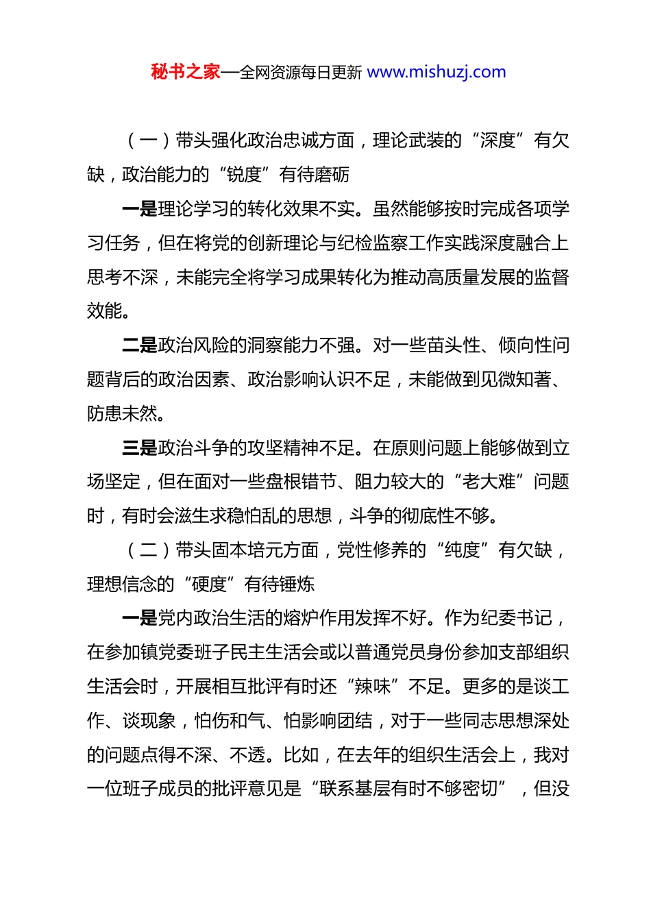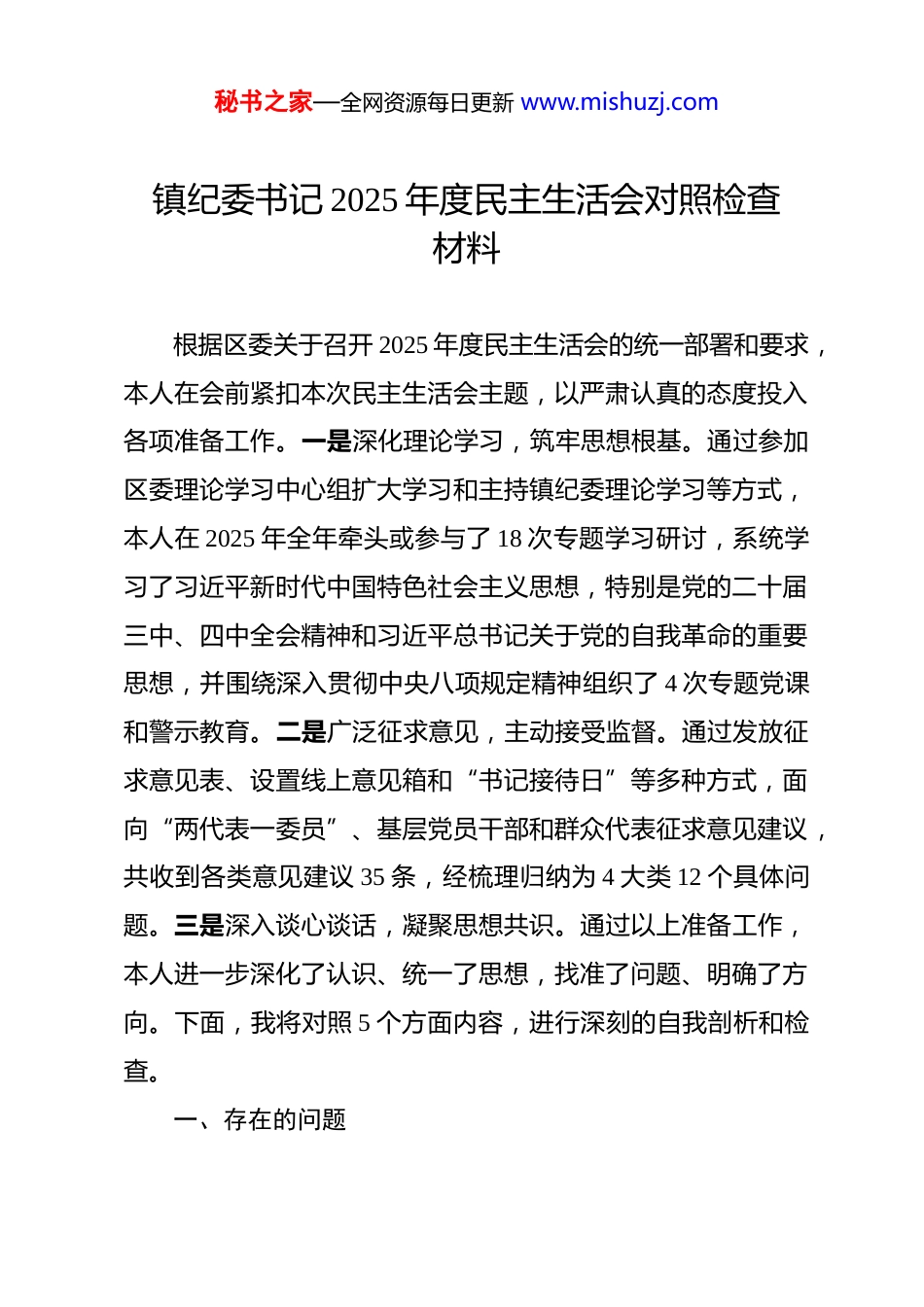 秘书之家—全网资源每日更新 www.mishuzj.com镇纪委书记 2025 年度民主生活会对照检查材料 根据区委关于召开 2025 年度民主生活会的统一部署和要求,本人在会前紧扣本次民主生活会主题,以严肃认真的态度投入各项准备工作。一是深化理论学习,筑牢思想根基。通过参加区委理论学习中心组扩大学习和主持镇纪委理论学习等方式,本人在 2025 年全年牵头或参与了 18 次专题学习研讨,系统学习了习近平新时代中国特色社会主义思想,特别是党的二十届三中、四中全会精神和习近平总书记关于党的自我革命的重要思想,并围绕深入贯彻中央八项规定精神组织了 4 次专题党课和警示教育。二是广泛征求意见,主动接受监督。通过发放征求意见表、设置线上意见箱和“书记接待日”等多种方式,面向“两代表一委员”、基层党员干部和群众代表征求意见建议,共收到各类意见建议 35 条,经梳理归纳为 4 大类 12 个具体问题。三是深入谈心谈话,凝聚思想共识。通过以上准备工作,本人进一步深化了认识、统一了思想,找准了问题、明确了方向。下面,我将对照 5 个方面内容,进行深刻的自我剖析和检查。一、存在的问题秘书之家—全网资源每日更新 www.mishuzj.com(一)带头强化政治忠诚方面,理论武装的“深度”有欠缺,政治能力的“锐度”有待磨砺一是理论学习的转化效果不实。虽然能够按时完成各项学习任务,但在将党的创新理论与纪检监察工作实践深度融合上思考不深,未能完全将学习成果转化为推动高质量发展的监督效能。二是政治风险的洞察能力不强。对一些苗头性、倾向性问题背后的政治因素、政治影响认识不足,未能做到见微知著、防患未然。三是政治斗争的攻坚精神不足。在原则问题上能够做到立场坚定,但在面对一些盘根错节、阻力较大的“老大难”问题时,有时会滋生求稳怕乱的思想,斗争的彻底性不够。(二)带头固本培元方面,党性修养的“纯度”有欠缺,理想信念的“硬度”有待锤炼一是党内政治生活的熔炉作用发挥不好。作为纪委书记,在参加镇党委班子民主生活会或以普通党员身份参加支部组织生活会时,开展相互批评有时还“辣味”不足。更多的是谈工作、谈现象,怕伤和气、怕影响团结,对于一些同志思想深处的问题点得不深、不透。比如,在去年的组织生活会上,我对一位班子成员的批评意见是“联系基层有时不够密切”,但没秘书之家—全网资源每日更新 www.mishuzj.com有进一步指出其根源是群众立场树得不牢、官本位思想尚未根除的问题。二是精神追求的境界标准要求不高。随着工作阅历的增长,有时会不自觉地产生“歇歇脚”的念头,在改造主观世界上所下的功夫有所减弱。满足于事务性工作多,静下心来读原著、学原文、悟原理的时间被挤占,导致理论素养和精神境界的提升进入了“平台期”。2025 年,我给自己定下了通读《习近平著作选读》第二卷的目标,但至今仍有近三分之一的篇目未完成精读,学习笔记仅记录了不到 2 万字。三是为民服务的宗旨情怀扎根不深。虽然也经常下基层,但有时存在“被动下访”多、“主动解题”少的情况。对于群众反映强烈的诉置,有时未能做到第一时间响应、全过程跟踪。2025 年 10 月,有群众多次通过便民热线反映**社区一处建筑垃圾清运不及时、影响环境的问题。我虽然批示给了相关部门办理,但没有亲自到现场督办核实,导致问题拖延了近 20 天才得到彻底解决,反映出我“马上就办、真抓实干”的作风还不够扎实。(三)带头敬畏人民组织法纪方面,群众路线的“温度”有欠缺,权力观念的“准度”有待校正一是践行“四下基层”制度不主动。全年虽然下到村(社秘书之家—全网资源每日更新 www.mishuzj.com区)开展调研、信访接待等工作合计超过 40 次,但真正带着问题、沉到一线“解剖麻雀”式的深度调研不多。例如,在推进“清廉村居”建设工作中,我更多的是在会议上作部署、听汇报,但在 2025 年,我仅选取了 2 个村作为联系点进行蹲点调研,对全镇**个村(社区)在建设中遇到的普遍性困难和个性化问题掌握得不够全面、不够精准,导致后续出台的一些指导性文件针对性不强。二是执行民主集中制的自觉性不好。在纪委内部的议事...
