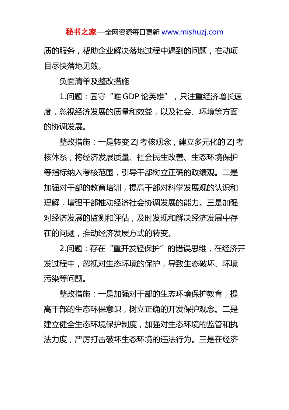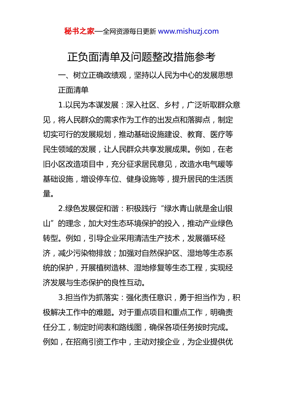 秘书之家—全网资源每日更新 www.mishuzj.com正负面清单及问题整改措施参考一、树立正确政绩观,坚持以人民为中心的发展思想正面清单1.以民为本谋发展:深入社区、乡村,广泛听取群众意见,将人民群众的需求作为工作的出发点和落脚点,制定切实可行的发展规划,推动基础设施建设、教育、医疗等民生领域的发展,让人民群众共享发展成果。例如,在老旧小区改造项目中,充分征求居民意见,改造水电气暖等基础设施,增设停车位、健身设施等,提升居民的生活质量。2.绿色发展促和谐:积极践行“绿水青山就是金山银山”的理念,加大对生态环境保护的投入,推动产业绿色转型。例如,引导企业采用清洁生产技术,发展循环经济,减少污染物排放;加强对自然保护区、湿地等生态系统的保护,开展植树造林、湿地修复等生态工程,实现经济发展与生态保护的良性互动。3.担当作为抓落实:强化责任意识,勇于担当作为,积极解决工作中的难题。对于重点项目和重点工作,明确责任分工,制定时间表和路线图,确保各项任务按时完成。例如,在招商引资工作中,主动对接企业,为企业提供优秘书之家—全网资源每日更新 www.mishuzj.com质的服务,帮助企业解决落地过程中遇到的问题,推动项目尽快落地见效。负面清单及整改措施1.问题:固守“唯 GDP 论英雄”,只注重经济增长速度,忽视经济发展的质量和效益,以及社会、环境等方面的协调发展。整改措施:一是转变 ZJ 考核观念,建立多元化的 ZJ 考核体系,将经济发展质量、社会民生改善、生态环境保护等指标纳入考核范围,引导干部树立正确的政绩观。二是加强对干部的教育培训,提高干部对科学发展观的认识和理解,增强干部推动经济社会协调发展的能力。三是加强对经济发展的监测和评估,及时发现和解决经济发展中存在的问题,推动经济发展方式的转变。2.问题:存在“重开发轻保护”的错误思维,在经济开发过程中,忽视对生态环境的保护,导致生态破坏、环境污染等问题。整改措施:一是加强对干部的生态环境保护教育,提高干部的生态环保意识,树立正确的开发保护观念。二是建立健全生态环境保护制度,加强对生态环境的监管和执法力度,严厉打击破坏生态环境的违法行为。三是在经济秘书之家—全网资源每日更新 www.mishuzj.com开发项目中,严格执行环境影响评价制度,确保项目建设符合生态环境保护要求。3.问题:存在急功近利心态,为了追求短期 ZJ,盲目上马一些项目,忽视项目的可行性和可持续性。整改措施:一是加强对干部的思想教育,引导干部树立正确的价值观和政绩观,克服急功近利的心态。二是建立健全项目决策机制,加强对项目的可行性研究和论证,确保项目建设符合经济社会发展的实际需要。三是加强对项目建设的监督和管理,及时发现和解决项目建设中存在的问题,确保项目建设顺利推进。二、坚持实事求是,作出符合实际、遵循规律的科学决策正面清单1.深入调研求实效:在决策前,深入基层、深入群众、深入实际,开展广泛的调查研究,了解实际情况,掌握第一手资料。例如,在制定城市规划时,组织相关部门和专家深入城市各个区域,了解城市的地形地貌、人口分布、产业发展等情况,为城市规划提供科学依据。2.尊重规律促发展:在决策过程中,充分尊重自然规律、经济规律和社会发展规律,避免违背规律的决策。例如,在农业产业发展中,根据当地的气候、土壤等自然条秘书之家—全网资源每日更新 www.mishuzj.com件,选择适合当地种植的农作物品种,发展特色农业产业。3.民主决策聚智慧:坚持民主集中制原则,充分发扬民主,广泛听取各方面的意见和建议,集中集体智慧,作出科学决策。例如,在重大项目决策中,组织召开听证会、专家论证会等,广泛征求社会各界的意见和建议,确保决策的科学性和民主性。负面清单及整改措施1.问题:脱离实际盲目决策,不考虑实际情况和客观条件,凭主观意愿和想象作出决策,导致决策无法实施或实施效果不佳。整改措施:一是加强对决策人员的教育培训,提高决策人员的业务素质和决策能力,增强决策人员的实际调研能力和分析判断能力。二是建立健全决策调研制度,在决策前,必须进行深入的调查研究,了解实际情...