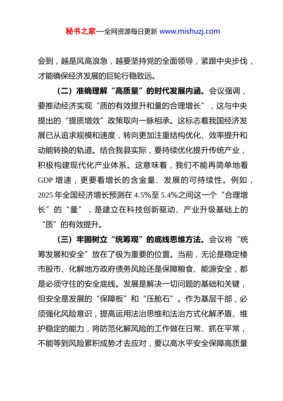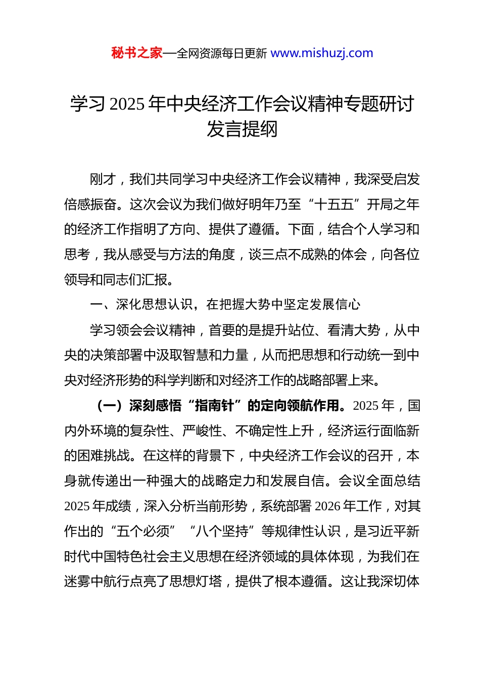 秘书之家—全网资源每日更新 www.mishuzj.com学习 2025 年中央经济工作会议精神专题研讨发言提纲刚才,我们共同学习中央经济工作会议精神,我深受启发倍感振奋。这次会议为我们做好明年乃至“十五五”开局之年的经济工作指明了方向、提供了遵循。下面,结合个人学习和思考,我从感受与方法的角度,谈三点不成熟的体会,向各位领导和同志们汇报。一、深化思想认识,在把握大势中坚定发展信心学习领会会议精神,首要的是提升站位、看清大势,从中央的决策部署中汲取智慧和力量,从而把思想和行动统一到中央对经济形势的科学判断和对经济工作的战略部署上来。(一)深刻感悟“指南针”的定向领航作用。2025 年,国内外环境的复杂性、严峻性、不确定性上升,经济运行面临新的困难挑战。在这样的背景下,中央经济工作会议的召开,本身就传递出一种强大的战略定力和发展自信。会议全面总结2025 年成绩,深入分析当前形势,系统部署 2026 年工作,对其作出的“五个必须”“八个坚持”等规律性认识,是习近平新时代中国特色社会主义思想在经济领域的具体体现,为我们在迷雾中航行点亮了思想灯塔,提供了根本遵循。这让我深切体秘书之家—全网资源每日更新 www.mishuzj.com会到,越是风高浪急,越要坚持党的全面领导,紧跟中央步伐,才能确保经济发展的巨轮行稳致远。(二)准确理解“高质量”的时代发展内涵。会议强调,要推动经济实现“质的有效提升和量的合理增长”,这与中央提出的“提质增效”政策取向一脉相承。这标志着我国经济发展已从追求规模和速度,转向更加注重结构优化、效率提升和动能转换的轨道。结合我县实际,要持续优化提升传统产业,积极构建现代化产业体系。这意味着,我们不能再简单地看GDP 增速,更要看增长的含金量、发展的可持续性。例如,2025 年全国经济增长预测在 4.5%至 5.4%之间这一个“合理增长”的“量”,是建立在科技创新驱动、产业升级基础上的“质”的有效提升。(三)牢固树立“统筹观”的底线思维方法。会议将“统筹发展和安全”放在了极为重要的位置。当前,无论是稳定楼市股市、化解地方政府债务风险还是保障粮食、能源安全,都是必须守住的安全底线。发展是解决一切问题的基础和关键,但安全是发展的“保障板”和“压舱石”。作为基层干部,必须强化风险意识,提高运用法治思维和法治方式化解矛盾、维护稳定的能力,将防范化解风险的工作做在日常、抓在平常,不能等到风险累积成势才去应对,要以高水平安全保障高质量秘书之家—全网资源每日更新 www.mishuzj.com发展。二、聚焦核心任务,在对标对表中谋划发展路径中央经济工作会议不仅是思想盛宴,更是行动纲领。学习的目的在于转化和应用。我们必须紧密结合*县的实际,将中央提出的九大重点任务,转化为本地发展的具体路径和务实举措。(一)扭住扩大内需这个“牛鼻子”。会议将扩大内需作为首要任务,强调要激发有潜能的消费,扩大有效益的投资。这对于我们这样一个以县域经济为基础的地区尤为关键。思考如何将这一要求落地,我认为关键在于找准结合点。一方面,要深挖县域经济发展潜力,围绕本地特色农产品、文旅资源,优化供给,创造新的消费场景。另一方面,要提高招商引资的精准度和实效性,围绕产业链的延链补链强链,谋划和推动一批能够激发民间投资活力、具有长远效益的好项目。(二)激活科技创新这个“主引擎”。会议对以科技创新引领现代化产业体系建设作出了具体部署,特别提到了人工智能、低空经济、商业航天等新兴产业。对我们县而言,虽然直接发展这些前沿产业有难度,但“创新”二字同样适用。我们可以更多地将创新思维和技术应用到传统产业的改造升级中,比如用数字化技术赋能农牧业,用绿色技术提升矿产资源开发利用效率。同时,要积极优化营商环境,为那些有创新意愿和秘书之家—全网资源每日更新 www.mishuzj.com能力的中小微企业、民营企业提供成长的沃土,鼓励他们投身乡村振兴各项事业。(三)筑牢城乡区域协调这块“压舱石”。会议提出要推动城乡融合和区域协调发展。我国区域协调发展正以城市群为核心稳步推进。身处西部地区,我们更要主动融入国家大的发...