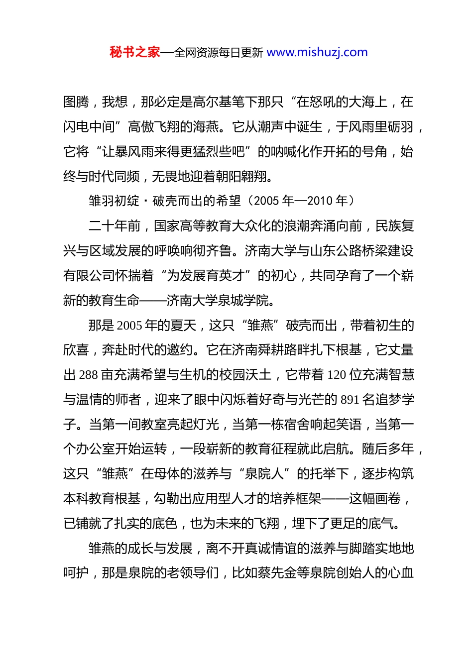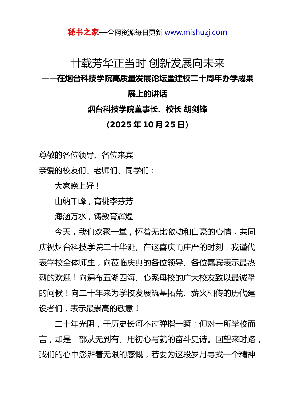 秘书之家—全网资源每日更新 www.mishuzj.com廿载芳华正当时 创新发展向未来——在烟台科技学院高质量发展论坛暨建校二十周年办学成果展上的讲话烟台科技学院董事长、校长 胡剑锋(2025 年 10 月 25 日)尊敬的各位领导、各位来宾亲爱的校友们、老师们、同学们:大家晚上好!山纳千峰,育桃李芬芳海涵万水,铸教育辉煌今天,我们欢聚一堂,怀着无比激动和自豪的心情,共同庆祝烟台科技学院二十华诞。在这喜庆而庄严的时刻,我谨代表学校全体师生,向莅临庆典的各位领导、各位嘉宾表示最热烈的欢迎!向遍布五湖四海、心系母校的广大校友致以最诚挚的问候!向二十年来为学校发展筑基拓荒、薪火相传的历代建设者们,表示最崇高的敬意!二十年光阴,于历史长河不过弹指一瞬;但对一所学校而言,却是一部从无到有、用初心写就的奋斗史诗。回望来时路,我们的心中澎湃着无限的感慨,若要为这段岁月寻找一个精神秘书之家—全网资源每日更新 www.mishuzj.com图腾,我想,那必定是高尔基笔下那只“在怒吼的大海上,在闪电中间”高傲飞翔的海燕。它从潮声中诞生,于风雨里砺羽,它将“让暴风雨来得更猛烈些吧”的呐喊化作开拓的号角,始终与时代同频,无畏地迎着朝阳翱翔。雏羽初绽·破壳而出的希望(2005 年—2010 年)二十年前,国家高等教育大众化的浪潮奔涌向前,民族复兴与区域发展的呼唤响彻齐鲁。济南大学与山东公路桥梁建设有限公司怀揣着“为发展育英才”的初心,共同孕育了一个崭新的教育生命——济南大学泉城学院。那是 2005 年的夏天,这只“雏燕”破壳而出,带着初生的欣喜,奔赴时代的邀约。它在济南舜耕路畔扎下根基,它丈量出 288 亩充满希望与生机的校园沃土,它带着 120 位充满智慧与温情的师者,迎来了眼中闪烁着好奇与光芒的 891 名追梦学子。当第一间教室亮起灯光,当第一栋宿舍响起笑语,当第一个办公室开始运转,一段崭新的教育征程就此启航。随后多年,这只“雏燕”在母体的滋养与“泉院人”的托举下,逐步构筑本科教育根基,勾勒出应用型人才的培养框架——这幅画卷,已铺就了扎实的底色,也为未来的飞翔,埋下了更足的底气。雏燕的成长与发展,离不开真诚情谊的滋养与脚踏实地地呵护,那是泉院的老领导们,比如蔡先金等泉院创始人的心血秘书之家—全网资源每日更新 www.mishuzj.com付出。今日,他们也亲临学校,见证“泉院”到“烟科”的蓬勃成长,感受“烟科人”同“泉院人”一脉相承的力量。在此,我代表全校师生,向所有为学校初创倾注心血的建设者和奉献者,致以最真挚的感谢!羽翼渐丰·勇敢试飞的征程(2011 年—2018 年)成长,从来都不是一蹴而就的。随着羽翼渐丰,这只年轻的海燕开始渴望更广阔的天空。2011 年 5 月,它告别泉城,飞向烟台这片海滨之地。那是试飞的勇气,是奔赴山海的抉择。此后的 7 年,一组组跳动的数字,正诉说着这段不平凡的经历。在大众报业集团的引领与培育下,这只海燕长出了更加坚实的羽翼,学校占地面积从 500 余亩增至 600 余亩,学生从千余人跃升至 8529 人,教职工从百余人增至 600 余人,图书资源从 10余万册增至 50 余万册;近 20 个专业落地生根,20 余个实验室、实训中心相继建成,与 10 余所海外高校、20 余家企业搭建起合作桥梁。多年来,我们或许没有惊天动地的壮举,但每一片新生的羽毛,都浸透着“泉院人”的心血与汗水;每一次振翅的练习,都离不开所有建设者与贡献者的引领与支持;校园的每一寸土地,都记录着这只海燕生长的痕迹。这份成长的背后,离不开济南大学与大众报业集团的鼎力支持,是以刘宗明校长为代表的济大与梁国典董事长为代表的秘书之家—全网资源每日更新 www.mishuzj.com大报的引领与指导,是韩曰明董事长与潘晓生校长及历任泉院领导的初心与坚守,铸就了这只海燕坚实的骨骼。我代表学校向你们表示由衷的感谢,感谢你们的呵护与支持,让海燕的羽翅更加坚实有力;感谢你们的陪伴与指引,让海燕的每一次飞行都沉稳而坚定。振翅高飞·蓄力待发的力量(2019 年—2025 年)每一次蜕变,都源于信念的接力与理想的远航。2019 年,中国教育集团接过泉城...