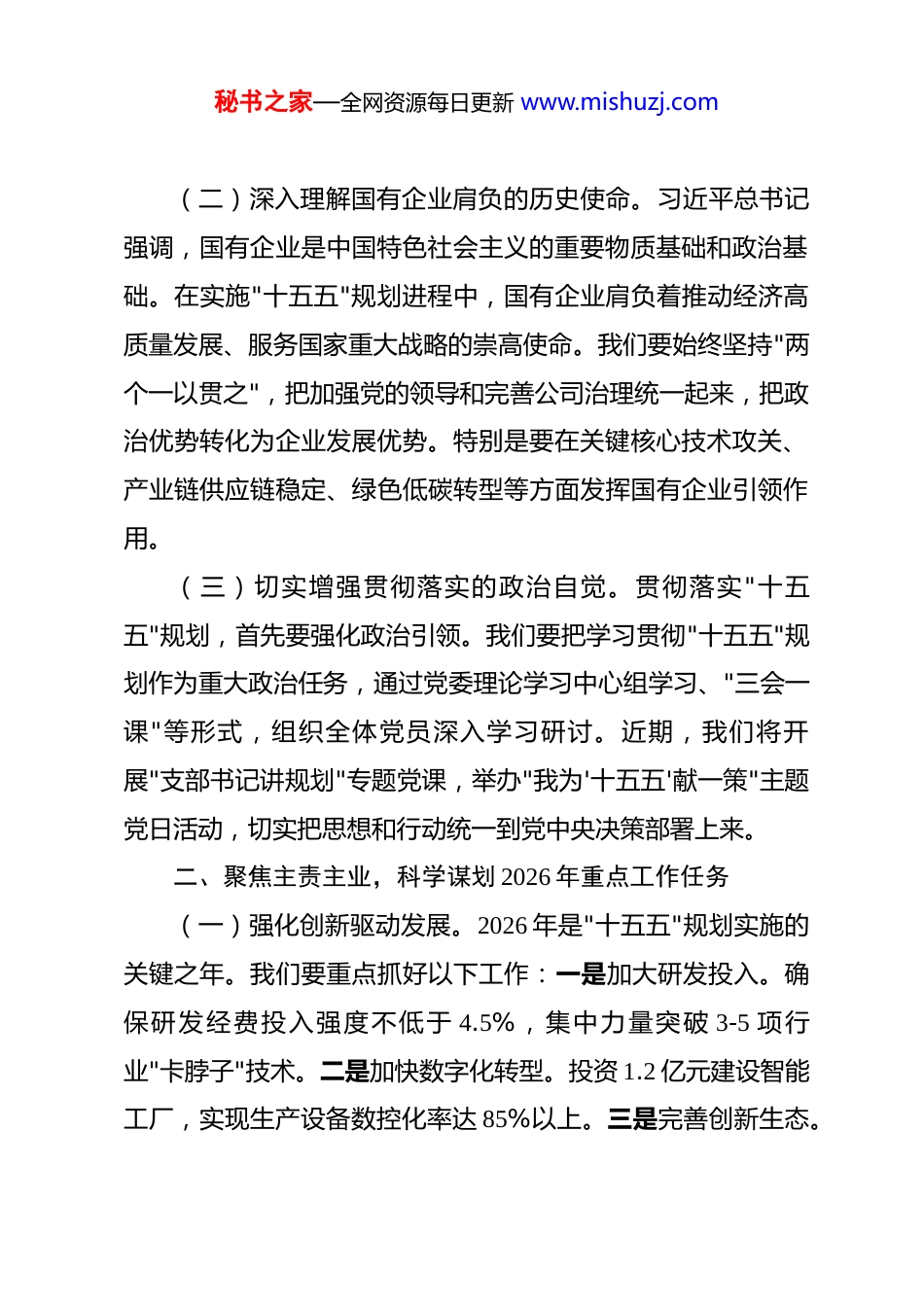 秘书之家—全网资源每日更新 www.mishuzj.com研讨发言:深学“十五五”战略任务奋楫笃行谱新篇 同志们:今天,我们集中学习了《"十五五"时期经济社会发展的重大战略任务》视频,收获颇丰。作为国企党支部书记,我深感使命光荣、责任重大。下面,我结合学习贯彻习近平总书记关于国有企业改革发展和党的建设重要论述,围绕"深学'十五五'战略任务·强党性·重实践·建新功"主题,从三个方面汇报学习心得和落实举措。一、提高政治站位,深刻领会"十五五"规划的战略意义(一)准确把握"十五五"规划的时代背景。"十五五"时期是我国在全面建成小康社会历史性成就的基础上,乘势而上开启全面建设社会主义现代化国家新征程的关键时期。当前,世界百年未有之大变局加速演进,新一轮科技革命和产业变革深入发展,我国发展面临新的战略机遇和风险挑战。作为国企"掌舵人",我们必须胸怀"国之大者",深刻认识到"十五五"规划是习近平新时代中国特色社会主义思想的具体实践,是统筹推进"五位一体"总体布局和协调推进"四个全面"战略布局的重要体现。秘书之家—全网资源每日更新 www.mishuzj.com(二)深入理解国有企业肩负的历史使命。习近平总书记强调,国有企业是中国特色社会主义的重要物质基础和政治基础。在实施"十五五"规划进程中,国有企业肩负着推动经济高质量发展、服务国家重大战略的崇高使命。我们要始终坚持"两个一以贯之",把加强党的领导和完善公司治理统一起来,把政治优势转化为企业发展优势。特别是要在关键核心技术攻关、产业链供应链稳定、绿色低碳转型等方面发挥国有企业引领作用。(三)切实增强贯彻落实的政治自觉。贯彻落实"十五五"规划,首先要强化政治引领。我们要把学习贯彻"十五五"规划作为重大政治任务,通过党委理论学习中心组学习、"三会一课"等形式,组织全体党员深入学习研讨。近期,我们将开展"支部书记讲规划"专题党课,举办"我为'十五五'献一策"主题党日活动,切实把思想和行动统一到党中央决策部署上来。二、聚焦主责主业,科学谋划 2026 年重点工作任务(一)强化创新驱动发展。2026 年是"十五五"规划实施的关键之年。我们要重点抓好以下工作:一是加大研发投入。确保研发经费投入强度不低于 4.5%,集中力量突破 3-5 项行业"卡脖子"技术。二是加快数字化转型。投资 1.2 亿元建设智能工厂,实现生产设备数控化率达 85%以上。三是完善创新生态。秘书之家—全网资源每日更新 www.mishuzj.com建立院士工作站和博士后创新实践基地,打造产学研用协同创新体系。我们要坚持科技自立自强,把创新作为引领发展的第一动力。(二)深化体制机制改革。按照"十五五"规划关于国企改革的要求,我们将着力推进三项制度改革:一是实施经理层成员任期制和契约化管理,完善差异化薪酬分配制度。二是推行市场化选人用人机制,面向全球引进高端人才。三是健全容错纠错机制,出台激励干部担当作为的 10 条具体措施。改革方案已制定完成,计划在 2026 年一季度全面启动实施。(三)加快绿色低碳转型。"双碳"目标是"十五五"规划的重要内容。我们将重点实施"三个一"工程:建设 1 个零碳示范工厂,创建 1 个循环经济产业园,开发 10 个绿色产品。在节能减排方面,确保到 2026 年万元产值能耗同比下降 10%,主要污染物排放总量减少 15%。同时,我们将把环保指标纳入领导干部绩效考核,实行"一票否决"制。三、加强党的建设,为高质量发展提供坚强保证(一)夯实基层党建基础。加强基层党组织建设,重点抓好三项工作:一是创建"五星党支部",开展"党员示范区""党员先锋岗"评选活动。二是推行"党建+项目"模式,在重点工程、重大项目中成立临时党支部。三是完善党组织参与重大事项决秘书之家—全网资源每日更新 www.mishuzj.com策机制,制定党委前置研究讨论重大经营管理事项清单。(二)锻造过硬干部队伍.坚持党管干部原则,以"三项机制"建设为抓手:一是建立优秀年轻干部储备库,选派干部到生产经营一线墩苗历练。二是实施干部能力提升工程,每年组织两期专题培训班。三是强化考核结果运用,对改革攻坚中表现突出的干部大胆使用。(三)涵养良好政治生态.严格落...