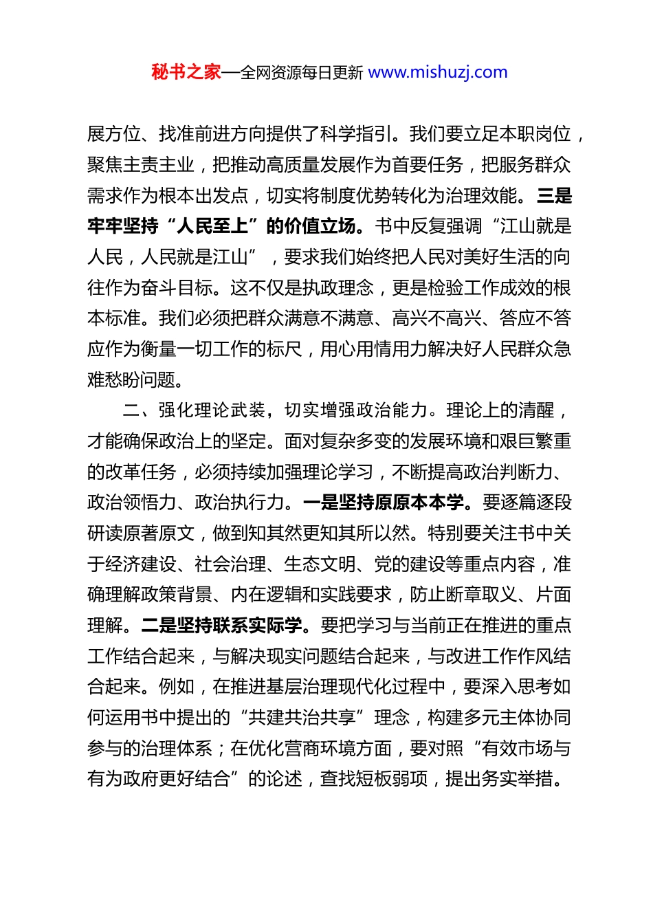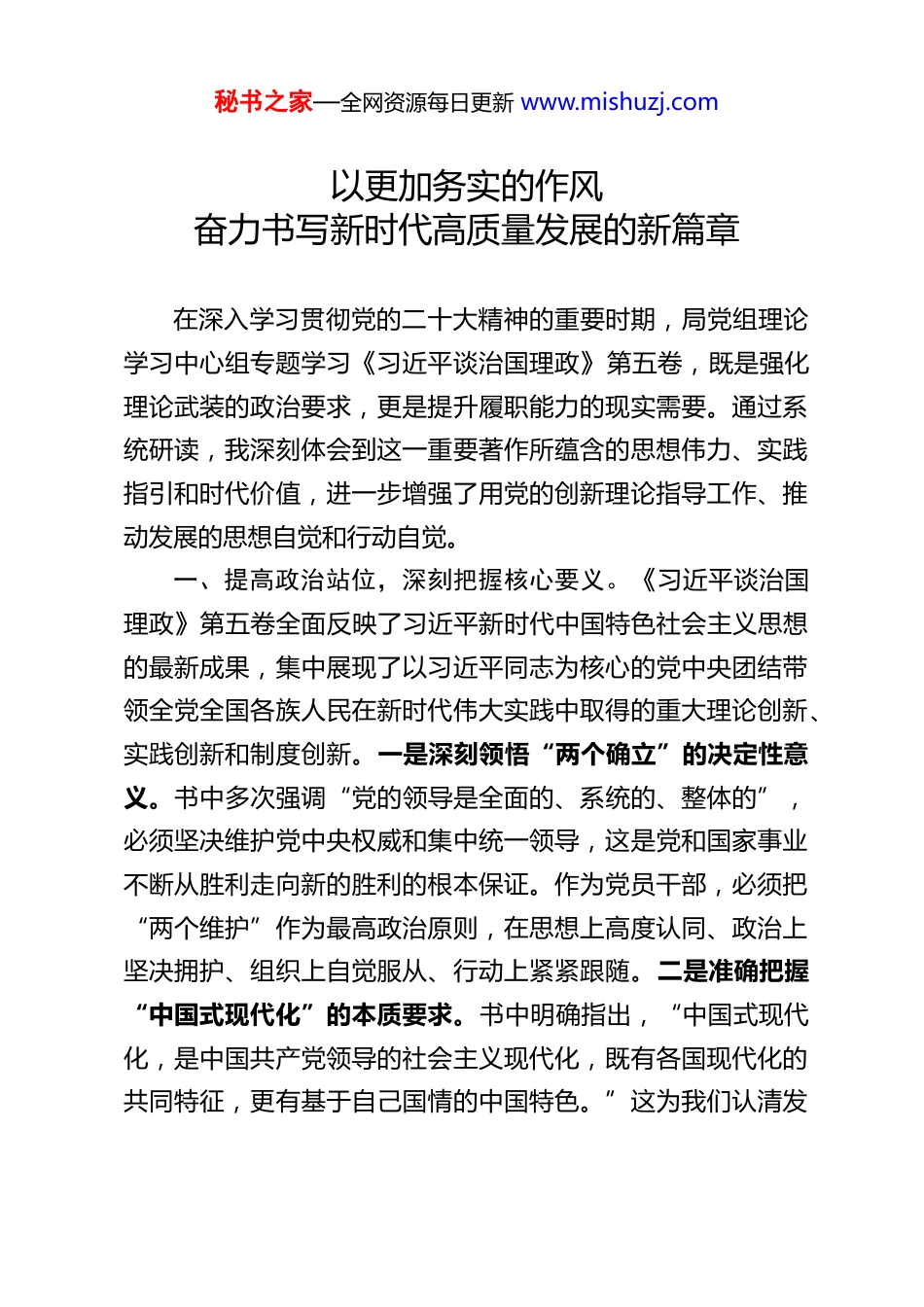 秘书之家—全网资源每日更新 www.mishuzj.com以更加务实的作风奋力书写新时代高质量发展的新篇章在深入学习贯彻党的二十大精神的重要时期,局党组理论学习中心组专题学习《习近平谈治国理政》第五卷,既是强化理论武装的政治要求,更是提升履职能力的现实需要。通过系统研读,我深刻体会到这一重要著作所蕴含的思想伟力、实践指引和时代价值,进一步增强了用党的创新理论指导工作、推动发展的思想自觉和行动自觉。一、提高政治站位,深刻把握核心要义。《习近平谈治国理政》第五卷全面反映了习近平新时代中国特色社会主义思想的最新成果,集中展现了以习近平同志为核心的党中央团结带领全党全国各族人民在新时代伟大实践中取得的重大理论创新、实践创新和制度创新。一是深刻领悟“两个确立”的决定性意义。书中多次强调“党的领导是全面的、系统的、整体的”,必须坚决维护党中央权威和集中统一领导,这是党和国家事业不断从胜利走向新的胜利的根本保证。作为党员干部,必须把“两个维护”作为最高政治原则,在思想上高度认同、政治上坚决拥护、组织上自觉服从、行动上紧紧跟随。二是准确把握“中国式现代化”的本质要求。书中明确指出,“中国式现代化,是中国共产党领导的社会主义现代化,既有各国现代化的共同特征,更有基于自己国情的中国特色。”这为我们认清发秘书之家—全网资源每日更新 www.mishuzj.com展方位、找准前进方向提供了科学指引。我们要立足本职岗位,聚焦主责主业,把推动高质量发展作为首要任务,把服务群众需求作为根本出发点,切实将制度优势转化为治理效能。三是牢牢坚持“人民至上”的价值立场。书中反复强调“江山就是人民,人民就是江山”,要求我们始终把人民对美好生活的向往作为奋斗目标。这不仅是执政理念,更是检验工作成效的根本标准。我们必须把群众满意不满意、高兴不高兴、答应不答应作为衡量一切工作的标尺,用心用情用力解决好人民群众急难愁盼问题。二、强化理论武装,切实增强政治能力。理论上的清醒,才能确保政治上的坚定。面对复杂多变的发展环境和艰巨繁重的改革任务,必须持续加强理论学习,不断提高政治判断力、政治领悟力、政治执行力。一是坚持原原本本学。要逐篇逐段研读原著原文,做到知其然更知其所以然。特别要关注书中关于经济建设、社会治理、生态文明、党的建设等重点内容,准确理解政策背景、内在逻辑和实践要求,防止断章取义、片面理解。二是坚持联系实际学。要把学习与当前正在推进的重点工作结合起来,与解决现实问题结合起来,与改进工作作风结合起来。例如,在推进基层治理现代化过程中,要深入思考如何运用书中提出的“共建共治共享”理念,构建多元主体协同参与的治理体系;在优化营商环境方面,要对照“有效市场与有为政府更好结合”的论述,查找短板弱项,提出务实举措。秘书之家—全网资源每日更新 www.mishuzj.com三是坚持带着问题学。针对工作中遇到的难点堵点,如体制机制障碍、资源要素配置效率不高等问题,要善于从书中寻找方法论指导。比如,书中强调“用改革的办法解决发展中的问题”,这就要求我们在推进工作时,不能简单依靠行政命令,而应注重制度创新、机制完善和流程再造。三、聚焦主责主业,推动成果转化落地。学习的目的在于运用,理论的价值在于实践。我们必须把学习成果转化为推动工作的强大动力和实际成效。一是提升谋划能力。要紧紧围绕党中央决策部署和省委、市委工作要求,科学谋划年度重点工作。例如,在贯彻落实新发展理念方面,要深入分析本地产业基础、资源禀赋和发展阶段,制定差异化、精准化的发展路径,避免照搬照抄、盲目跟风。二是强化执行落实。要坚持问题导向、目标导向、结果导向相统一,建立台账管理、闭环推进的工作机制。对于上级交办的任务、群众反映强烈的诉求,要做到件件有着落、事事有回音。特别是在重大项目审批、民生事项办理等环节,要主动靠前服务,打通“最后一公里”。三是健全长效机制。要注重总结提炼工作中的好经验好做法,形成可复制、可推广的制度成果。比如,在推行“首问责任制”“限时办结制”的基础上,探索建立“服务评价—问题反馈—整改提升”...