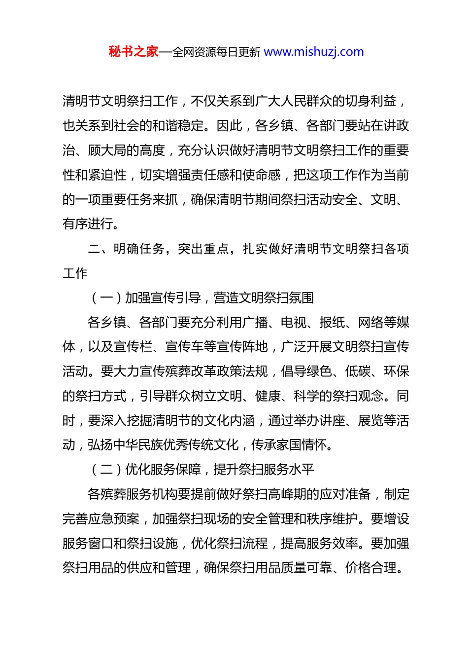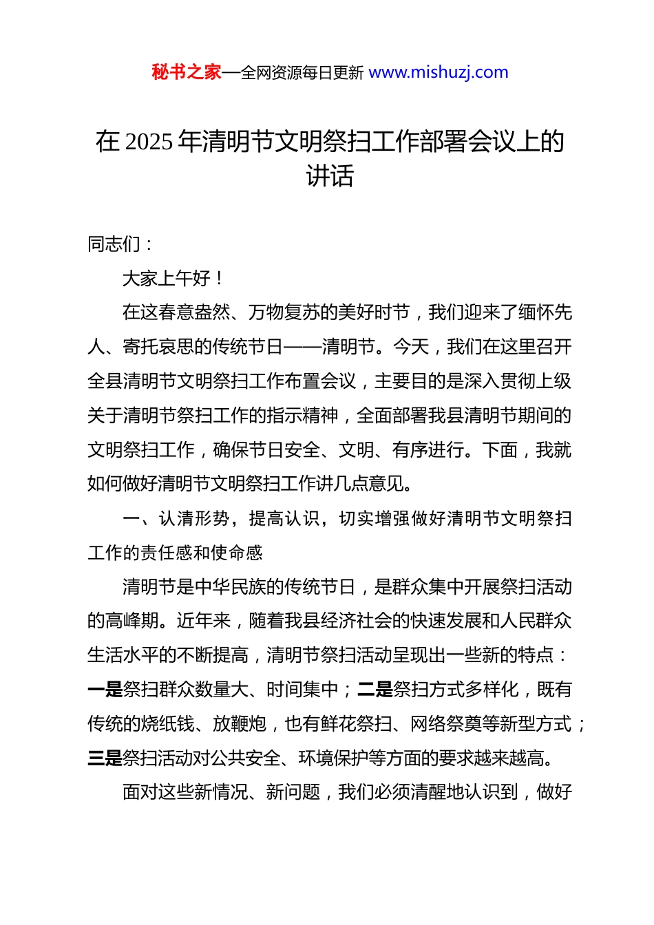 秘书之家—全网资源每日更新 www.mishuzj.com在 2025 年清明节文明祭扫工作部署会议上的讲话 同志们:大家上午好!在这春意盎然、万物复苏的美好时节,我们迎来了缅怀先人、寄托哀思的传统节日——清明节。今天,我们在这里召开全县清明节文明祭扫工作布置会议,主要目的是深入贯彻上级关于清明节祭扫工作的指示精神,全面部署我县清明节期间的文明祭扫工作,确保节日安全、文明、有序进行。下面,我就如何做好清明节文明祭扫工作讲几点意见。一、认清形势,提高认识,切实增强做好清明节文明祭扫工作的责任感和使命感清明节是中华民族的传统节日,是群众集中开展祭扫活动的高峰期。近年来,随着我县经济社会的快速发展和人民群众生活水平的不断提高,清明节祭扫活动呈现出一些新的特点:一是祭扫群众数量大、时间集中;二是祭扫方式多样化,既有传统的烧纸钱、放鞭炮,也有鲜花祭扫、网络祭奠等新型方式;三是祭扫活动对公共安全、环境保护等方面的要求越来越高。面对这些新情况、新问题,我们必须清醒地认识到,做好秘书之家—全网资源每日更新 www.mishuzj.com清明节文明祭扫工作,不仅关系到广大人民群众的切身利益,也关系到社会的和谐稳定。因此,各乡镇、各部门要站在讲政治、顾大局的高度,充分认识做好清明节文明祭扫工作的重要性和紧迫性,切实增强责任感和使命感,把这项工作作为当前的一项重要任务来抓,确保清明节期间祭扫活动安全、文明、有序进行。二、明确任务,突出重点,扎实做好清明节文明祭扫各项工作(一)加强宣传引导,营造文明祭扫氛围各乡镇、各部门要充分利用广播、电视、报纸、网络等媒体,以及宣传栏、宣传车等宣传阵地,广泛开展文明祭扫宣传活动。要大力宣传殡葬改革政策法规,倡导绿色、低碳、环保的祭扫方式,引导群众树立文明、健康、科学的祭扫观念。同时,要深入挖掘清明节的文化内涵,通过举办讲座、展览等活动,弘扬中华民族优秀传统文化,传承家国情怀。(二)优化服务保障,提升祭扫服务水平各殡葬服务机构要提前做好祭扫高峰期的应对准备,制定完善应急预案,加强祭扫现场的安全管理和秩序维护。要增设服务窗口和祭扫设施,优化祭扫流程,提高服务效率。要加强祭扫用品的供应和管理,确保祭扫用品质量可靠、价格合理。秘书之家—全网资源每日更新 www.mishuzj.com同时,要关注特殊群体的祭扫需求,为他们提供便利服务。(三)强化安全管理,确保祭扫活动安全各乡镇、各部门要牢固树立安全意识,切实加强对祭扫活动的安全管理。要加强祭扫现场的巡查和监控,及时发现和消除安全隐患。要严格落实防火措施,禁止在祭扫区域燃放烟花爆竹、焚烧纸钱等易燃物品。要加强与消防、公安等部门的协调配合,共同做好祭扫活动的安全保障工作。(四)推动移风易俗,倡导文明祭扫新风各乡镇、各部门要积极推动殡葬改革,倡导文明、绿色、环保的祭扫方式。要鼓励群众采用鲜花祭扫、网络祭奠、家庭追思会等新型方式缅怀先人,减少环境污染和火灾隐患。同时,要加强对传统祭扫方式的引导和管理,逐步改变群众的传统观念和行为习惯。三、加强领导,落实责任,确保清明节文明祭扫工作取得实效(一)加强组织领导各乡镇、各部门要成立清明节文明祭扫工作领导小组,明确专人负责,制定具体实施方案,确保各项工作落到实处。要加强与上级部门的沟通协调,及时汇报工作进展和遇到的问题,争取更多的支持和帮助。秘书之家—全网资源每日更新 www.mishuzj.com(二)明确责任分工各乡镇、各部门要按照职责分工,切实履行好各自职责。民政部门要发挥好牵头作用,加强对殡葬服务机构的监管和指导;公安部门要加强祭扫活动的治安管理,维护祭扫现场秩序;消防部门要加强祭扫区域的消防安全检查和应急处置;林业部门要加强森林防火宣传和监管;宣传部门要加强文明祭扫的宣传报道,营造良好的社会氛围。(三)加强监督检查各乡镇、各部门要加强对清明节文明祭扫工作的监督检查确保各项工作落到实处。要采取明察暗访、随机抽查等方式,对殡葬服务机构的服务质量、安全管理等方面进行检查,发现问题及时整改。同时,要加强对祭扫活动的巡查和监控,确保祭扫活动安全有...