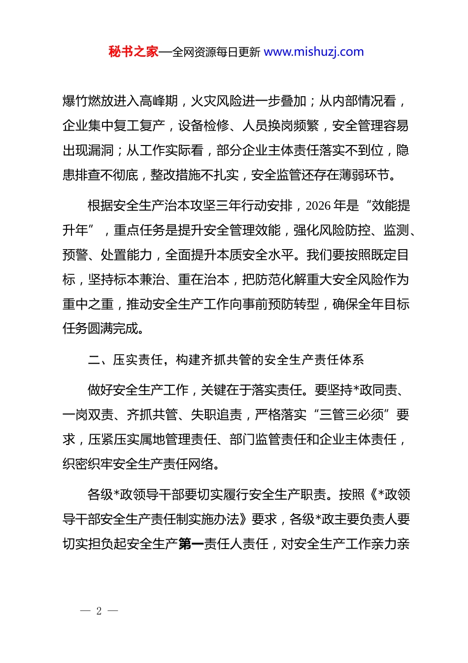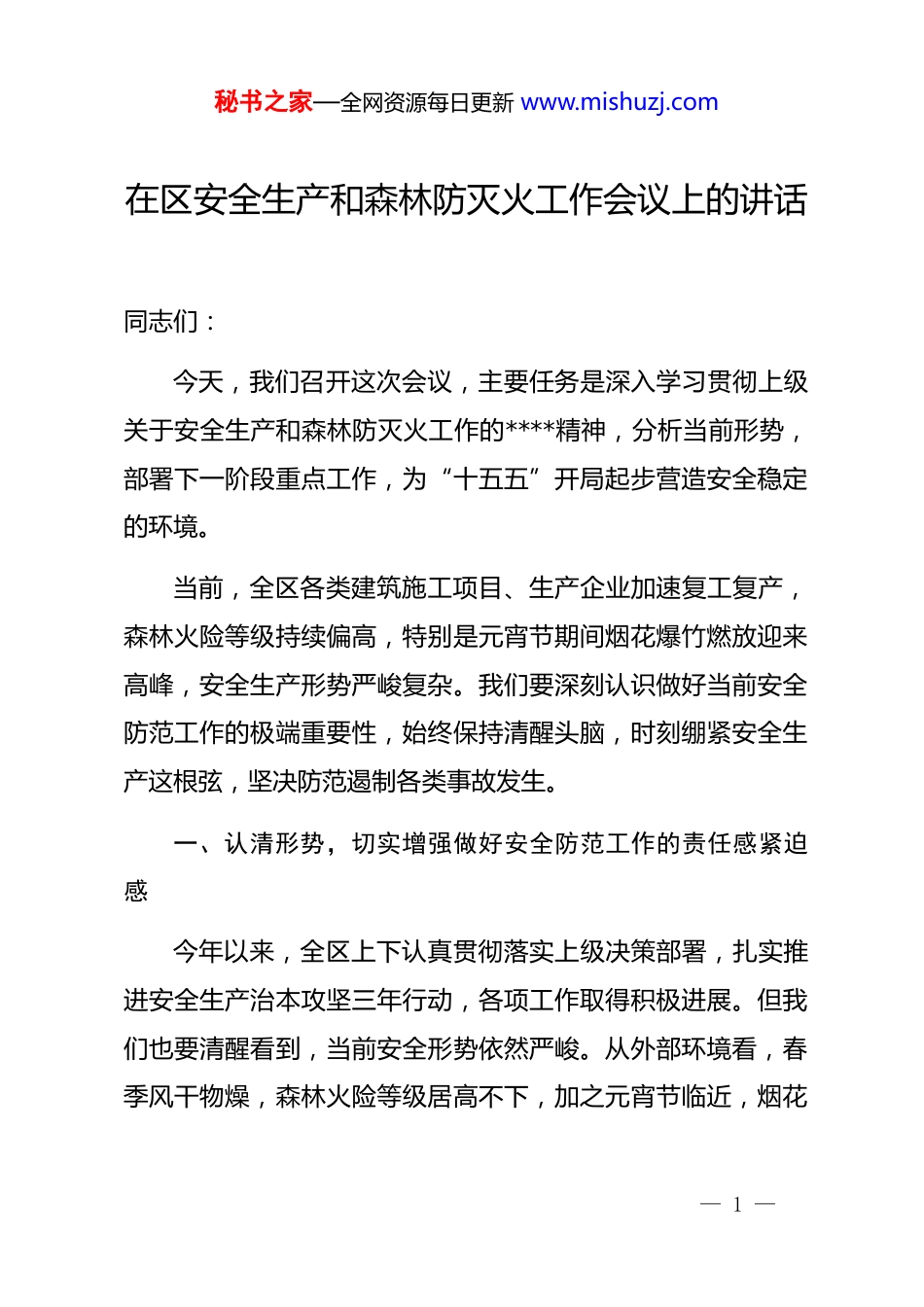 秘书之家—全网资源每日更新 www.mishuzj.com在区安全生产和森林防灭火工作会议上的讲话同志们:今天,我们召开这次会议,主要任务是深入学习贯彻上级关于安全生产和森林防灭火工作的****精神,分析当前形势,部署下一阶段重点工作,为“十五五”开局起步营造安全稳定的环境。当前,全区各类建筑施工项目、生产企业加速复工复产,森林火险等级持续偏高,特别是元宵节期间烟花爆竹燃放迎来高峰,安全生产形势严峻复杂。我们要深刻认识做好当前安全防范工作的极端重要性,始终保持清醒头脑,时刻绷紧安全生产这根弦,坚决防范遏制各类事故发生。一、认清形势,切实增强做好安全防范工作的责任感紧迫感今年以来,全区上下认真贯彻落实上级决策部署,扎实推进安全生产治本攻坚三年行动,各项工作取得积极进展。但我们也要清醒看到,当前安全形势依然严峻。从外部环境看,春季风干物燥,森林火险等级居高不下,加之元宵节临近,烟花— 1 —秘书之家—全网资源每日更新 www.mishuzj.com爆竹燃放进入高峰期,火灾风险进一步叠加;从内部情况看,企业集中复工复产,设备检修、人员换岗频繁,安全管理容易出现漏洞;从工作实际看,部分企业主体责任落实不到位,隐患排查不彻底,整改措施不扎实,安全监管还存在薄弱环节。根据安全生产治本攻坚三年行动安排,2026 年是“效能提升年”,重点任务是提升安全管理效能,强化风险防控、监测、预警、处置能力,全面提升本质安全水平。我们要按照既定目标,坚持标本兼治、重在治本,把防范化解重大安全风险作为重中之重,推动安全生产工作向事前预防转型,确保全年目标任务圆满完成。二、压实责任,构建齐抓共管的安全生产责任体系做好安全生产工作,关键在于落实责任。要坚持*政同责、一岗双责、齐抓共管、失职追责,严格落实“三管三必须”要求,压紧压实属地管理责任、部门监管责任和企业主体责任,织密织牢安全生产责任网络。各级*政领导干部要切实履行安全生产职责。按照《*政领导干部安全生产责任制实施办法》要求,各级*政主要负责人要切实担负起安全生产第一责任人责任,对安全生产工作亲力亲— 2 —秘书之家—全网资源每日更新 www.mishuzj.com为、靠前指挥;班子成员要对分管领域的安全生产工作负直接领导责任,做到业务工作与安全工作同部署、同推进、同检查、同落实。要把安全生产工作纳入年度政绩考核和干部选拔任用的重要内容,严格执行“一票否决”制度,对履职不到位、责任不落实的要严肃追责问责。要建立健全安全生产年度报告制度,领导班子成员在年度工作述职中要对职责范围内的安全生产工作进行专项报告。各行业主管部门要严格落实监管责任。应急管理部门要发挥综合协调作用,加强统筹调度和督查检查;住建部门要加强建筑施工领域安全监管,深化施工安全集中攻坚行动;消防部门要深化高层建筑、电动自行车、动火作业等消防安全专项整治;市场监管、经发、社会事务等部门要按照各自职责,抓好本行业领域安全监管工作。要建立完善部门联动机制,形成监管合力,确保不留死角、不留盲区。企业要切实承担主体责任。企业是安全生产的责任主体,法定代表人、实际控制人要切实履行第一责任人责任,建立健全全员安全生产责任制和各项规章制度,配齐配强安全管理力量,保证安全生产投入,强化安全教育培训,开展隐患排查治理,确保生产经营建设各个环节安全可控。要严格落实危险作— 3 —秘书之家—全网资源每日更新 www.mishuzj.com业审批制度,加强外包队伍、检维修作业管理,坚决杜绝违规作业、冒险作业。三、聚焦重点,深入开展风险隐患排查整治要紧盯重点行业领域和关键环节,深入开展风险隐患排查整治,坚决把各类风险隐患消除在萌芽状态。深化消防安全专项整治。高层建筑、大型商业综合体、老旧小区等人员密集场所是消防安全的重中之重。要深化电动自行车消防安全专项整治,严厉打击违规停放充电、非法改装等行为。要严格动火作业管理,落实审批报备和现场监护措施,坚决遏制违规动火引发的事故。要加大消防执法力度,对存在重大火灾隐患的单位要挂牌督办、限期整改,对拒不整改的要依法采取强制措施。要加强消防宣传教...