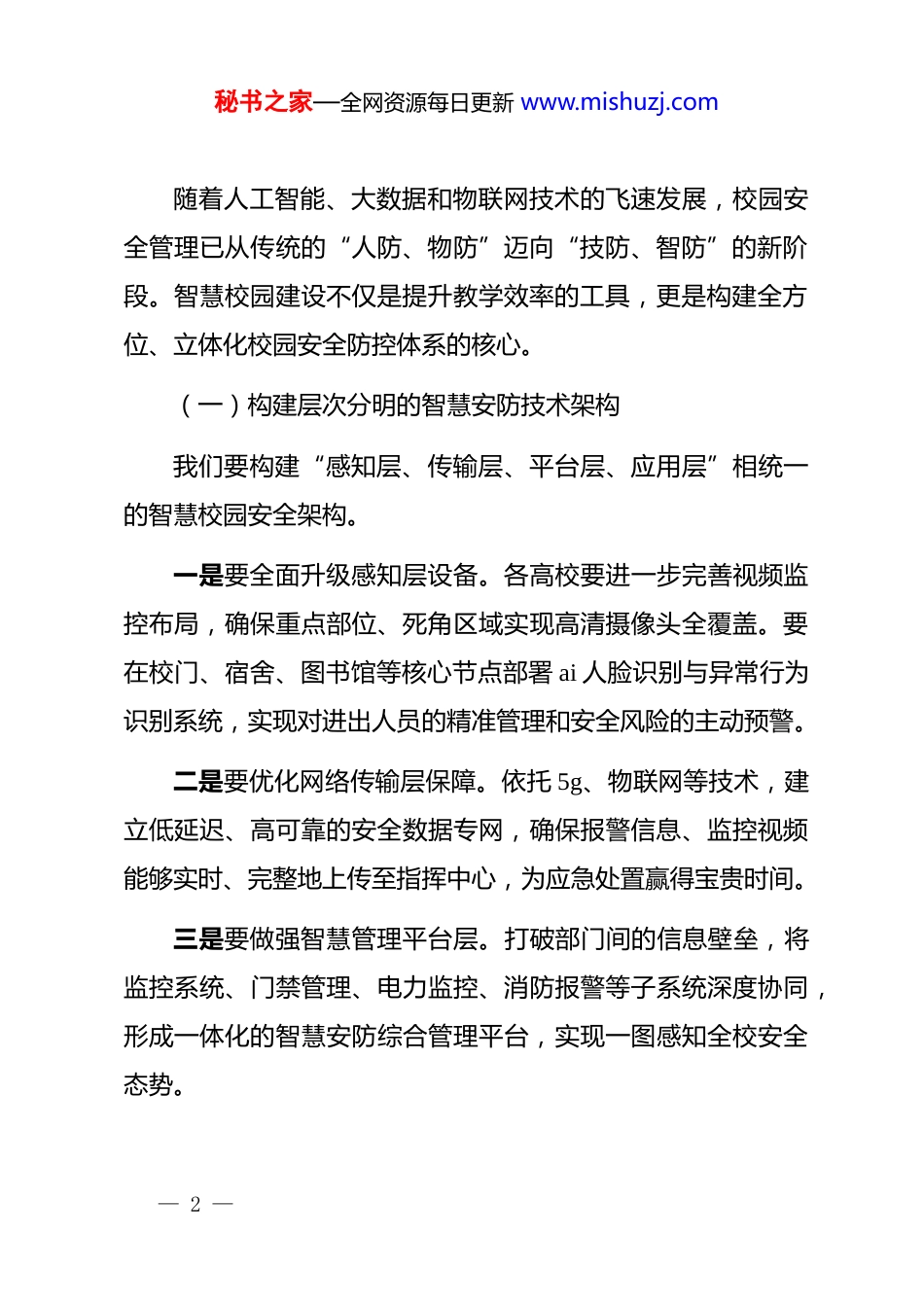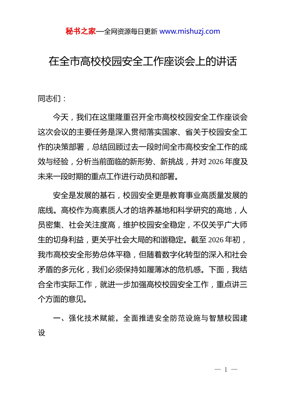 秘书之家—全网资源每日更新 www.mishuzj.com在全市高校校园安全工作座谈会上的讲话同志们:今天,我们在这里隆重召开全市高校校园安全工作座谈会这次会议的主要任务是深入贯彻落实国家、省关于校园安全工作的决策部署,总结回顾过去一段时间全市高校安全工作的成效与经验,分析当前面临的新形势、新挑战,并对 2026 年度及未来一段时期的重点工作进行动员和部署。安全是发展的基石,校园安全更是教育事业高质量发展的底线。高校作为高素质人才的培养基地和科学研究的高地,人员密集、社会关注度高,维护校园安全稳定,不仅关乎广大师生的切身利益,更关乎社会大局的和谐稳定。截至 2026 年初,我市高校安全形势总体平稳,但随着数字化转型的深入和社会矛盾的多元化,我们必须保持如履薄冰的危机感。下面,我结合全市实际工作,就进一步加强高校校园安全工作,重点讲三个方面的意见。一、强化技术赋能,全面推进安全防范设施与智慧校园建设— 1 —秘书之家—全网资源每日更新 www.mishuzj.com随着人工智能、大数据和物联网技术的飞速发展,校园安全管理已从传统的“人防、物防”迈向“技防、智防”的新阶段。智慧校园建设不仅是提升教学效率的工具,更是构建全方位、立体化校园安全防控体系的核心。(一)构建层次分明的智慧安防技术架构我们要构建“感知层、传输层、平台层、应用层”相统一的智慧校园安全架构。一是要全面升级感知层设备。各高校要进一步完善视频监控布局,确保重点部位、死角区域实现高清摄像头全覆盖。要在校门、宿舍、图书馆等核心节点部署 ai 人脸识别与异常行为识别系统,实现对进出人员的精准管理和安全风险的主动预警。二是要优化网络传输层保障。依托 5g、物联网等技术,建立低延迟、高可靠的安全数据专网,确保报警信息、监控视频能够实时、完整地上传至指挥中心,为应急处置赢得宝贵时间。三是要做强智慧管理平台层。打破部门间的信息壁垒,将监控系统、门禁管理、电力监控、消防报警等子系统深度协同,形成一体化的智慧安防综合管理平台,实现一图感知全校安全态势。— 2 —秘书之家—全网资源每日更新 www.mishuzj.com(二)提升基础设施的覆盖率与集成应用水平根据我市 2025-2026 年度的建设目标,全市高校智慧校园覆盖率需达到较高水平,各单位要严格对照指标进行自查补短。一是要落实硬件设施的物理覆盖。我们要持续加大投入,确保校内重点区域视频监控全覆盖率达到 100%,一键报警装置配备率达到 100%。**大学在前期试点中通过部署全高清监控系统,有效降低了校园发案率,这一经验值得全市推广。二是要推进“数字孪生”校园应用。利用数字孪生技术对校园物理环境进行 1:1 还原,在虚拟空间中进行应急演练预案模拟,提高对火灾、突发事故等事件的响应和处置效能。三是要加强移动化安全管理。推广使用“融校园”等 app平台,让保安员、宿管员能够通过手持终端进行智慧巡更,发现隐患实时上传,形成闭环管理流程。(三)完善绩效评价与经费投入保障机制智慧校园建设是一项系统工程,必须有稳定的资金支持和科学的评价体系。一是要科学编制投资预算。根据最新的调研数据,单校在智慧安防系统方面的投入应结合规模合理配置,确保资金向基— 3 —秘书之家—全网资源每日更新 www.mishuzj.com础设施补短板和核心算法升级倾斜。二是要建立量化的绩效考核指标。我们要将智慧校园建设成效纳入高校年度安全目标责任制评价。考核指标应涵盖资金有效使用率、项目进度完成情况、师生对安全设施的满意度等多个维度。三是要强化数据安全与隐私保护。在享受数字化便利的同时,各高校必须建立严格的数据分级分类保护制度,防止师生人脸信息、位置轨迹等敏感数据外泄。二、坚持源头治理,深化校园矛盾纠纷排查化解机制当前,高校师生面临的学业、就业、生活压力交织,矛盾纠纷呈现复杂化、隐蔽化的趋势。我们必须坚持和发展新时代“枫桥经验”,构建多元化解、协同治理的工作格局。(一)建立常态化的矛盾纠纷排查预警体系防范胜于救灾,排查是化解的前提。一是要实施动态排查。各高校要建立“校、院、班”三级排查网络,通过日常走访、问...