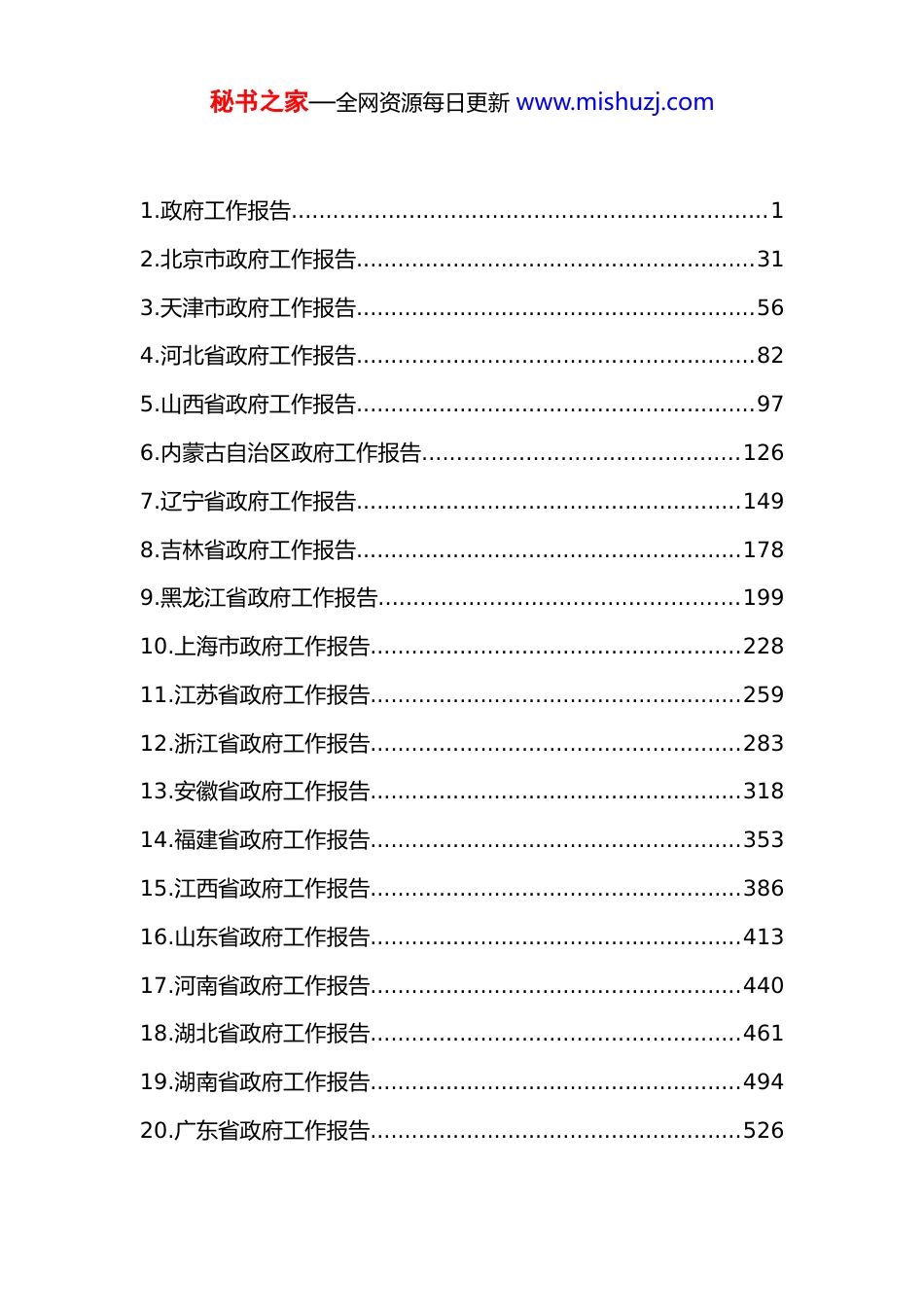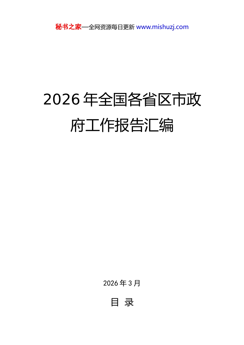 秘书之家—全网资源每日更新 www.mishuzj.com2026 年全国各省区市政府工作报告汇编 2026 年 3 月目 录秘书之家—全网资源每日更新 www.mishuzj.com1.政府工作报告.....................................................................12.北京市政府工作报告..........................................................313.天津市政府工作报告..........................................................564.河北省政府工作报告..........................................................825.山西省政府工作报告..........................................................976.内蒙古自治区政府工作报告..............................................1267.辽宁省政府工作报告........................................................1498.吉林省政府工作报告........................................................1789.黑龙江省政府工作报告....................................................19910.上海市政府工作报告......................................................22811.江苏省政府工作报告......................................................25912.浙江省政府工作报告......................................................28313.安徽省政府工作报告......................................................31814.福建省政府工作报告......................................................35315.江西省政府工作报告......................................................38616.山东省政府工作报告......................................................41317.河南省政府工作报告......................................................44018.湖北省政府工作报告......................................................46119.湖南省政府工作报告......................................................49420.广东省政府工作报告......................................................526秘书之家—全网资源每日更新 www.mishuzj.com21.广西壮族自治区政府工作报告.........................................56822.海南省政府工作报告......................................................59623.重庆市政府工作报告......................................................63224.四川省政府工作报告......................................................66825.贵州省政府工作报告......................................................70326.云南省政府工作报告......................................................73727.西藏自治区政府工作报告...............................................76628.陕西省政府工作报告......................................................78529.甘肃省政府工作报告......................................................80930.青海省政府工作报告......................................................83831.宁夏回族自治区政府工作报告.........................................86632.新疆维吾尔自治区政府工作报告......................................900秘书之家—全网资源每日更新 www.mishuzj.com1.政府工作报告——2026 年 3 月 5 日在第十四届全国人民代表大会第四次会议上国务院总理 李强各位代表:现在,我代表国务院,向大会作政府工作报告,请予审议,并请全国政协委员提出意见。一、2025 年工作回顾2025 年是很不平凡的一年。党的二十届四中全会胜利召开,擘画了未来五年我国发展的宏伟蓝图。我们隆重纪念中国人民抗日战争暨世界反法西斯战争胜利 80 周年,设立台湾光复纪念日,极大振奋民族精神、激发爱国热情、凝聚奋斗力量。面对国内外形势深刻复杂的变化,以习近平同志为核心的党中央团结带领全国各族人民迎难而上、奋力拼搏,坚定不移贯彻新发展理念、推动高质量发展,统筹国内国际两个大局,全年经济社会发展主要目标任务顺利完...
