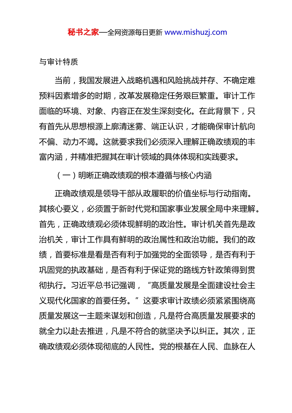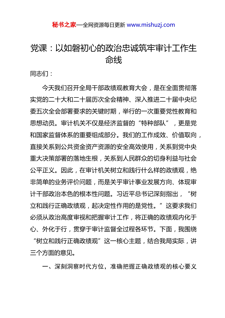 秘书之家—全网资源每日更新 www.mishuzj.com党课:以如磐初心的政治忠诚筑牢审计工作生命线同志们:今天我们召开全局干部政绩观教育大会,是在全面贯彻落实党的二十大和二十届历次全会精神、深入推进二十届中央纪委五次全会部署要求的关键时期,举行的一次重要党性教育和思想动员。审计机关不仅是经济监督的“特种部队”,更是党和国家监督体系的重要组成部分。我们的工作成效、价值取向,直接关系到公共资金资产资源的安全高效使用,关系到党中央重大决策部署的落地生根,关系到人民群众的切身利益与社会公平正义。因此,在审计机关树立和践行什么样的政绩观,绝非简单的业务评价问题,而是关乎审计事业发展方向、体现审计干部政治本色的根本性问题。习近平总书记深刻指出,“树立和践行正确政绩观,起决定性作用的是党性。”这要求我们必须从政治高度审视和把握审计工作,将正确的政绩观内化于心、外化于行,贯穿于审计监督全过程各环节。下面,我围绕“树立和践行正确政绩观”这一核心主题,结合我局实际,讲三个方面的意见。一、深刻洞察时代方位,准确把握正确政绩观的核心要义秘书之家—全网资源每日更新 www.mishuzj.com与审计特质当前,我国发展进入战略机遇和风险挑战并存、不确定难预料因素增多的时期,改革发展稳定任务艰巨繁重。审计工作面临的环境、对象、内容正在发生深刻变化。在此背景下,只有首先从思想根源上廓清迷雾、端正认识,才能确保审计航向不偏、动力不竭。这就要求我们必须深入理解正确政绩观的丰富内涵,并精准把握其在审计领域的具体体现和实践要求。(一)明晰正确政绩观的根本遵循与核心内涵正确政绩观是领导干部从政履职的价值坐标与行动指南。其核心要义,必须置于新时代党和国家事业发展全局中来理解。首先,正确政绩观必须体现鲜明的政治性。审计机关首先是政治机关,审计工作具有鲜明的政治属性和政治功能。我们的政绩,首要标准是看是否有利于加强党的全面领导,是否有利于巩固党的执政基础,是否有利于保证党的路线方针政策得到贯彻执行。习近平总书记强调,“高质量发展是全面建设社会主义现代化国家的首要任务。”这要求审计政绩必须紧紧围绕高质量发展这一主题来谋划和创造,凡是符合高质量发展要求的就全力以赴去推进,凡是不符合的就坚决予以纠正。其次,正确政绩观必须体现彻底的人民性。党的根基在人民、血脉在人秘书之家—全网资源每日更新 www.mishuzj.com民、力量在人民。审计监督的威力来源于人民,最终目的是服务人民。我们的政绩,要体现在推动解决群众急难愁盼问题上,体现在促进民生政策落实、民生资金安全、民生项目效益上,体现在维护好、实现好、发展好最广大人民根本利益上。不能脱离群众需求搞“花架子”,不能为了所谓“亮点”损害群众利益。最后,正确政绩观必须体现科学的实践性。政绩的创造必须尊重客观规律,坚持实事求是。审计工作尤其要注重事实、注重证据、注重程序。我们的政绩,应当是基于扎实审计、依法审计、规范审计基础上取得的实绩,是经得起历史、实践和人民检验的硬核成果。要坚决反对为了追求短期效应而搞“数据审计”、“盆景工程”,更要杜绝弄虚作假、欺上瞒下。只有深刻把握这些核心内涵,我们才能在纷繁复杂的审计实践中保持定力、明辨方向。(二)把握审计工作践行正确政绩观的实践维度审计工作践行正确政绩观,有其独特的职业要求和实践维度,必须紧密结合审计监督的职能定位来深化认识。其一,审计政绩体现在维护经济安全的“防火墙”作用上。财政金融、国有资产、公共资源等领域的安全,是国家安全的基石。审计政绩的一个重要维度,就是通过常态化的“经济体检”,及时秘书之家—全网资源每日更新 www.mishuzj.com揭示风险隐患,提出堵塞漏洞、完善制度的建议,有效防止“黑天鹅”、“灰犀牛”事件,筑牢经济安全屏障。这要求我们不仅要敢于揭示问题,更要善于预警风险,提升审计的前瞻性和建设性。其二,审计政绩体现在推动政策落实的“督察员”作用上。党中央的重大决策部署能否落地见效,关系发展全局。审计政绩体现在通过对政策执行全过程的跟踪审计,及时发现政策措施不适应、不衔...