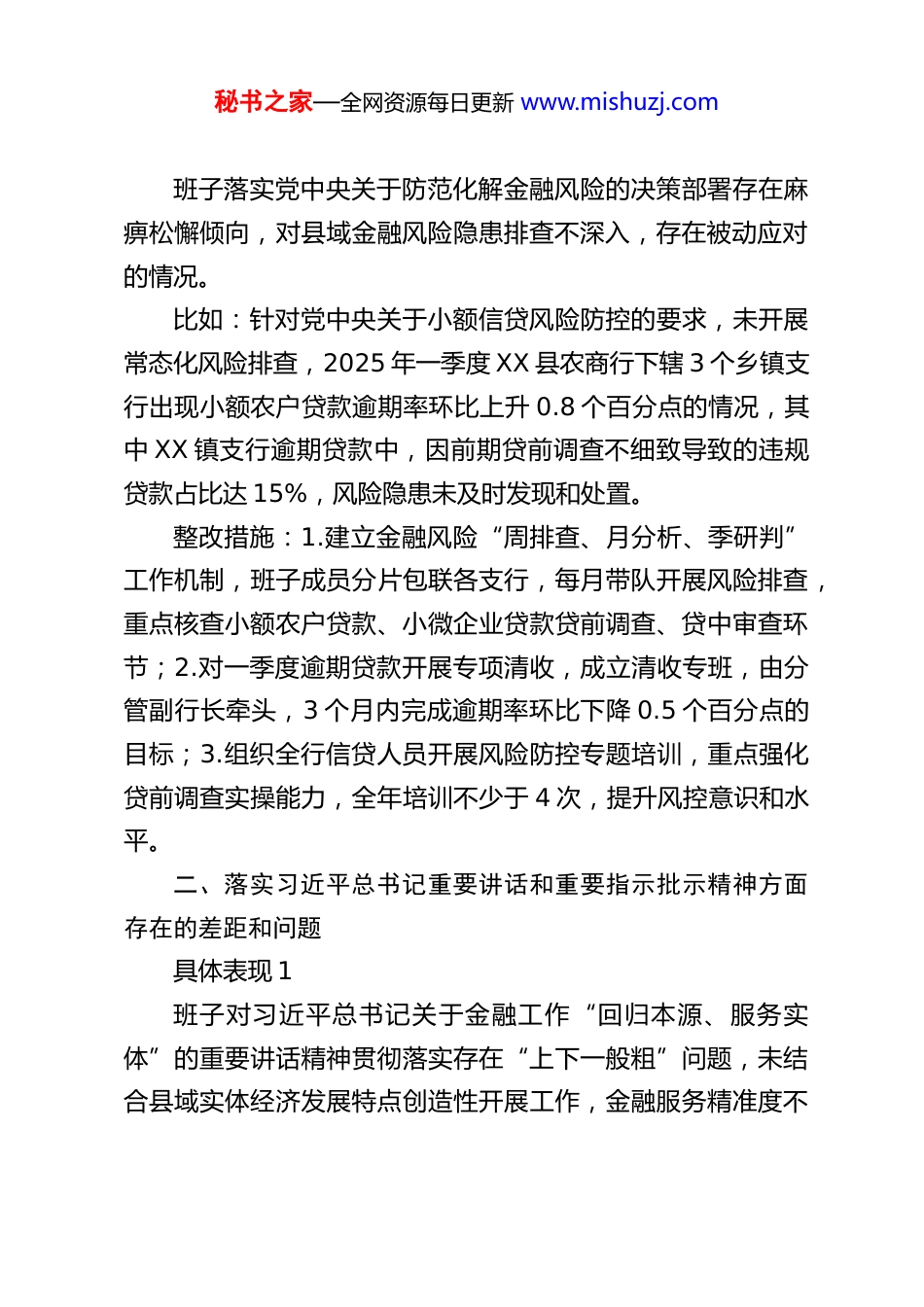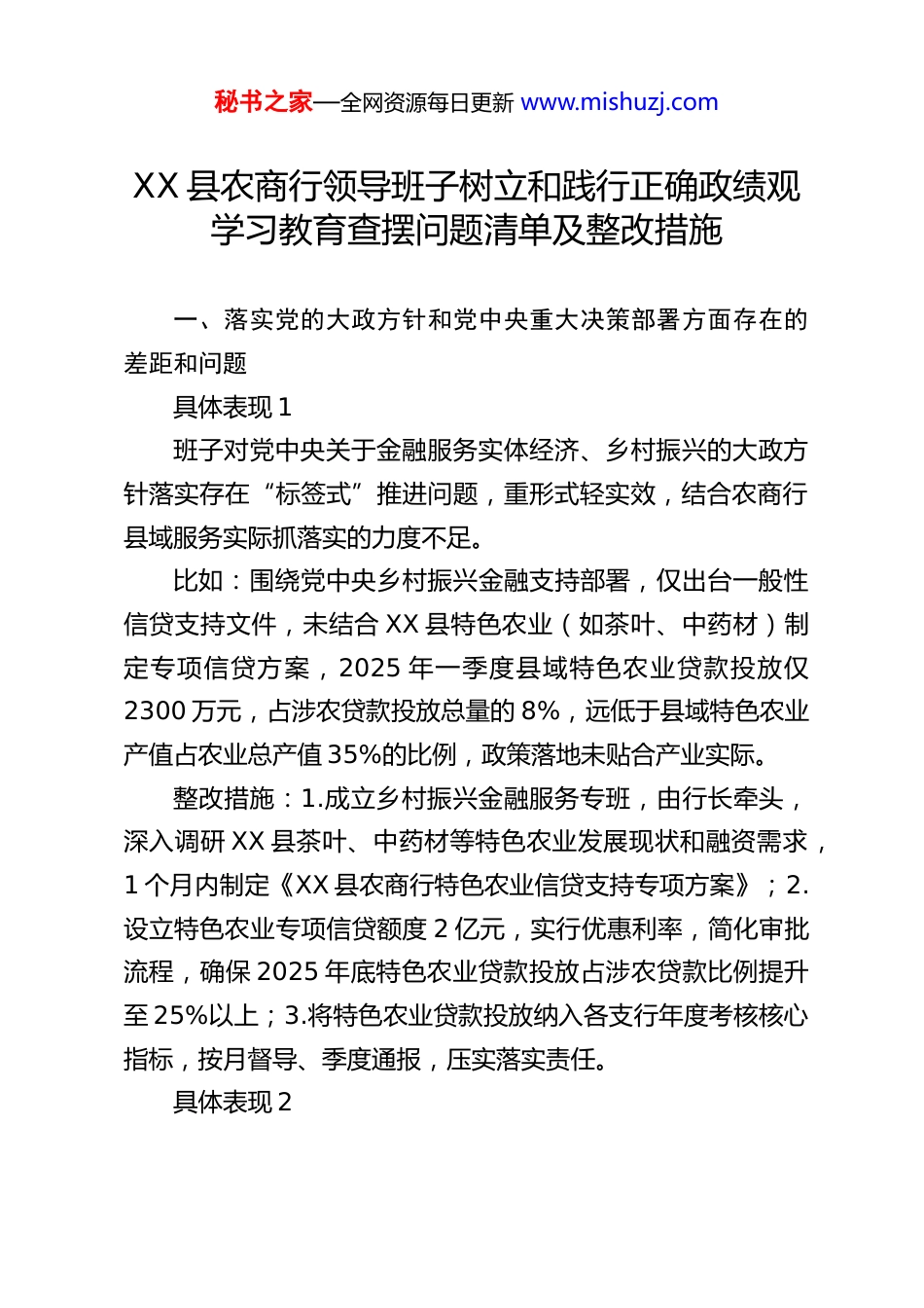 秘书之家—全网资源每日更新 www.mishuzj.comXX 县农商行领导班子树立和践行正确政绩观学习教育查摆问题清单及整改措施一、落实党的大政方针和党中央重大决策部署方面存在的差距和问题具体表现 1班子对党中央关于金融服务实体经济、乡村振兴的大政方针落实存在“标签式”推进问题,重形式轻实效,结合农商行县域服务实际抓落实的力度不足。比如:围绕党中央乡村振兴金融支持部署,仅出台一般性信贷支持文件,未结合 XX 县特色农业(如茶叶、中药材)制定专项信贷方案,2025 年一季度县域特色农业贷款投放仅2300 万元,占涉农贷款投放总量的 8%,远低于县域特色农业产值占农业总产值 35%的比例,政策落地未贴合产业实际。整改措施:1.成立乡村振兴金融服务专班,由行长牵头,深入调研 XX 县茶叶、中药材等特色农业发展现状和融资需求,1 个月内制定《XX 县农商行特色农业信贷支持专项方案》;2.设立特色农业专项信贷额度 2 亿元,实行优惠利率,简化审批流程,确保 2025 年底特色农业贷款投放占涉农贷款比例提升至 25%以上;3.将特色农业贷款投放纳入各支行年度考核核心指标,按月督导、季度通报,压实落实责任。具体表现 2秘书之家—全网资源每日更新 www.mishuzj.com班子落实党中央关于防范化解金融风险的决策部署存在麻痹松懈倾向,对县域金融风险隐患排查不深入,存在被动应对的情况。比如:针对党中央关于小额信贷风险防控的要求,未开展常态化风险排查,2025 年一季度 XX 县农商行下辖 3 个乡镇支行出现小额农户贷款逾期率环比上升 0.8 个百分点的情况,其中 XX 镇支行逾期贷款中,因前期贷前调查不细致导致的违规贷款占比达 15%,风险隐患未及时发现和处置。整改措施:1.建立金融风险“周排查、月分析、季研判”工作机制,班子成员分片包联各支行,每月带队开展风险排查,重点核查小额农户贷款、小微企业贷款贷前调查、贷中审查环节;2.对一季度逾期贷款开展专项清收,成立清收专班,由分管副行长牵头,3 个月内完成逾期率环比下降 0.5 个百分点的目标;3.组织全行信贷人员开展风险防控专题培训,重点强化贷前调查实操能力,全年培训不少于 4 次,提升风控意识和水平。二、落实习近平总书记重要讲话和重要指示批示精神方面存在的差距和问题具体表现 1班子对习近平总书记关于金融工作“回归本源、服务实体”的重要讲话精神贯彻落实存在“上下一般粗”问题,未结合县域实体经济发展特点创造性开展工作,金融服务精准度不秘书之家—全网资源每日更新 www.mishuzj.com足。比如:落实习近平总书记服务小微企业的重要指示批示精神,仅推出通用型小微企业信贷产品,未针对 XX 县小微企业以商贸流通、加工制造类为主的特点设计差异化产品,2025年一季度小微企业贷款中,信用贷款占比仅 12%,远低于全市农商行平均水平 20%,小微企业融资难、融资贵问题未得到有效缓解。整改措施:1.分类制定商贸流通、加工制造类小微企业信贷产品,推出“商贸贷”“加工贷”等差异化产品,提高信用贷款额度,将小微企业信用贷款占比提升至 20%以上;2.建立小微企业“白名单”制度,与县市场监管局、工信局联动,筛选优质小微企业,实行“一对一”金融服务,一季度完成首批50 家企业白名单筛选;3.降低小微企业融资成本,对符合条件的小微企业实行 LPR 下浮 10 个基点的优惠利率,取消小微企业贷款相关附加费用。具体表现 2班子对习近平总书记关于乡村振兴的重要指示批示精神学习领会不深,在推动金融服务乡村振兴与县域基层治理结合方面谋划不足,工作推进缺乏系统性。比如:落实习近平总书记关于巩固拓展脱贫攻坚成果同乡村振兴有效衔接的指示批示,未与 XX 县各村委建立联动服务机制,下辖 XX 乡支行仅在春节期间开展 1 次金融知识下乡活秘书之家—全网资源每日更新 www.mishuzj.com动,脱贫户信贷回访率仅 60%,部分脱贫户的产业发展融资需求未及时响应,2025 年一季度脱贫户贷款投放较去年同期下降 5%。整改措施:1.与全县各村委签订金融服务乡村振兴联动协议,建立“支行+村委”常态化服务机制,每个支行每月至少开展 2 次金融下乡...