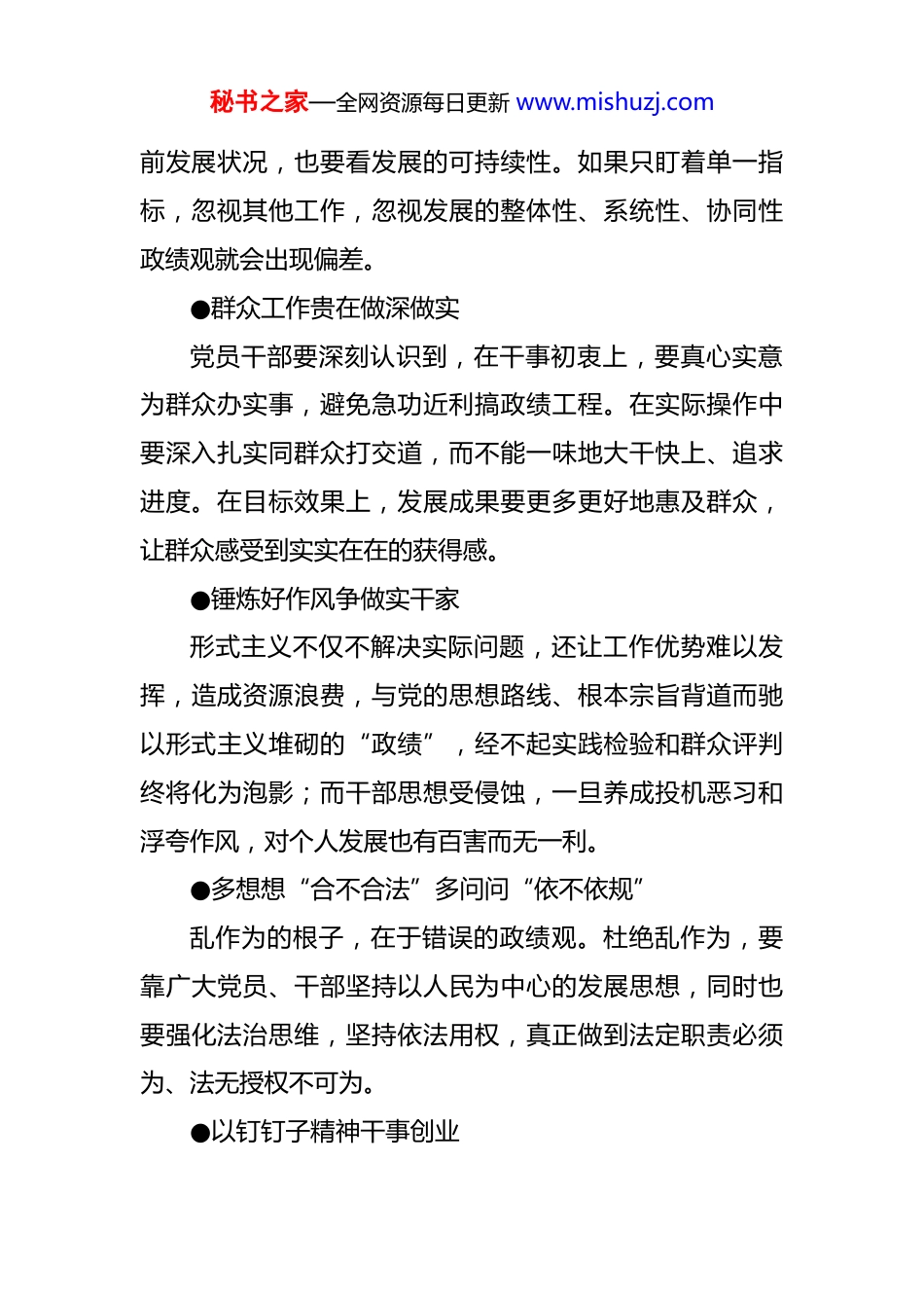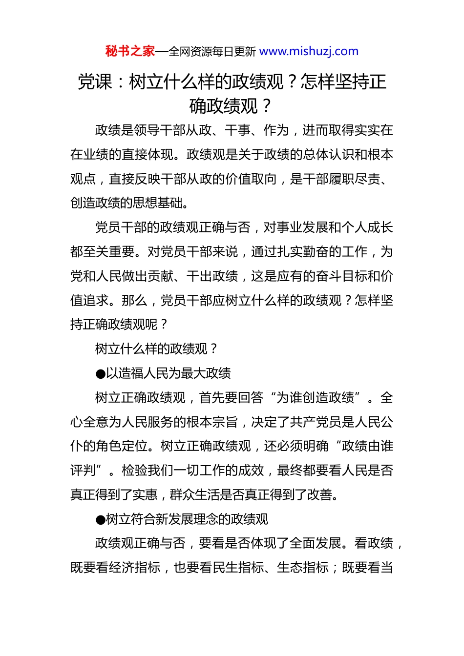 秘书之家—全网资源每日更新 www.mishuzj.com党课:树立什么样的政绩观?怎样坚持正确政绩观?政绩是领导干部从政、干事、作为,进而取得实实在在业绩的直接体现。政绩观是关于政绩的总体认识和根本观点,直接反映干部从政的价值取向,是干部履职尽责、创造政绩的思想基础。党员干部的政绩观正确与否,对事业发展和个人成长都至关重要。对党员干部来说,通过扎实勤奋的工作,为党和人民做出贡献、干出政绩,这是应有的奋斗目标和价值追求。那么,党员干部应树立什么样的政绩观?怎样坚持正确政绩观呢?树立什么样的政绩观?●以造福人民为最大政绩树立正确政绩观,首先要回答“为谁创造政绩”。全心全意为人民服务的根本宗旨,决定了共产党员是人民公仆的角色定位。树立正确政绩观,还必须明确“政绩由谁评判”。检验我们一切工作的成效,最终都要看人民是否真正得到了实惠,群众生活是否真正得到了改善。●树立符合新发展理念的政绩观政绩观正确与否,要看是否体现了全面发展。看政绩,既要看经济指标,也要看民生指标、生态指标;既要看当秘书之家—全网资源每日更新 www.mishuzj.com前发展状况,也要看发展的可持续性。如果只盯着单一指标,忽视其他工作,忽视发展的整体性、系统性、协同性政绩观就会出现偏差。●群众工作贵在做深做实党员干部要深刻认识到,在干事初衷上,要真心实意为群众办实事,避免急功近利搞政绩工程。在实际操作中要深入扎实同群众打交道,而不能一味地大干快上、追求进度。在目标效果上,发展成果要更多更好地惠及群众,让群众感受到实实在在的获得感。●锤炼好作风争做实干家形式主义不仅不解决实际问题,还让工作优势难以发挥,造成资源浪费,与党的思想路线、根本宗旨背道而驰以形式主义堆砌的“政绩”,经不起实践检验和群众评判终将化为泡影;而干部思想受侵蚀,一旦养成投机恶习和浮夸作风,对个人发展也有百害而无一利。●多想想“合不合法”多问问“依不依规”乱作为的根子,在于错误的政绩观。杜绝乱作为,要靠广大党员、干部坚持以人民为中心的发展思想,同时也要强化法治思维,坚持依法用权,真正做到法定职责必须为、法无授权不可为。●以钉钉子精神干事创业秘书之家—全网资源每日更新 www.mishuzj.com牢固树立正确的政绩观,既要做让老百姓看得见、摸得着、得实惠的实事,也要做为后人作铺垫、打基础、利长远的好事;既要做显功,也要做潜功,不计较个人功名努力对历史负责、对人民负责。怎样坚持正确政绩观?现在,党团结带领中国人民踏上了实现第二个百年奋斗目标新的赶考之路,前进道路上的风险挑战异常复杂严峻,广大党员干部唯有悟透以人民为中心的发展思想,努力把为民造福的政绩观贯穿在干事创业里,不断展现新气象新作为,才能不负韶华、不负时代。●加强学习,开拓眼界,增长本领,不断提高自己的治理能力和治理水平。悟透以人民为中心的发展思想,善于把握规律,因时因地制宜,坚持守正创新,为实现人民对美好生活的向往而慎重决策用权。●坚持系统思维,正确处理“大我”和“小我”的关系,正确处理长远利益、整体利益和短期利益、局部利益的关系。发扬钉钉子精神,稳扎稳打向前走,过了一山再登一峰,跨过一沟再越一壑,积跬步以至千里,多做打基础、利长远的事。●提高依法决策能力,落实依法决策机制,在重大决策中,保证公众参与、专家论证、风险评估、合法性审查、秘书之家—全网资源每日更新 www.mishuzj.com集体讨论决定等法定程序,找准和回应群众关切,确保决策务实管用、切实可行。●坚持一切从实际出发,尽力而为、量力而行,合理规划、有序推进办事项目。在办事过程中,要求真务实、苦干实干,力戒形式主义、官僚主义,不搞劳民伤财的“形象工程”“政绩工程”,坚决纠正重“痕”不重“绩”、留“迹”不留“心”等错误做法。●把思想和行动都统一到新发展理念上来,完整、准确、全面学习贯彻新发展理念,弄清新发展理念所要求的政绩是什么样的,进而强化使命担当,找准发展路径。●提升“十个指头弹钢琴”的视野和能力,在基层一线多经历“风吹浪打”,多捧“烫手山芋”,多当几回“热锅上的蚂蚁”,练胆魄、...