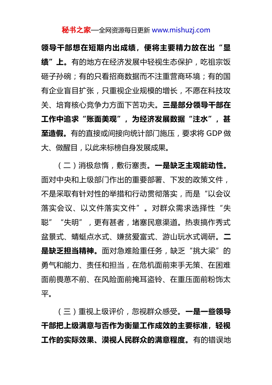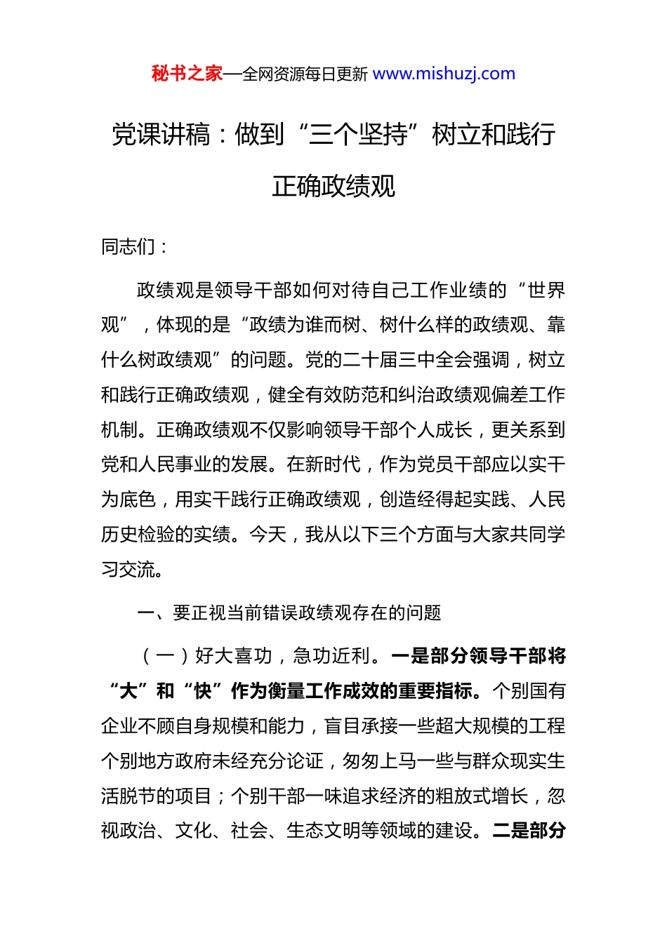 秘书之家—全网资源每日更新 www.mishuzj.com党课讲稿:做到“三个坚持”树立和践行正确政绩观同志们:政绩观是领导干部如何对待自己工作业绩的“世界观”,体现的是“政绩为谁而树、树什么样的政绩观、靠什么树政绩观”的问题。党的二十届三中全会强调,树立和践行正确政绩观,健全有效防范和纠治政绩观偏差工作机制。正确政绩观不仅影响领导干部个人成长,更关系到党和人民事业的发展。在新时代,作为党员干部应以实干为底色,用实干践行正确政绩观,创造经得起实践、人民历史检验的实绩。今天,我从以下三个方面与大家共同学习交流。一、要正视当前错误政绩观存在的问题(一)好大喜功,急功近利。一是部分领导干部将“大”和“快”作为衡量工作成效的重要指标。个别国有企业不顾自身规模和能力,盲目承接一些超大规模的工程个别地方政府未经充分论证,匆匆上马一些与群众现实生活脱节的项目;个别干部一味追求经济的粗放式增长,忽视政治、文化、社会、生态文明等领域的建设。二是部分秘书之家—全网资源每日更新 www.mishuzj.com领导干部想在短期内出成绩,便将主要精力放在出“显绩”上。有的地方在经济发展中轻视生态保护,吃祖宗饭砸子孙碗;有的只看招商数据而不注重营商环境;有的国有企业盲目扩张,只重视企业规模的增长,不愿在科技攻关、培育核心竞争力方面下苦功夫。三是部分领导干部在工作中追求“账面美观”,为经济发展数据“注水”,甚至造假。有的直接或间接向统计部门施压,要求将 GDP 做大、做醒目,以此来标榜自身发展成果。(二)消极怠惰,敷衍塞责。一是缺乏主观能动性。面对中央和上级部门作出的重要部署、下发的政策文件,不是采取有针对性的举措和行动贯彻落实,而是“以会议落实会议、以文件落实文件”。对群众需求选择性“失聪”“失明”,更有甚者,堵塞民意渠道。热衷搞作秀式盆景式、蜻蜓点水式、嫌贫爱富式、游山玩水式调研。二是缺乏担当精神。面对急难险重任务,缺乏“挑大梁”的勇气和能力、责任和担当,在危机面前束手无策、在困难面前畏葸不前、在风险面前掩耳盗铃、在重压面前粉饰太平。(三)重视上级评价,忽视群众感受。一是一些领导干部把上级满意与否作为衡量工作成效的主要标准,轻视工作的实际效果、漠视人民群众的满意程度。有的错误地秘书之家—全网资源每日更新 www.mishuzj.com认为,政绩是做给上级看的,只有上级认可的,才是政绩持此类观点的人,在追求政绩的过程中,往往不是把劲使在为广大群众办实事、谋实利上,而是两眼朝上看,上级不说的不做,上级不表态的不敢干,唯上不唯实。二是有的领导干部认为“有位就是有为”,政绩的最终表现,在于自己能否受到提拔重用。更有甚者认为,政绩是说出来的,不是干出来的。即政绩有没有、是大是小,完全取决于上级的评价和同级的评说。持此类观点者,在追求自己所谓的政绩时,很难把精力放在踏实干事上,而是谋求上级领导的“重视”和同级同事的“赞赏”上。二、要科学把握正确政绩观的基本内涵(一)为民是正确政绩观的核心要求。不断为人民造福,是正确政绩观的出发点和第一位要求。习近平总书记深刻指出,“江山就是人民、人民就是江山,打江山、守江山,守的是人民的心”。党员干部特别是领导干部要清醒认识到,自己手中的权力、所处的岗位,是党和人民赋予的,是为党和人民做事用的,政绩的出发点必须是造福人民、造福社会,而不能把政绩当作升官的工具。要把为人民谋利益、为人民创造政绩作为终身追求,把政绩树在人民的心坎上。要着眼新时代人民日益增长的美好生活需要和不平衡不充分的发展之间的矛盾,紧紧扭住高质量发秘书之家—全网资源每日更新 www.mishuzj.com展这个全面建设社会主义现代化国家的首要任务,紧盯事关人民群众切身利益的问题及其根源,找准推动高质量发展的具体路径,用心用情解决人民群众牵挂的操心事、烦心事、揪心事,切实把人民的利益摆在至高无上地位,不断满足人民对美好生活的需求,增强人民群众的获得感、幸福感、安全感。(二)求实是正确政绩观的重要内容。干工作贵在落实、重在落实,也难在落实;业绩都是干出来的,真干才能真出业绩...