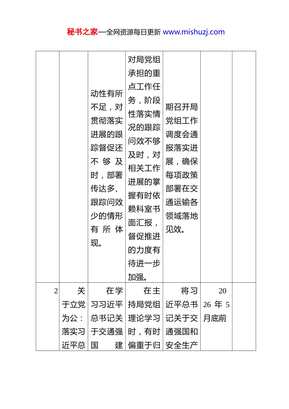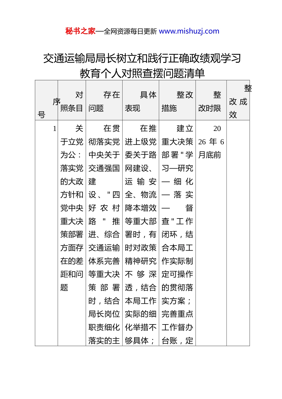 秘书之家—全网资源每日更新 www.mishuzj.com交通运输局局长树立和践行正确政绩观学习教育个人对照查摆问题清单 序号对照条目存 在问题具 体表现整 改措施整改时限整改 成效1关于立党为公:落实党的大政方针和党中央重大决策部署方面存在的差距和问题在 贯彻落实党中央关于交通强国建设 、 " 四好 农 村路"推进、综合交通运输体系完善等重大决策 部 署时,结合局长岗位职责细化落实的主在 推进上级党委关于路网建设、运 输 安全、物流降本增效等重大部署时,有时对政策精神研究不 够 深透,结合本局工作实际的细化举措不够具体;建 立重大决策部 署 " 学习—研究— 细 化— 落 实—督查 " 工 作闭环,结合本局工作实际制定可操作的贯彻落实方案;完善重点工作督办台账,定2026 年 6月底前秘书之家—全网资源每日更新 www.mishuzj.com动性有所不足,对贯彻落实进展的跟踪督促还不 够 及时,部署传达多、跟踪问效少的情形有 所 体现。对局党组承担的重点工作任务,阶段性落实情况的跟踪问效不够及时,对相关工作进展的掌握有时依赖科室书面汇报,督促推进的力度有待进一步加强。期召开局党组工作调度会通报落实进展,确保每项政策部署在交通运输各领域落地见效。2关于立党为公:落实习近平总在 学习习近平总书记关于交通强国建在 主持局党组理论学习时,有时偏重于归将 习近平总书记关于交通强国和安全生产2026 年 5月底前秘书之家—全网资源每日更新 www.mishuzj.com书记重要讲话和重要指示批示精神方面存在的差距和问题设 、 " 人民交通为人 民 " 、安全生产等重要论述方面,学习的系统性和深度有所不足,将学习成果转化为推动交通运输工作具体举措的自觉性有待加强,学用转化的实效有待提升。纳梳理原文,结合局长岗位职责和本地交通运输实际深入研讨的力度还不够;习近平总书记关于交通强国、安全生产、服务民生的最新重要论述,转化为本局路网建设、运输监管、行业服务具体举措的重要论述列为个人重点自学内容,每次学习后撰写结合本地交通运输实际的学习体会;在谋划推进重点 工 作前,带头组织学习相关重要论述,推动理论学习成果在各项交通运输工作中具体落实;加强秘书之家—全网资源每日更新 www.mishuzj.com主动性不足,学用转化的实效有待加强。对局党组成员和各科室主要负责人学习教育的督 促 指导。3关于立党为公:树立 " 全国一盘棋 " 思想、服务服从大局方面存在的差距和问题在 统筹本地交通运输发展与上级主管部门整体工作大局关系上,主动服务服从大局的意识有时不够强,在推进跨部门、跨区域交通协在 推进上级统一部署的路 网 建设、运输安全专项整治等重点 工 作时,有时更多关注本地自身利益的维护,对如何通过本地交通运加 强大局意识教育,将本地交通运输发展与区域综合交通大局紧密结合;主动加强与上级交通主管部门和周边县市交通部门的对接联2026 年 6月底前秘书之家—全网资源每日更新 www.mishuzj.com调联动工作中合力还有提升空间,就本局本位看问题的局限性在个别工作中有所体现。输发展服务区域整体大局的主动谋划不够;在配合上级交通主管部门开展专项工作时,主动对接的积极性有时不足;在处理涉及区域路网互 联 互通、跨区域运输协调等事项时,全局视野有待进一步拓系,积极融入区域综合交通整体工作格局;定期研究本局工作与区域交通发展大局的 结 合点,强化服务大局的主动性和 自 觉性。秘书之家—全网资源每日更新 www.mishuzj.com展,主动补位意识有 待 加强。4关于立党为公:对照岗位职责履职方面存在的差距和问题作 为交通运输局局长,在统筹推进路网建设、运输安 全 监管、行业服务保障等各项职责方面,日常督促和指导还不 够 到位,在推进重点工作时系统谋划的深有 时对各科室和下属单位工作推进情况的跟踪了解不 够 及时,对路网建设、安全监管等领域存在的薄弱环节发现不够早;在统筹推进工程建设管理、道路运输完 善局长岗位职 责 清单,对照职责逐项查 缺 补漏;建立局党组工作定期调度机制,加强对各科室和下属单位工作落实情况的日常...