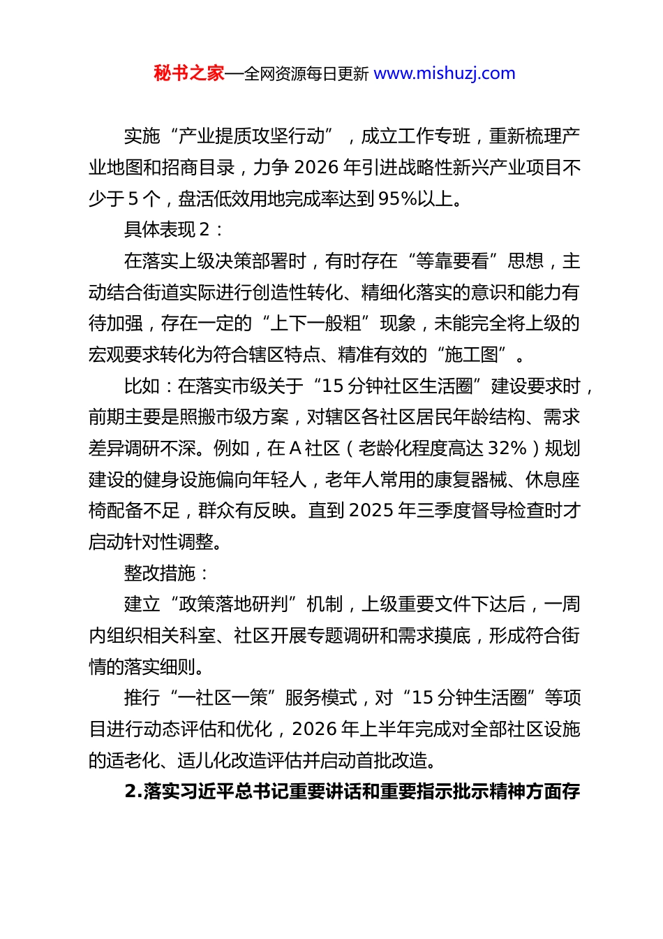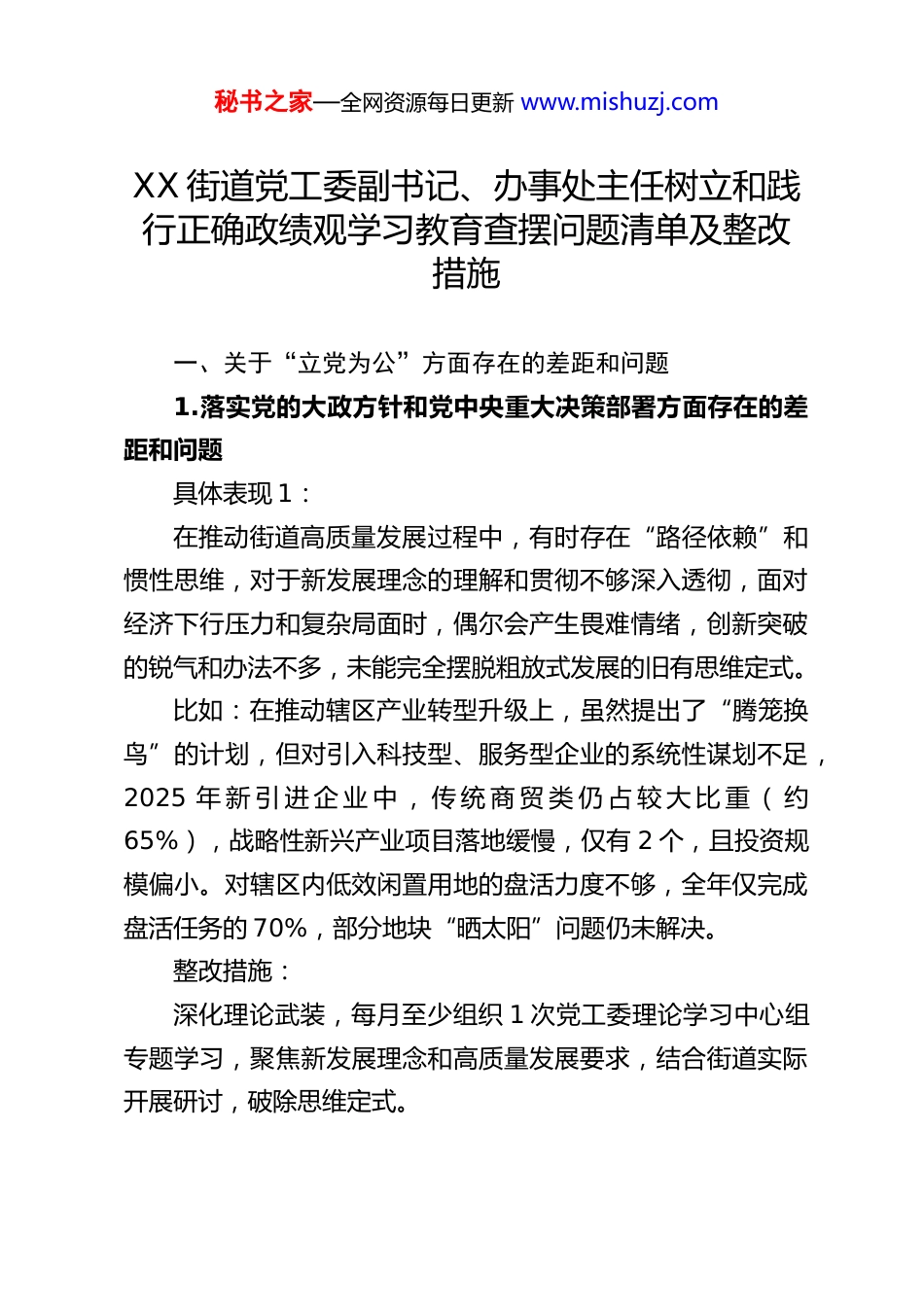 秘书之家—全网资源每日更新 www.mishuzj.comXX 街道党工委副书记、办事处主任树立和践行正确政绩观学习教育查摆问题清单及整改措施一、关于“立党为公”方面存在的差距和问题1.落实党的大政方针和党中央重大决策部署方面存在的差距和问题具体表现 1:在推动街道高质量发展过程中,有时存在“路径依赖”和惯性思维,对于新发展理念的理解和贯彻不够深入透彻,面对经济下行压力和复杂局面时,偶尔会产生畏难情绪,创新突破的锐气和办法不多,未能完全摆脱粗放式发展的旧有思维定式。比如:在推动辖区产业转型升级上,虽然提出了“腾笼换鸟”的计划,但对引入科技型、服务型企业的系统性谋划不足,2025 年 新 引 进 企 业 中 , 传 统 商 贸 类 仍 占 较 大 比 重 ( 约65%),战略性新兴产业项目落地缓慢,仅有 2 个,且投资规模偏小。对辖区内低效闲置用地的盘活力度不够,全年仅完成盘活任务的 70%,部分地块“晒太阳”问题仍未解决。整改措施:深化理论武装,每月至少组织 1 次党工委理论学习中心组专题学习,聚焦新发展理念和高质量发展要求,结合街道实际开展研讨,破除思维定式。秘书之家—全网资源每日更新 www.mishuzj.com实施“产业提质攻坚行动”,成立工作专班,重新梳理产业地图和招商目录,力争 2026 年引进战略性新兴产业项目不少于 5 个,盘活低效用地完成率达到 95%以上。具体表现 2:在落实上级决策部署时,有时存在“等靠要看”思想,主动结合街道实际进行创造性转化、精细化落实的意识和能力有待加强,存在一定的“上下一般粗”现象,未能完全将上级的宏观要求转化为符合辖区特点、精准有效的“施工图”。比如:在落实市级关于“15 分钟社区生活圈”建设要求时,前期主要是照搬市级方案,对辖区各社区居民年龄结构、需求差异调研不深。例如,在 A 社区(老龄化程度高达 32%)规划建设的健身设施偏向年轻人,老年人常用的康复器械、休息座椅配备不足,群众有反映。直到 2025 年三季度督导检查时才启动针对性调整。整改措施:建立“政策落地研判”机制,上级重要文件下达后,一周内组织相关科室、社区开展专题调研和需求摸底,形成符合街情的落实细则。推行“一社区一策”服务模式,对“15 分钟生活圈”等项目进行动态评估和优化,2026 年上半年完成对全部社区设施的适老化、适儿化改造评估并启动首批改造。2.落实习近平总书记重要讲话和重要指示批示精神方面存秘书之家—全网资源每日更新 www.mishuzj.com在的差距和问题具体表现 1:对习近平总书记系列重要讲话,特别是关于基层治理、民生保障等方面的重要指示精神,虽然能够做到及时传达学习,但在融会贯通、指导实践上还存在差距,未能完全将指示精神内化为工作理念和行动自觉,有时学习停留在“读过了”“学过了”层面。比如:学习贯彻总书记关于“城市管理应该像绣花一样精细”的重要指示有差距。在背街小巷环境整治中,前期满足于完成“大面”清洁,对墙根角落、电线杆“牛皮癣”、共享单车乱停放等细节问题整治不彻底、不持久。2025 年第三方测评中,我街道在市容环境“细微处”失分率达 15%,暴露出精细化管理不到位。整改措施:建立“第一议题”学习督办制度,对总书记关于基层工作的重要指示,不仅学习传达,更要研究制定具体落实方案,明确责任科室和时限,并纳入督查。开展“城市绣花”专项行动,聚焦背街小巷、老旧小区等薄弱环节,制定精细化治理标准,2026 年力争将市容环境“细微处”问题发生率降低至 5%以下。具体表现 2:在推动重点工作时,对标对表习近平总书记相关重要论述秘书之家—全网资源每日更新 www.mishuzj.com进行校准纠偏的主动性不够强,存在“慢半拍”的情况,未能时刻以最高标准、最严要求审视自身工作,导致一些工作成效与总书记的期望、群众的要求有距离。比如:落实总书记关于“疫情要防住、经济要稳住、发展要安全”要求,在统筹发展和安全上存在薄弱环节。对辖区“九小场所”的安全隐患排查,存在“运动式”检查倾向,常态化监管机制不健全。2025 年,虽组织了 4 次集中排查,但全年仍发生小型火灾事故 3 起,均...