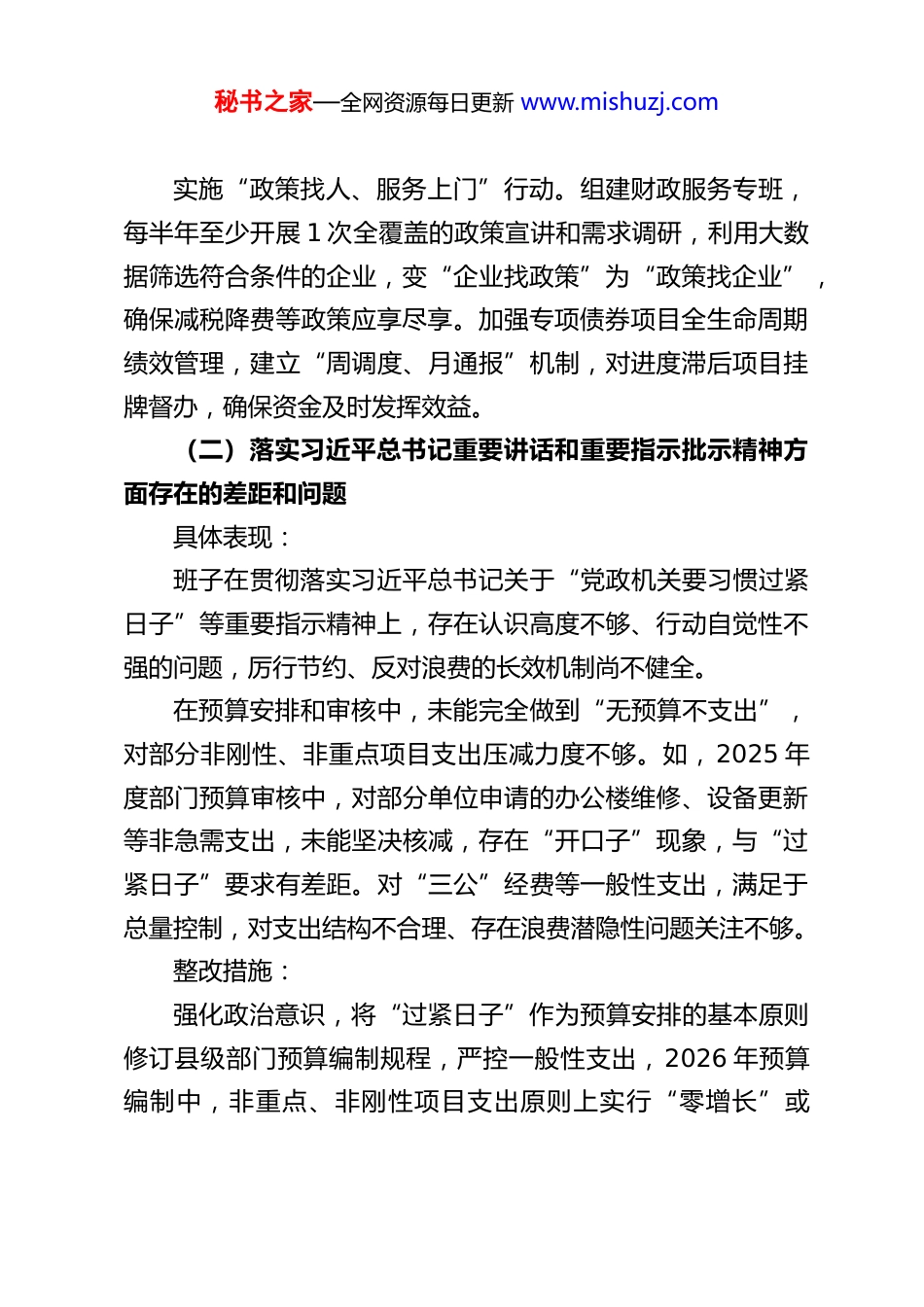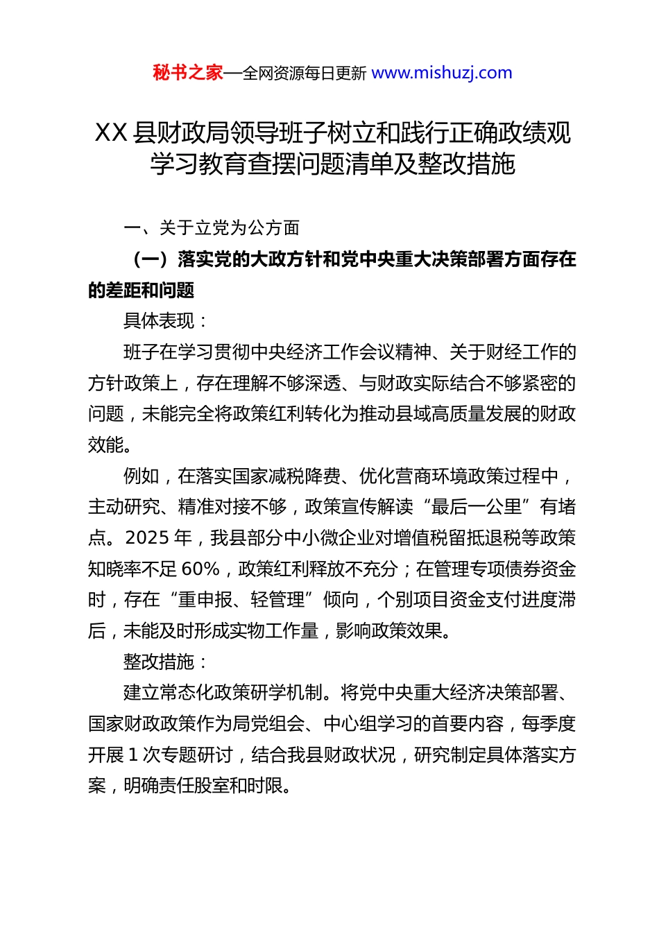 秘书之家—全网资源每日更新 www.mishuzj.comXX 县财政局领导班子树立和践行正确政绩观学习教育查摆问题清单及整改措施一、关于立党为公方面(一)落实党的大政方针和党中央重大决策部署方面存在的差距和问题具体表现:班子在学习贯彻中央经济工作会议精神、关于财经工作的方针政策上,存在理解不够深透、与财政实际结合不够紧密的问题,未能完全将政策红利转化为推动县域高质量发展的财政效能。例如,在落实国家减税降费、优化营商环境政策过程中,主动研究、精准对接不够,政策宣传解读“最后一公里”有堵点。2025 年,我县部分中小微企业对增值税留抵退税等政策知晓率不足 60%,政策红利释放不充分;在管理专项债券资金时,存在“重申报、轻管理”倾向,个别项目资金支付进度滞后,未能及时形成实物工作量,影响政策效果。整改措施:建立常态化政策研学机制。将党中央重大经济决策部署、国家财政政策作为局党组会、中心组学习的首要内容,每季度开展 1 次专题研讨,结合我县财政状况,研究制定具体落实方案,明确责任股室和时限。秘书之家—全网资源每日更新 www.mishuzj.com实施“政策找人、服务上门”行动。组建财政服务专班,每半年至少开展 1 次全覆盖的政策宣讲和需求调研,利用大数据筛选符合条件的企业,变“企业找政策”为“政策找企业”,确保减税降费等政策应享尽享。加强专项债券项目全生命周期绩效管理,建立“周调度、月通报”机制,对进度滞后项目挂牌督办,确保资金及时发挥效益。(二)落实习近平总书记重要讲话和重要指示批示精神方面存在的差距和问题具体表现:班子在贯彻落实习近平总书记关于“党政机关要习惯过紧日子”等重要指示精神上,存在认识高度不够、行动自觉性不强的问题,厉行节约、反对浪费的长效机制尚不健全。在预算安排和审核中,未能完全做到“无预算不支出”,对部分非刚性、非重点项目支出压减力度不够。如,2025 年度部门预算审核中,对部分单位申请的办公楼维修、设备更新等非急需支出,未能坚决核减,存在“开口子”现象,与“过紧日子”要求有差距。对“三公”经费等一般性支出,满足于总量控制,对支出结构不合理、存在浪费潜隐性问题关注不够。整改措施:强化政治意识,将“过紧日子”作为预算安排的基本原则修订县级部门预算编制规程,严控一般性支出,2026 年预算编制中,非重点、非刚性项目支出原则上实行“零增长”或秘书之家—全网资源每日更新 www.mishuzj.com“负增长”,对不必要的支出坚决不予安排。建立常态化监控和预警机制。依托预算管理一体化系统,对“三公”经费、会议费、培训费等实行动态监控,对支出异常、接近限额的单位及时预警并核查。每年开展 1 次全县范围的“落实过紧日子要求”专项检查,通报典型案例,形成震慑。(三)树立“全国一盘棋”思想、服务服从大局方面存在的差距和问题具体表现:班子有时存在一定的本位主义思想,在思考财政资源配置时,未能完全站在全县乃至全市、全省发展大局的高度进行统筹,对服务国家重大战略的财政保障前瞻性不足。在争取上级转移支付和专项资金时,有时更多考虑本部门工作便利和考核指标,对资金使用的整体社会效益和撬动作用谋划不深。例如,在分配乡村振兴衔接资金时,存在“撒胡椒面”现象,未能集中力量支持对全县农业产业发展具有关键带动作用的重点项目。在落实区域协同发展战略相关财政政策时,主动与周边区县财政对接协同机制建设滞后。整改措施:提高政治站位,自觉将财政工作置于发展大局中谋划。每年至少组织 2 次专题会议,研究财政如何更好服务国家重大战略和省市县重点工作,制定财政保障清单。优化财政资源配置机制。改革专项资金分配办法,推行秘书之家—全网资源每日更新 www.mishuzj.com“大专项+任务清单”模式,资金分配与项目绩效、对大局贡献度直接挂钩。建立跨区域财政协同会商机制,主动对接周边区县,在产业协同、生态补偿等领域探索财政合作路径。(四)对照岗位职责履职方面存在的差距和问题具体表现:班子在履行财政改革、管理、监督核心职责上,存在改革创新锐气不足、攻坚克难劲头减弱的问题,面对财政收支矛盾等压力,...