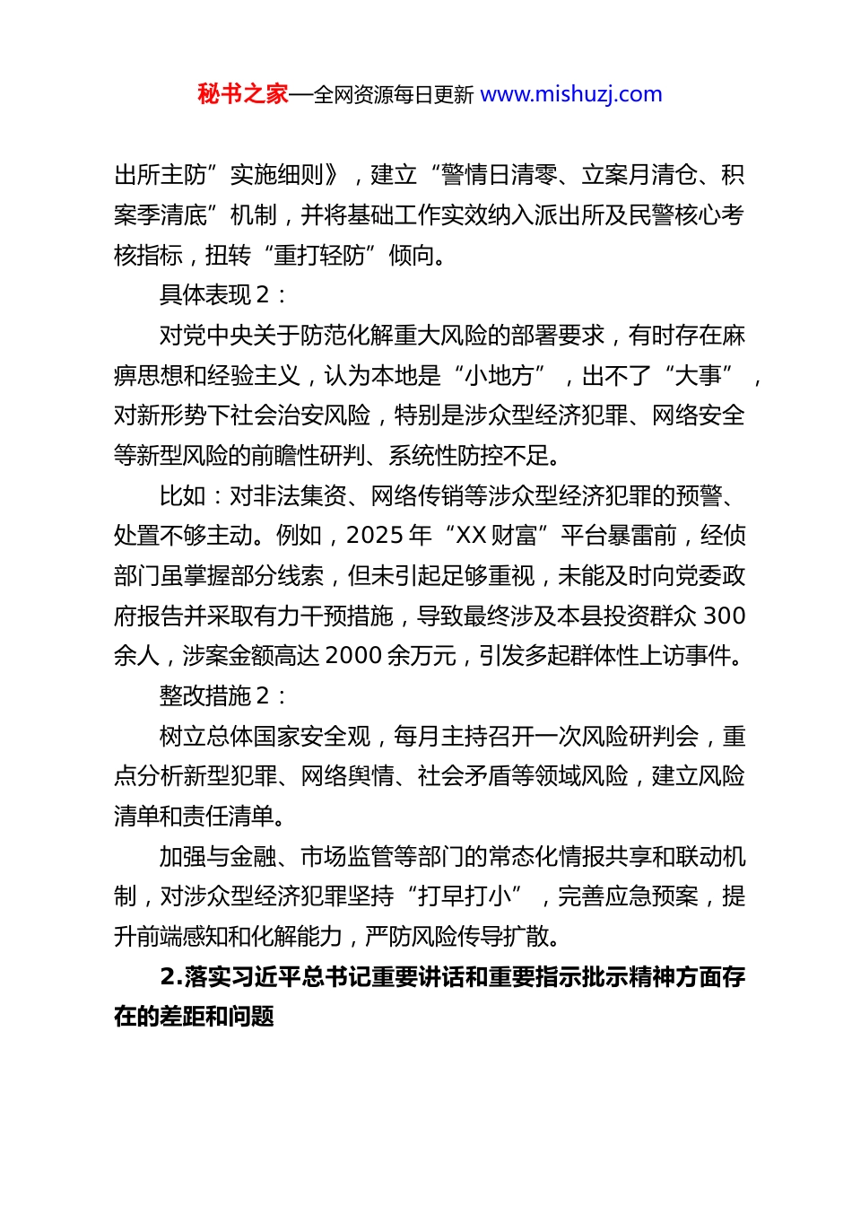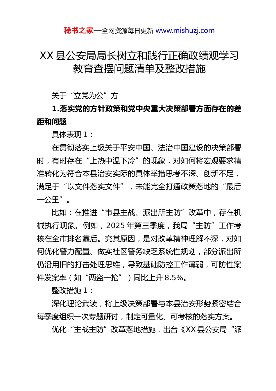 秘书之家—全网资源每日更新 www.mishuzj.comXX 县公安局局长树立和践行正确政绩观学习教育查摆问题清单及整改措施关于“立党为公”方1.落实党的方针政策和党中央重大决策部署方面存在的差距和问题具体表现 1:在贯彻落实上级关于平安中国、法治中国建设的决策部署时,有时存在“上热中温下冷”的现象,对如何将宏观要求精准转化为符合本县治安实际的具体举措思考不深、创新不足,满足于“以文件落实文件”,未能完全打通政策落地的“最后一公里”。比如:在推进“市县主战、派出所主防”改革中,存在机械执行现象。例如,2025 年第三季度,我局“主防”工作考核在全市排名靠后。究其原因,是对改革精神理解不深,对如何优化警力配置、做实社区警务缺乏系统性规划,部分派出所仍沿用旧的打击处理思维,导致基础防控工作薄弱,可防性案件发案率(如“两盗一抢”)同比上升 8.5%。整改措施 1:深化理论武装,将上级决策部署与本县治安形势紧密结合每季度组织一次专题研讨,制定可量化、可考核的落实方案。优化“主战主防”改革落地措施,出台《XX 县公安局“派秘书之家—全网资源每日更新 www.mishuzj.com出所主防”实施细则》,建立“警情日清零、立案月清仓、积案季清底”机制,并将基础工作实效纳入派出所及民警核心考核指标,扭转“重打轻防”倾向。具体表现 2:对党中央关于防范化解重大风险的部署要求,有时存在麻痹思想和经验主义,认为本地是“小地方”,出不了“大事”,对新形势下社会治安风险,特别是涉众型经济犯罪、网络安全等新型风险的前瞻性研判、系统性防控不足。比如:对非法集资、网络传销等涉众型经济犯罪的预警、处置不够主动。例如,2025 年“XX 财富”平台暴雷前,经侦部门虽掌握部分线索,但未引起足够重视,未能及时向党委政府报告并采取有力干预措施,导致最终涉及本县投资群众 300余人,涉案金额高达 2000 余万元,引发多起群体性上访事件。整改措施 2:树立总体国家安全观,每月主持召开一次风险研判会,重点分析新型犯罪、网络舆情、社会矛盾等领域风险,建立风险清单和责任清单。加强与金融、市场监管等部门的常态化情报共享和联动机制,对涉众型经济犯罪坚持“打早打小”,完善应急预案,提升前端感知和化解能力,严防风险传导扩散。2.落实习近平总书记重要讲话和重要指示批示精神方面存在的差距和问题秘书之家—全网资源每日更新 www.mishuzj.com具体表现 1:对习近平总书记关于“努力让人民群众在每一项法律制度每一个执法决定、每一宗司法案件中都感受到公平正义”的重要指示精神,理解不够透彻,有时在追求执法效率和打击数量的同时,对规范执法、保障人权的要求有所放松,存在“重实体、轻程序”的倾向。比如:个别案件办理中存在瑕疵。例如,在 2025 年办理的“李某盗窃案”中,因急于结案,对扣押物品的辨认程序存在瑕疵,后被检察机关在审查起诉阶段退回补充侦查,延长了办案周期,影响了执法公信力。整改措施 1:将习近平法治思想作为党委理论学习中心组和全警政治轮训的核心内容,每年组织两次以上执法规范化专题培训。全面应用执法办案管理中心,严格落实案件审核、监督制度,对因程序瑕疵导致执法问题的,实行责任倒查,纳入单位和个人绩效考核。具体表现 2:对“政治建警、改革强警、科技兴警、从严治警”新时代公安工作方针的落实,系统性、整体性不足,有时存在“单兵突进”情况,未能完全做到协同发力、一体推进,科技应用与警务实战的融合度有待提高。比如:“智慧公安”建设存在“重建设、轻应用”现象。秘书之家—全网资源每日更新 www.mishuzj.com2025 年投入使用的“智慧巡防”平台,部分功能模块与实际勤务需求脱节,一线民警使用意愿不高,数据采集率和预警模型准确率分别仅为 65%和 40%,未能有效转化为现实战斗力。整改措施 2:制定《XX 县公安局“四警方针”融合发展规划》,明确各项任务的责任领导和时间表,加强督察督办,确保协同推进。开展“智慧警务应用提升年”活动,组织业务警种与科技公司深度对接,优化平台功能,强化实战培训,建立应用效能评估机制,将使用成效与单位评优挂钩。3....