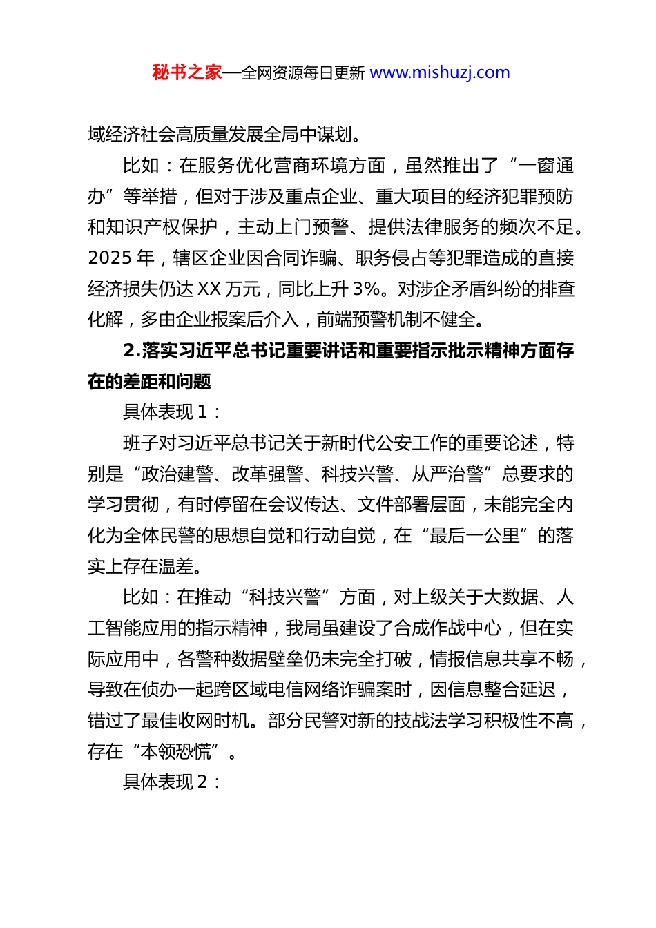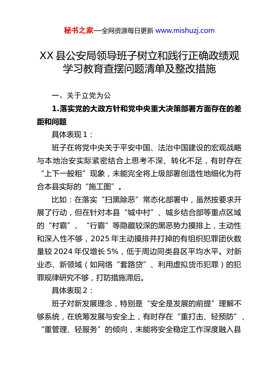 秘书之家—全网资源每日更新 www.mishuzj.comXX 县公安局领导班子树立和践行正确政绩观学习教育查摆问题清单及整改措施一、关于立党为公1.落实党的大政方针和党中央重大决策部署方面存在的差距和问题具体表现 1:班子在将党中央关于平安中国、法治中国建设的宏观战略与本地治安实际紧密结合上思考不深、转化不足,有时存在“上下一般粗”现象,未能完全将上级部署创造性地细化为符合本县实际的“施工图”。比如:在落实“扫黑除恶”常态化部署中,虽然按要求开展了行动,但在针对本县“城中村”、城乡结合部等重点区域的“村霸”、“行霸”等隐藏较深的黑恶势力摸排上,主动性和深入性不够,2025 年主动摸排并打掉的有组织犯罪团伙数量较 2024 年仅增长 5%,低于周边同类县区平均水平。对新业态、新领域(如网络“套路贷”、利用虚拟货币犯罪)的犯罪规律研究不够,打防措施滞后。具体表现 2:班子对新发展理念,特别是“安全是发展的前提”理解不够系统,在统筹发展与安全上,有时存在“重打击、轻预防”、“重管理、轻服务”的倾向,未能将安全稳定工作深度融入县秘书之家—全网资源每日更新 www.mishuzj.com域经济社会高质量发展全局中谋划。比如:在服务优化营商环境方面,虽然推出了“一窗通办”等举措,但对于涉及重点企业、重大项目的经济犯罪预防和知识产权保护,主动上门预警、提供法律服务的频次不足。2025 年,辖区企业因合同诈骗、职务侵占等犯罪造成的直接经济损失仍达 XX 万元,同比上升 3%。对涉企矛盾纠纷的排查化解,多由企业报案后介入,前端预警机制不健全。2.落实习近平总书记重要讲话和重要指示批示精神方面存在的差距和问题具体表现 1:班子对习近平总书记关于新时代公安工作的重要论述,特别是“政治建警、改革强警、科技兴警、从严治警”总要求的学习贯彻,有时停留在会议传达、文件部署层面,未能完全内化为全体民警的思想自觉和行动自觉,在“最后一公里”的落实上存在温差。比如:在推动“科技兴警”方面,对上级关于大数据、人工智能应用的指示精神,我局虽建设了合成作战中心,但在实际应用中,各警种数据壁垒仍未完全打破,情报信息共享不畅,导致在侦办一起跨区域电信网络诈骗案时,因信息整合延迟,错过了最佳收网时机。部分民警对新的技战法学习积极性不高,存在“本领恐慌”。具体表现 2:秘书之家—全网资源每日更新 www.mishuzj.com班子在贯彻落实“对党忠诚、服务人民、执法公正、纪律严明”总要求时,存在不均衡现象,对“执法公正”“纪律严明”抓得较紧,但在“服务人民”的主动性、精细化上还有提升空间,未能完全做到“以人民为中心”。比如:落实“让数据多跑路,群众少跑腿”指示有差距。部分派出所的户籍窗口在非工作日、午休时段服务存在“空档期”,群众办理紧急业务不便。2025 年“12345”政务服务热线转办件中,涉及我局窗口服务态度、办事效率的投诉仍有 XX件。在处置非警务类警情时,有时存在简单告知、引导不畅的问题,未能完全做到“民有所呼、我有所应”。3.树立“全国一盘棋”思想、服务服从大局方面存在的差距和问题具体表现 1:班子在处理局部与整体关系时,存在一定的本位主义思想有时过于强调本局、本警种的困难和特殊性,在配合跨区域、跨部门联合行动时,存在警力、资源调配上的“小算盘”,大局意识和协同作战能力有待加强。比如:在去年参与全省“净网”专项行动中,我局网安部门在向市局、省厅上报关键线索和情报时,有时存在“留一手”思想,担心“为他人作嫁衣裳”,影响了整体打击效能。在配合外地警方办案时,有时存在“等靠”思想,主动协助、深挖本地关联犯罪的积极性不高。秘书之家—全网资源每日更新 www.mishuzj.com具体表现 2:在服务保障国家重大战略在本县的实施上,班子主动靠前意识不强,思考谋划不足,未能完全将公安工作置于区域协同发展的大局中去定位和推进。比如:我县是 XX 高铁沿线重要站点,但对于高铁新城片区治安防控体系的超前谋划不足,警务站布点、视频监控建设滞后于项目建设进度。在保障国家级 XX 产业园区建设过程中,对可能因征地拆迁、劳资纠纷引发的...
