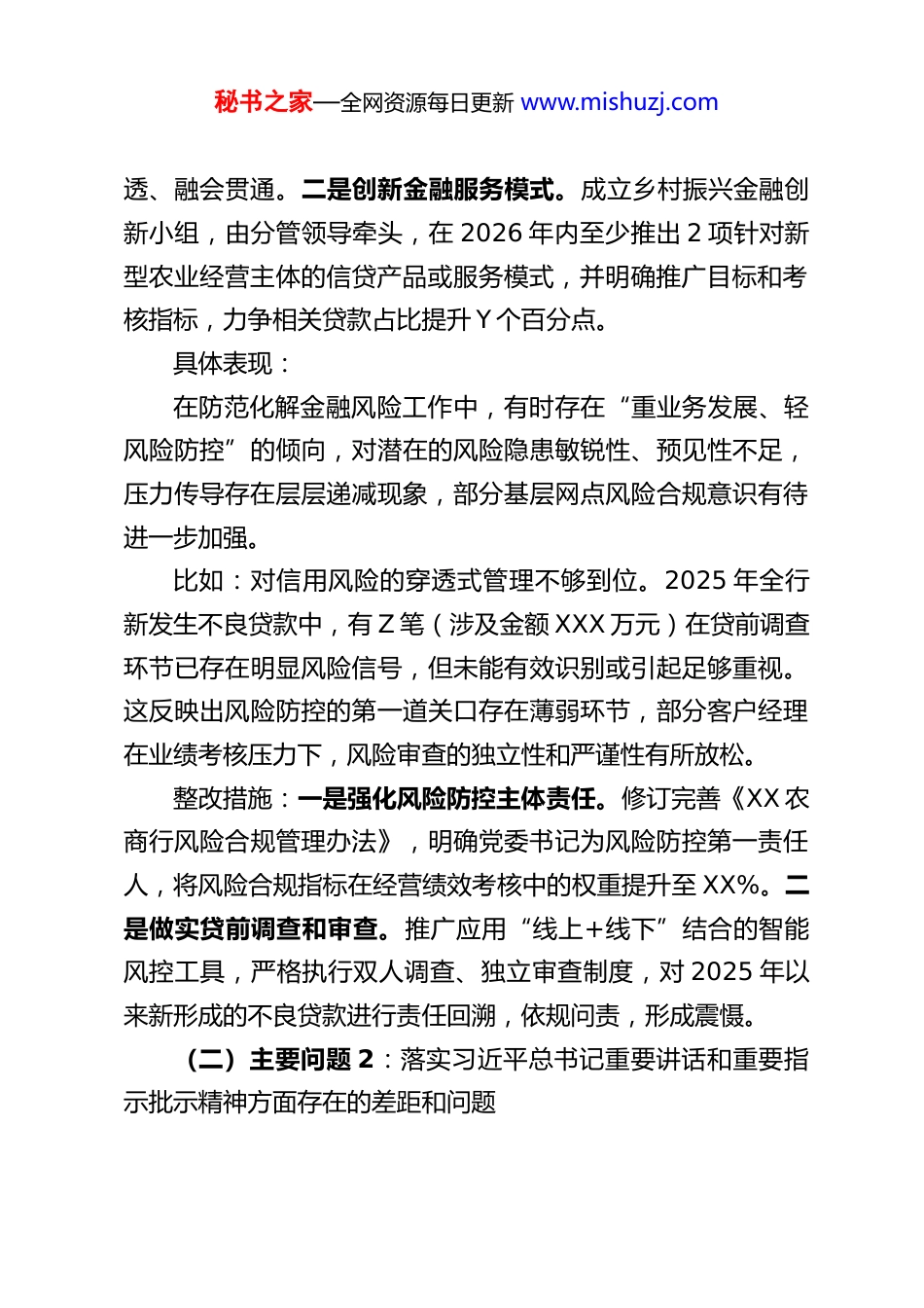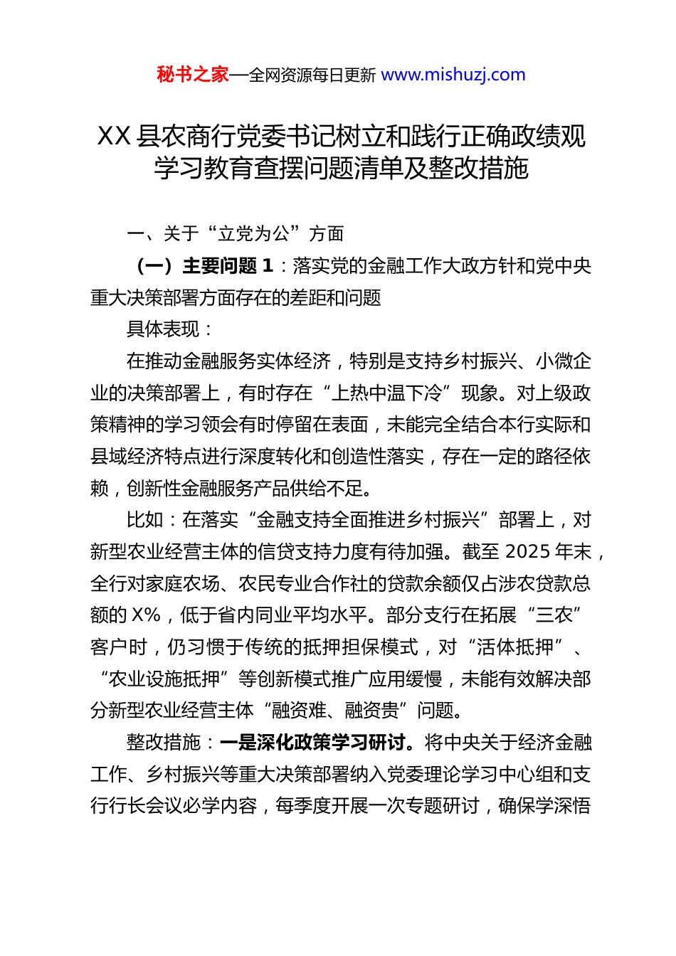 秘书之家—全网资源每日更新 www.mishuzj.comXX 县农商行党委书记树立和践行正确政绩观学习教育查摆问题清单及整改措施一、关于“立党为公”方面(一)主要问题 1:落实党的金融工作大政方针和党中央重大决策部署方面存在的差距和问题具体表现:在推动金融服务实体经济,特别是支持乡村振兴、小微企业的决策部署上,有时存在“上热中温下冷”现象。对上级政策精神的学习领会有时停留在表面,未能完全结合本行实际和县域经济特点进行深度转化和创造性落实,存在一定的路径依赖,创新性金融服务产品供给不足。比如:在落实“金融支持全面推进乡村振兴”部署上,对新型农业经营主体的信贷支持力度有待加强。截至 2025 年末,全行对家庭农场、农民专业合作社的贷款余额仅占涉农贷款总额的 X%,低于省内同业平均水平。部分支行在拓展“三农”客户时,仍习惯于传统的抵押担保模式,对“活体抵押”、“农业设施抵押”等创新模式推广应用缓慢,未能有效解决部分新型农业经营主体“融资难、融资贵”问题。整改措施:一是深化政策学习研讨。将中央关于经济金融工作、乡村振兴等重大决策部署纳入党委理论学习中心组和支行行长会议必学内容,每季度开展一次专题研讨,确保学深悟秘书之家—全网资源每日更新 www.mishuzj.com透、融会贯通。二是创新金融服务模式。成立乡村振兴金融创新小组,由分管领导牵头,在 2026 年内至少推出 2 项针对新型农业经营主体的信贷产品或服务模式,并明确推广目标和考核指标,力争相关贷款占比提升 Y 个百分点。具体表现:在防范化解金融风险工作中,有时存在“重业务发展、轻风险防控”的倾向,对潜在的风险隐患敏锐性、预见性不足,压力传导存在层层递减现象,部分基层网点风险合规意识有待进一步加强。比如:对信用风险的穿透式管理不够到位。2025 年全行新发生不良贷款中,有 Z 笔(涉及金额 XXX 万元)在贷前调查环节已存在明显风险信号,但未能有效识别或引起足够重视。这反映出风险防控的第一道关口存在薄弱环节,部分客户经理在业绩考核压力下,风险审查的独立性和严谨性有所放松。整改措施:一是强化风险防控主体责任。修订完善《XX 农商行风险合规管理办法》,明确党委书记为风险防控第一责任人,将风险合规指标在经营绩效考核中的权重提升至 XX%。二是做实贷前调查和审查。推广应用“线上+线下”结合的智能风控工具,严格执行双人调查、独立审查制度,对 2025 年以来新形成的不良贷款进行责任回溯,依规问责,形成震慑。(二)主要问题 2:落实习近平总书记重要讲话和重要指示批示精神方面存在的差距和问题秘书之家—全网资源每日更新 www.mishuzj.com具体表现:对习近平总书记关于金融工作、防范化解重大风险等重要论述和指示批示精神的学习贯彻,有时满足于“传达学习了”、“部署安排了”,但在结合本行实际制定细化落实举措、跟踪问效、确保落地生根方面,深度和韧劲尚有不足,存在一定的“温差”。比如:在落实“金融服务科技创新”相关指示要求上,行动相对迟缓。针对县内高新技术企业、专精特新“小巨人”企业的专属信贷评价体系尚未建立,仍沿用传统企业评级模型,导致部分轻资产、高成长的科技型企业难以获得有效信贷支持。2025 年,全行对科技型企业的贷款投放增速低于对公贷款平均增速。整改措施:一是建立对标对表落实机制。对习近平总书记有关金融领域的重要讲话和指示批示精神,建立台账,明确责任部门、落实举措和完成时限,由党委办公室按月督查通报。二是打造科技金融服务专班。联合县科技局、工信局,在2026 年 6 月底前,完成对全县科技企业的摸底,并引入知识产权质押、股权质押等评估机制,开发“科技贷”系列产品,力争科技企业贷款增速高于各项贷款平均增速。具体表现:在推动普惠金融发展过程中,有时过于注重完成“量”的指标(如普惠型小微企业贷款“两增”目标),而在提升服务秘书之家—全网资源每日更新 www.mishuzj.com“质”的方面思考不深、用力不均,对如何真正降低综合融资成本、优化客户体验等方面的长效机制建设谋划不够。比如:部分普惠小微客户反映融资成本仍然偏高。虽然名义利...