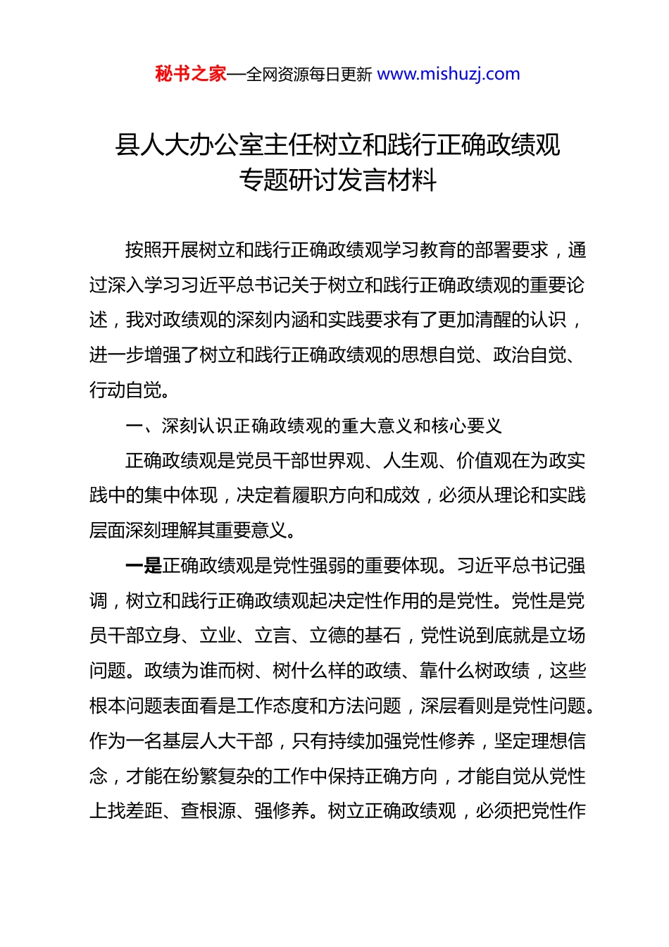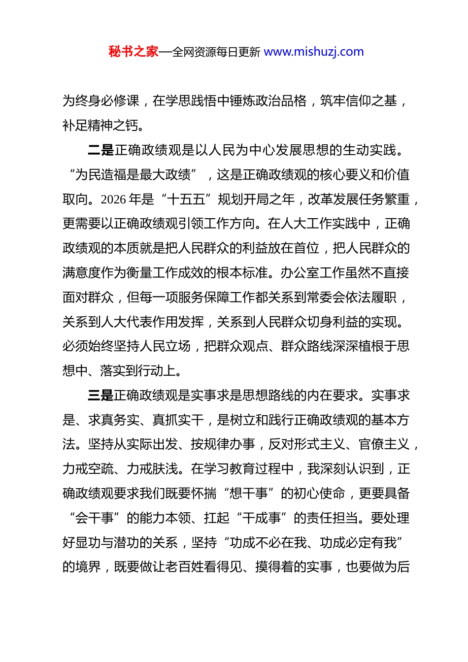 秘书之家—全网资源每日更新 www.mishuzj.com县人大办公室主任树立和践行正确政绩观专题研讨发言材料 按照开展树立和践行正确政绩观学习教育的部署要求,通过深入学习习近平总书记关于树立和践行正确政绩观的重要论述,我对政绩观的深刻内涵和实践要求有了更加清醒的认识,进一步增强了树立和践行正确政绩观的思想自觉、政治自觉、行动自觉。一、深刻认识正确政绩观的重大意义和核心要义正确政绩观是党员干部世界观、人生观、价值观在为政实践中的集中体现,决定着履职方向和成效,必须从理论和实践层面深刻理解其重要意义。一是正确政绩观是党性强弱的重要体现。习近平总书记强调,树立和践行正确政绩观起决定性作用的是党性。党性是党员干部立身、立业、立言、立德的基石,党性说到底就是立场问题。政绩为谁而树、树什么样的政绩、靠什么树政绩,这些根本问题表面看是工作态度和方法问题,深层看则是党性问题。作为一名基层人大干部,只有持续加强党性修养,坚定理想信念,才能在纷繁复杂的工作中保持正确方向,才能自觉从党性上找差距、查根源、强修养。树立正确政绩观,必须把党性作秘书之家—全网资源每日更新 www.mishuzj.com为终身必修课,在学思践悟中锤炼政治品格,筑牢信仰之基,补足精神之钙。二是正确政绩观是以人民为中心发展思想的生动实践。“为民造福是最大政绩”,这是正确政绩观的核心要义和价值取向。2026 年是“十五五”规划开局之年,改革发展任务繁重,更需要以正确政绩观引领工作方向。在人大工作实践中,正确政绩观的本质就是把人民群众的利益放在首位,把人民群众的满意度作为衡量工作成效的根本标准。办公室工作虽然不直接面对群众,但每一项服务保障工作都关系到常委会依法履职,关系到人大代表作用发挥,关系到人民群众切身利益的实现。必须始终坚持人民立场,把群众观点、群众路线深深植根于思想中、落实到行动上。三是正确政绩观是实事求是思想路线的内在要求。实事求是、求真务实、真抓实干,是树立和践行正确政绩观的基本方法。坚持从实际出发、按规律办事,反对形式主义、官僚主义,力戒空疏、力戒肤浅。在学习教育过程中,我深刻认识到,正确政绩观要求我们既要怀揣“想干事”的初心使命,更要具备“会干事”的能力本领、扛起“干成事”的责任担当。要处理好显功与潜功的关系,坚持“功成不必在我、功成必定有我”的境界,既要做让老百姓看得见、摸得着的实事,也要做为后秘书之家—全网资源每日更新 www.mishuzj.com人作铺垫、打基础、利长远的好事。二、自觉对照正确政绩观要求检视剖析查根源按照学习教育“学查改一体推进”的要求,我坚持问题导向,从党性高度深入剖析自身在政绩观方面存在的差距和不足。一是理论学习不够系统深入。学习习近平总书记关于树立和践行正确政绩观的重要论述,有时停留在一般性了解层面,缺乏系统性的深入学习和思考。对正确政绩观的理论内涵、实践要求理解不够深刻,没有真正把政绩观问题上升到党性和世界观、人生观、价值观的高度来认识。在学用结合上还有差距,理论学习的成果转化为指导实践、推动工作的能力还不够强。学习有时存在实用主义倾向,与工作直接相关的学得多,系统性学习不够,理论武装不够扎实。这些问题直接影响到对正确政绩观的深刻理解和自觉践行,需要在学习教育中认真加以整改。二是宗旨意识有待进一步强化。对照“以人民为中心”的发展思想,对照“为民造福是最大政绩”的根本要求,在工作中还存在一定差距。办公室工作事务性强、程序性强,容易陷入具体事务之中,与基层群众直接接触相对较少,对群众急难愁盼问题的了解不够深入全面。在服务保障常委会开展监督工作、组织代表活动时,有时候更多地考虑工作完成的规范性、秘书之家—全网资源每日更新 www.mishuzj.com程序性,对监督实效、对代表建议办理的实际效果关注不够。这反映出宗旨意识、群众观念还需要进一步强化,需要在思想上牢固树立群众观点,在行动上自觉践行群众路线。三是实干担当精神仍需提振。对照“功成不必在我、功成必定有我”的精神境界,对照实事求是、真抓实干的实践要求,在工作中还存在一定差距。有时候工作...