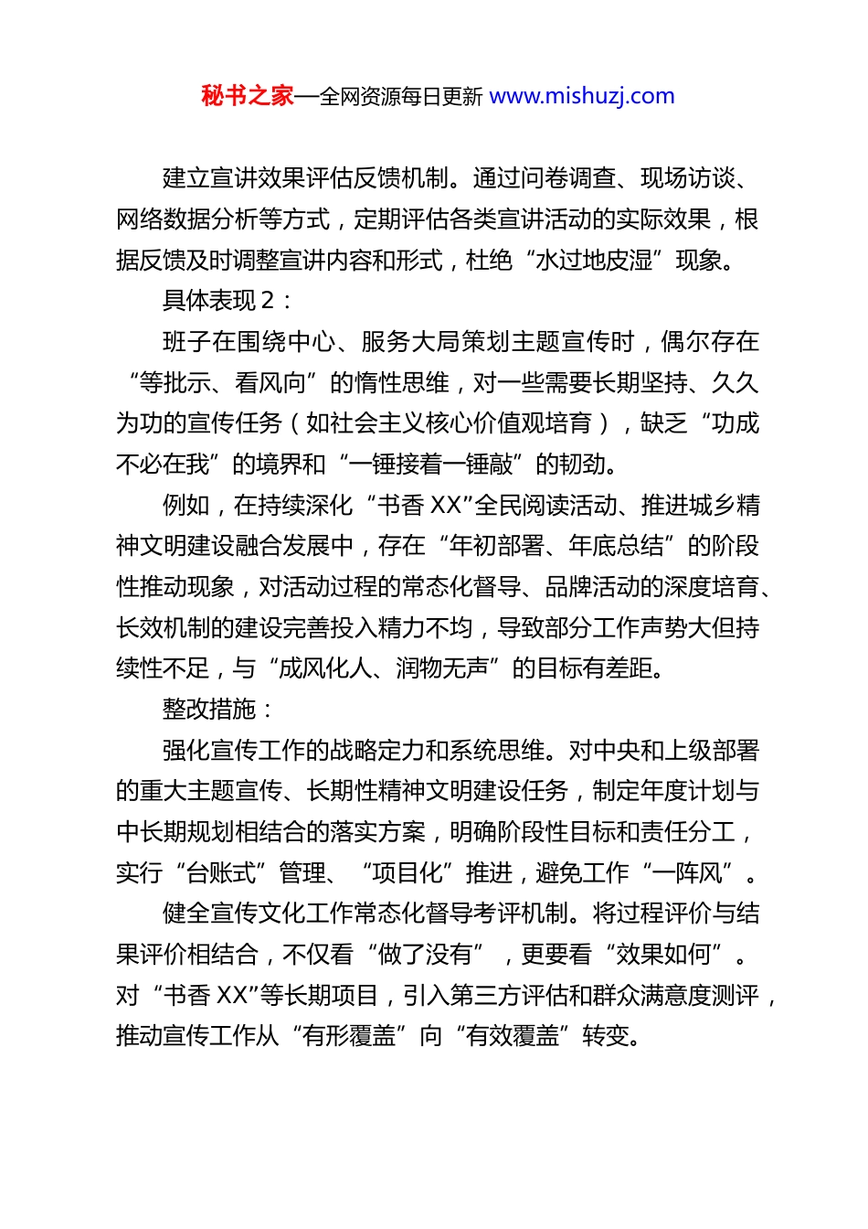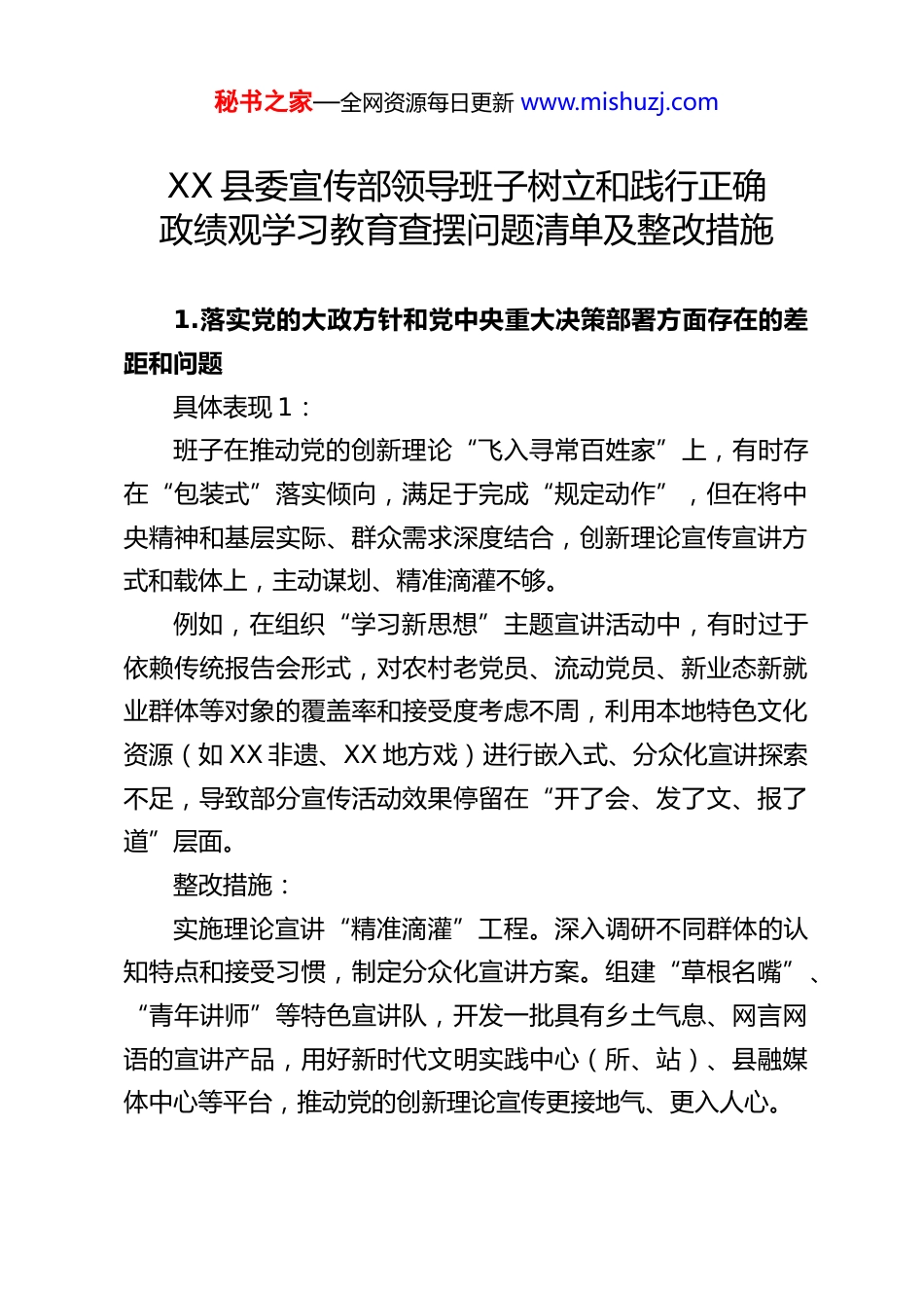 秘书之家—全网资源每日更新 www.mishuzj.comXX 县委宣传部领导班子树立和践行正确政绩观学习教育查摆问题清单及整改措施1.落实党的大政方针和党中央重大决策部署方面存在的差距和问题具体表现 1:班子在推动党的创新理论“飞入寻常百姓家”上,有时存在“包装式”落实倾向,满足于完成“规定动作”,但在将中央精神和基层实际、群众需求深度结合,创新理论宣传宣讲方式和载体上,主动谋划、精准滴灌不够。例如,在组织“学习新思想”主题宣讲活动中,有时过于依赖传统报告会形式,对农村老党员、流动党员、新业态新就业群体等对象的覆盖率和接受度考虑不周,利用本地特色文化资源(如 XX 非遗、XX 地方戏)进行嵌入式、分众化宣讲探索不足,导致部分宣传活动效果停留在“开了会、发了文、报了道”层面。整改措施:实施理论宣讲“精准滴灌”工程。深入调研不同群体的认知特点和接受习惯,制定分众化宣讲方案。组建“草根名嘴”、“青年讲师”等特色宣讲队,开发一批具有乡土气息、网言网语的宣讲产品,用好新时代文明实践中心(所、站)、县融媒体中心等平台,推动党的创新理论宣传更接地气、更入人心。秘书之家—全网资源每日更新 www.mishuzj.com建立宣讲效果评估反馈机制。通过问卷调查、现场访谈、网络数据分析等方式,定期评估各类宣讲活动的实际效果,根据反馈及时调整宣讲内容和形式,杜绝“水过地皮湿”现象。具体表现 2:班子在围绕中心、服务大局策划主题宣传时,偶尔存在“等批示、看风向”的惰性思维,对一些需要长期坚持、久久为功的宣传任务(如社会主义核心价值观培育),缺乏“功成不必在我”的境界和“一锤接着一锤敲”的韧劲。例如,在持续深化“书香 XX”全民阅读活动、推进城乡精神文明建设融合发展中,存在“年初部署、年底总结”的阶段性推动现象,对活动过程的常态化督导、品牌活动的深度培育、长效机制的建设完善投入精力不均,导致部分工作声势大但持续性不足,与“成风化人、润物无声”的目标有差距。整改措施:强化宣传工作的战略定力和系统思维。对中央和上级部署的重大主题宣传、长期性精神文明建设任务,制定年度计划与中长期规划相结合的落实方案,明确阶段性目标和责任分工,实行“台账式”管理、“项目化”推进,避免工作“一阵风”。健全宣传文化工作常态化督导考评机制。将过程评价与结果评价相结合,不仅看“做了没有”,更要看“效果如何”。对“书香 XX”等长期项目,引入第三方评估和群众满意度测评,推动宣传工作从“有形覆盖”向“有效覆盖”转变。秘书之家—全网资源每日更新 www.mishuzj.com2.落实习近平总书记重要讲话和重要指示批示精神方面存在的差距和问题具体表现 1:班子在学习贯彻习近平总书记关于宣传思想文化工作的重要指示精神时,有时存在“上下一般粗”的问题,结合 XX 县情和宣传部门职责进行细化、转化、具体化不够,创造性抓落实的亮点不多。例如,在贯彻落实“着力赓续中华文脉、推动中华优秀传统文化创造性转化和创新性发展”重要指示方面,对县内丰富的红色文化资源(如 XX 革命纪念馆)、历史文化遗产(如 XX古村落)的挖掘、阐释、传播,多停留在静态展示和常规报道层面,运用数字化、沉浸式体验等现代手段讲好 XX 故事、打造文化 IP 的突破性举措较少。整改措施:制定《XX 县宣传文化系统贯彻落实习近平总书记重要指示精神任务分解清单》。将宏观要求转化为可操作、可评估的具体项目,明确责任科室和完成时限。例如,设立“文化 XX”创新传播项目,专项扶持利用 AR/VR、短视频等新技术展现本地文化遗产的项目。开展“总书记指示在 XX”实践案例征集和评选活动。鼓励各乡镇、街道和县直宣传文化单位报送将指示精神转化为实际成效的创新案例,加强总结推广,形成比学赶超、创造性落实秘书之家—全网资源每日更新 www.mishuzj.com的浓厚氛围。具体表现 2:在贯彻落实习近平总书记关于生态文明思想、网络强国等重要论述的宣传引导上,有时存在“标签式”落实,各方面宣传都涉及,但深度解读、精准引导不足,未能完全形成宣传合力、放大主流声音。例如,在宣传“绿水青山就是金山银山”理...