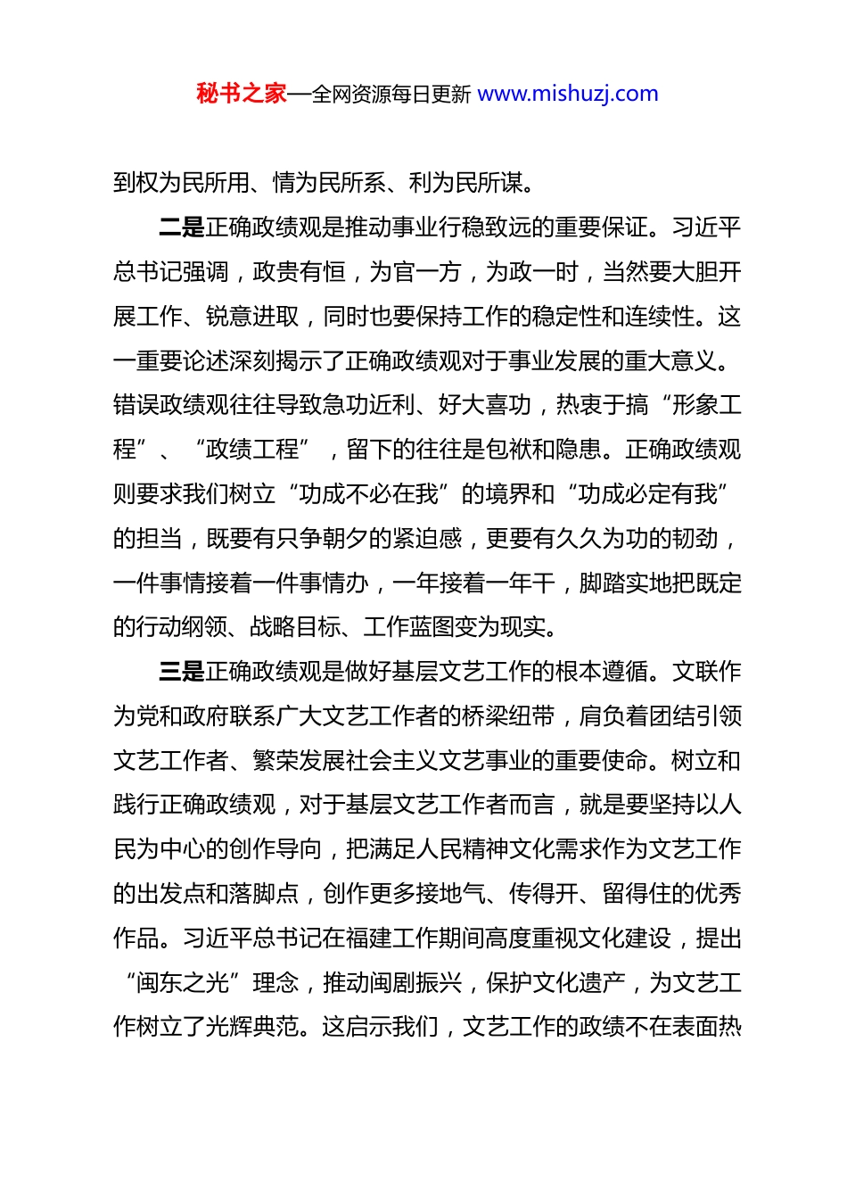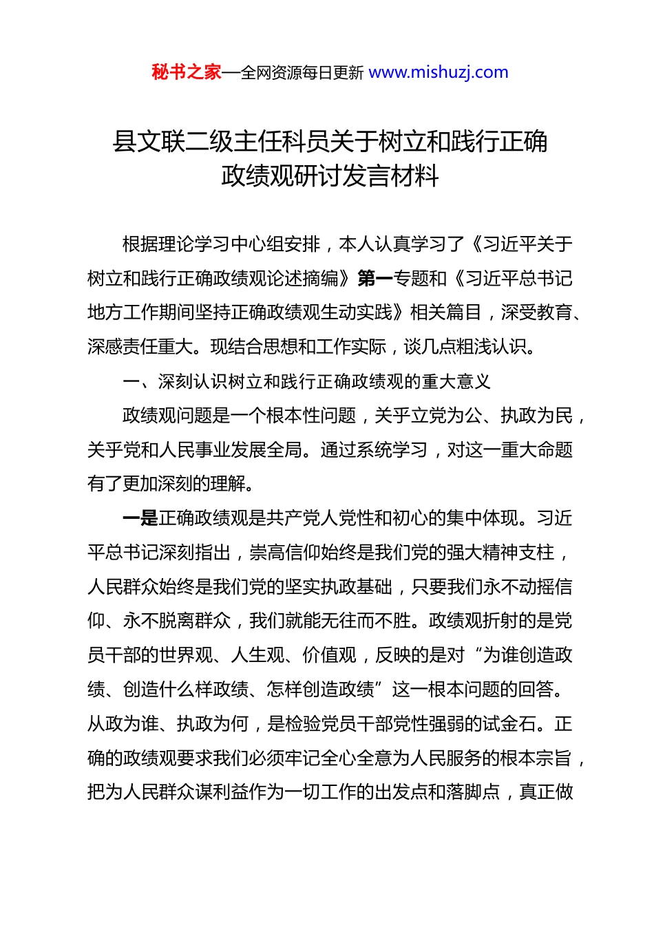 秘书之家—全网资源每日更新 www.mishuzj.com县文联二级主任科员关于树立和践行正确政绩观研讨发言材料 根据理论学习中心组安排,本人认真学习了《习近平关于树立和践行正确政绩观论述摘编》第一专题和《习近平总书记地方工作期间坚持正确政绩观生动实践》相关篇目,深受教育、深感责任重大。现结合思想和工作实际,谈几点粗浅认识。一、深刻认识树立和践行正确政绩观的重大意义政绩观问题是一个根本性问题,关乎立党为公、执政为民,关乎党和人民事业发展全局。通过系统学习,对这一重大命题有了更加深刻的理解。一是正确政绩观是共产党人党性和初心的集中体现。习近平总书记深刻指出,崇高信仰始终是我们党的强大精神支柱,人民群众始终是我们党的坚实执政基础,只要我们永不动摇信仰、永不脱离群众,我们就能无往而不胜。政绩观折射的是党员干部的世界观、人生观、价值观,反映的是对“为谁创造政绩、创造什么样政绩、怎样创造政绩”这一根本问题的回答。从政为谁、执政为何,是检验党员干部党性强弱的试金石。正确的政绩观要求我们必须牢记全心全意为人民服务的根本宗旨,把为人民群众谋利益作为一切工作的出发点和落脚点,真正做秘书之家—全网资源每日更新 www.mishuzj.com到权为民所用、情为民所系、利为民所谋。二是正确政绩观是推动事业行稳致远的重要保证。习近平总书记强调,政贵有恒,为官一方,为政一时,当然要大胆开展工作、锐意进取,同时也要保持工作的稳定性和连续性。这一重要论述深刻揭示了正确政绩观对于事业发展的重大意义。错误政绩观往往导致急功近利、好大喜功,热衷于搞“形象工程”、“政绩工程”,留下的往往是包袱和隐患。正确政绩观则要求我们树立“功成不必在我”的境界和“功成必定有我”的担当,既要有只争朝夕的紧迫感,更要有久久为功的韧劲,一件事情接着一件事情办,一年接着一年干,脚踏实地把既定的行动纲领、战略目标、工作蓝图变为现实。三是正确政绩观是做好基层文艺工作的根本遵循。文联作为党和政府联系广大文艺工作者的桥梁纽带,肩负着团结引领文艺工作者、繁荣发展社会主义文艺事业的重要使命。树立和践行正确政绩观,对于基层文艺工作者而言,就是要坚持以人民为中心的创作导向,把满足人民精神文化需求作为文艺工作的出发点和落脚点,创作更多接地气、传得开、留得住的优秀作品。习近平总书记在福建工作期间高度重视文化建设,提出“闽东之光”理念,推动闽剧振兴,保护文化遗产,为文艺工作树立了光辉典范。这启示我们,文艺工作的政绩不在表面热秘书之家—全网资源每日更新 www.mishuzj.com闹,而在于真正为人民群众提供丰富的精神食粮,在于培根铸魂、凝心聚力。二、对照检查存在的差距和不足对照习近平总书记关于正确政绩观的重要论述,对照习近平总书记在地方工作期间的生动实践,深感自身还存在不小差距。一是思想认识高度不够,对政绩观理解存在偏差。在学习中深刻反思,过去对政绩观的认识比较浅显,更多停留在工作层面,没有从党性原则和政治高度来认识和把握。习近平总书记早在河北正定工作期间就展现出了深厚的为民情怀和正确的政绩观,宁可不要“全国高产县”桂冠,也要实事求是反映群众困难、解决农民温饱问题。反观自身,在工作中有时存在急躁情绪,急于出成绩、见成效,对一些打基础、利长远的工作重视不够、投入不足。在推进文艺活动时,有时过于追求场次、人数等显性指标,对活动的实际效果和社会影响力关注不够。这些思想认识上的偏差,反映出党性修养还需进一步加强,宗旨意识还需进一步筑牢。二是调查研究深度不足,脱离群众现象不同程度存在。习近平总书记在正定工作期间,骑着一辆旧自行车跑遍了全县 25个公社、220 多个大队,留下了“四轮到,追不到;两轮到,秘书之家—全网资源每日更新 www.mishuzj.com把话唠”的动人佳话。正是这种深入基层、深入群众的扎实作风,为科学决策奠定了坚实基础。对照这一标准,自身在调查研究方面差距明显。到文联工作以来,虽然也下过基层、接触过文艺工作者和群众,但调研的深度、广度明显不足,走马观花多、深入交谈少,听取汇报多、问计于民少,对基层文艺工...