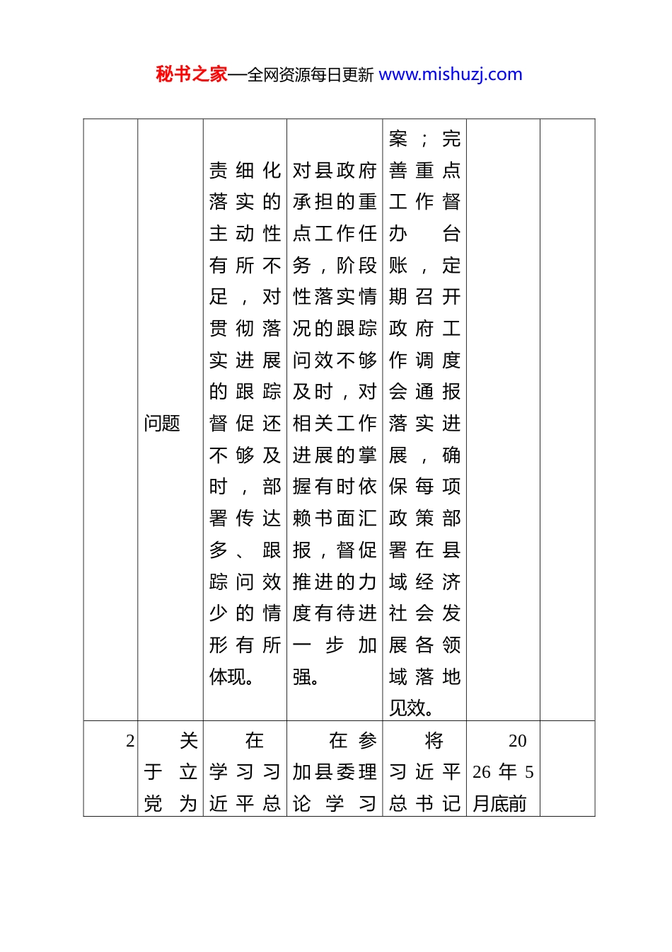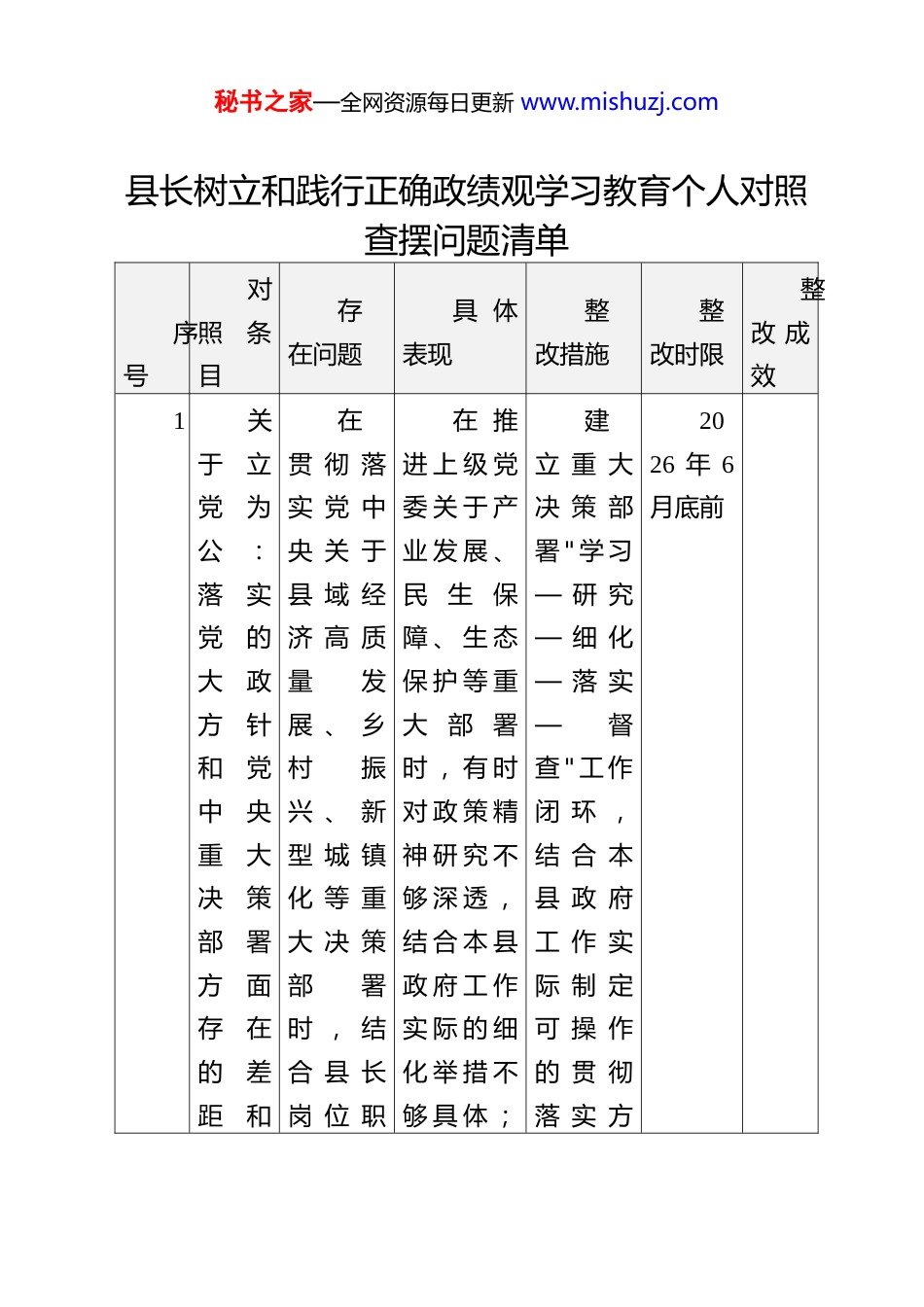 秘书之家—全网资源每日更新 www.mishuzj.com县长树立和践行正确政绩观学习教育个人对照查摆问题清单 序号对照条目存在问题具 体表现整改措施整改时限整改 成效1关于立党为公:落实党的大政方针和党中央重大决策部署方面存在的差距和在贯 彻 落实 党 中央 关 于县 域 经济 高 质量发展 、 乡村振兴 、 新型 城 镇化 等 重大 决 策部署时 , 结合 县 长岗 位 职在 推进 上 级 党委 关 于 产业 发 展 、民生保障 、 生 态保 护 等 重大部署时 , 有 时对 政 策 精神 研 究 不够 深 透 ,结 合 本 县政 府 工 作实 际 的 细化 举 措 不够 具 体 ;建立 重 大决 策 部署 " 学 习— 研 究— 细 化— 落 实—督查 " 工 作闭 环 ,结 合 本县 政 府工 作 实际 制 定可 操 作的 贯 彻落 实 方2026 年 6月底前秘书之家—全网资源每日更新 www.mishuzj.com问题责 细 化落 实 的主 动 性有 所 不足 , 对贯 彻 落实 进 展的 跟 踪督 促 还不 够 及时 , 部署 传 达多 、 跟踪 问 效少 的 情形 有 所体现。对 县 政 府承 担 的 重点 工 作 任务 , 阶 段性 落 实 情况 的 跟 踪问 效 不 够及 时 , 对相 关 工 作进 展 的 掌握 有 时 依赖 书 面 汇报 , 督 促推 进 的 力度 有 待 进一步加强。案 ; 完善 重 点工 作 督办台账 , 定期 召 开政 府 工作 调 度会 通 报落 实 进展 , 确保 每 项政 策 部署 在 县域 经 济社 会 发展 各 领域 落 地见效。2关于立党为在学 习 习近 平 总在 参加 县 委 理论学习将习 近 平总 书 记2026 年 5月底前秘书之家—全网资源每日更新 www.mishuzj.com公:落实习近平总书记重要讲话和重要指示批示精神方面存在的差距和问题书 记 关于 县 域治 理 、乡 村 振兴 、 高质 量 发展 等 重要 论 述方 面 ,学 习 的系 统 性和 深 度有 所 不足 , 将学 习 成果 转 化为 推 动县 域 经济 社 会发 展 具体 举 措的 自 觉时 , 有 时偏 重 于 归纳 梳 理 原文 , 结 合县 长 岗 位职 责 和 本县 实 际 深入 研 讨 的力 度 还 不够 ; 习 近平 总 书 记关 于 高 质量 发 展 、乡村振兴 、 基 层治 理 的 最新 重 要 论述 , 转 化为 本 县 政府 工 作 具体 举 措 的主 动 性 不关 于 县域 治 理和 高 质量 发 展重 要 论述 列 为个 人 重点 自 学内 容 ,每 次 学习 后 撰写 结 合本 县 实际 的 学习体会 ; 在谋 划 推进 政 府重 点 工作 前 ,带 头 组织 学 习秘书之家—全网资源每日更新 www.mishuzj.com性 有 待加 强 ,学 用 转化 的 实效 有 待提升。足 , 学 用转 化 的 实效 有 待 加强。相 关 重要论述 , 推动 理 论学 习 成果 在 各项 政 府工 作 中具 体 落实 ; 加强 对 县政 府 班子 成 员和 各 部门 主 要负 责 人学 习 教育 的 督促指导。3关于立在统 筹 本在 推进 上 级 统加强 大 局2026 年 6秘书之家—全网资源每日更新 www.mishuzj.com党为公:树立 " 全国一盘棋 " 思想、服务服从大局方面存在的差距和问题县 经 济社 会 发展 与 上级 整 体工 作 大局 关 系上 , 主动 服 务服 从 大局 的 意识 有 时不够强 , 在推 进 跨部 门 、跨 县 域协 调 联动 工 作中 合 力还 有 提升空间 , 就一 部 署 的重 点 工 作时 , 有 时更 多 关 注本 县 自 身利 益 的 维护 , 对 如何 通 过 本县 发 展 服务 区 域 整体 大 局 的主 动 谋 划不 够 ; 在配 合 上 级部 门 开 展专 项 工 作时 , 主 动对 接 的 积极 性 有 时不 足 ; 在处 理 涉 及区 域 整 体...