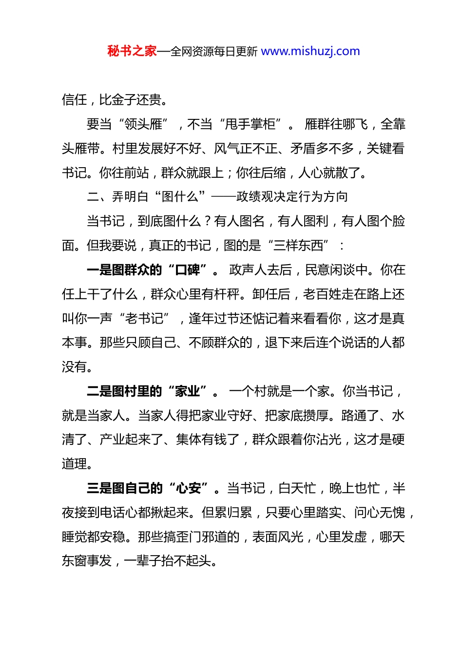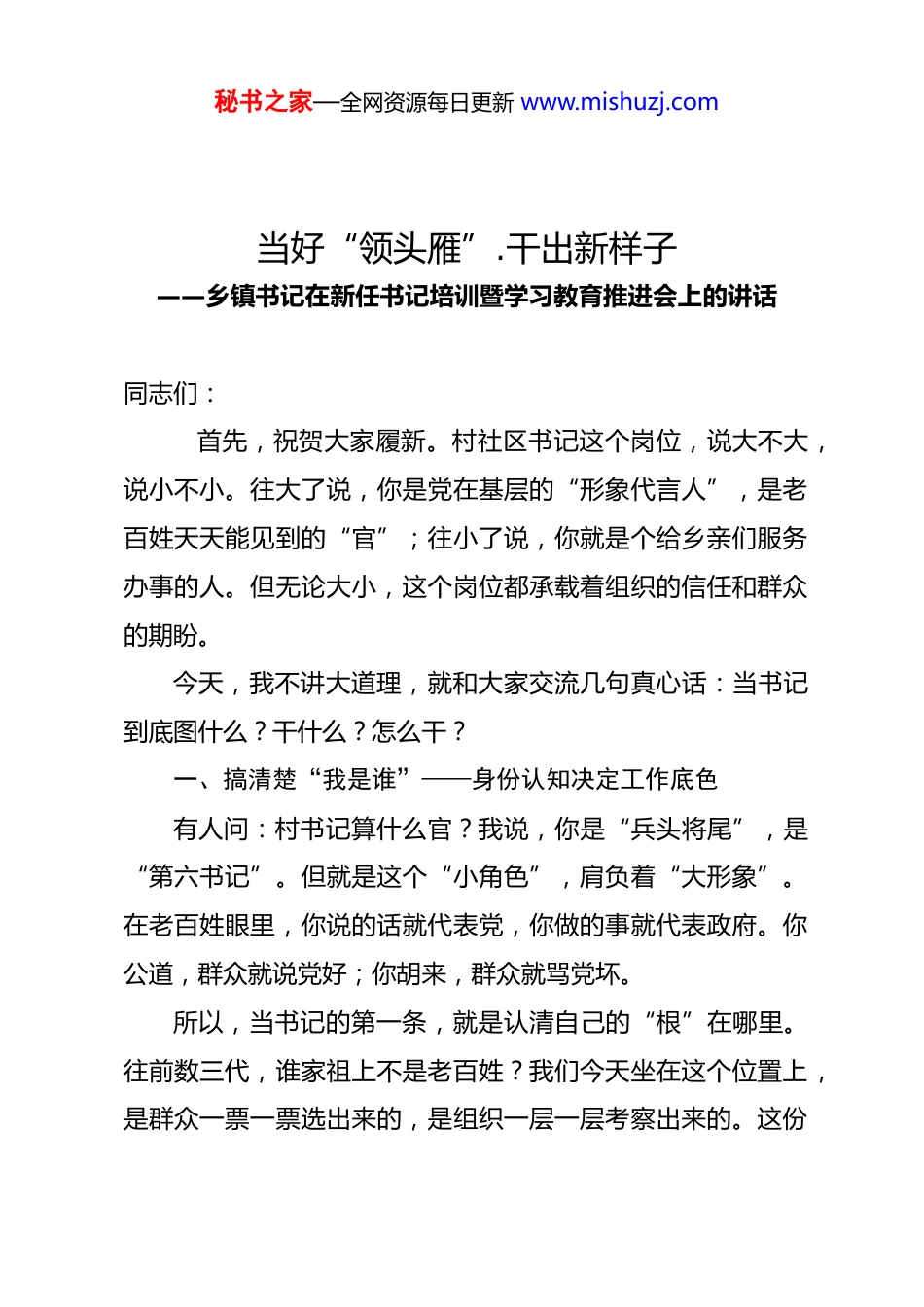 秘书之家—全网资源每日更新 www.mishuzj.com当好“领头雁”.干出新样子——乡镇书记在新任书记培训暨学习教育推进会上的讲话同志们: 首先,祝贺大家履新。村社区书记这个岗位,说大不大,说小不小。往大了说,你是党在基层的“形象代言人”,是老百姓天天能见到的“官”;往小了说,你就是个给乡亲们服务办事的人。但无论大小,这个岗位都承载着组织的信任和群众的期盼。今天,我不讲大道理,就和大家交流几句真心话:当书记到底图什么?干什么?怎么干?一、搞清楚“我是谁”——身份认知决定工作底色有人问:村书记算什么官?我说,你是“兵头将尾”,是“第六书记”。但就是这个“小角色”,肩负着“大形象”。在老百姓眼里,你说的话就代表党,你做的事就代表政府。你公道,群众就说党好;你胡来,群众就骂党坏。所以,当书记的第一条,就是认清自己的“根”在哪里。往前数三代,谁家祖上不是老百姓?我们今天坐在这个位置上,是群众一票一票选出来的,是组织一层一层考察出来的。这份秘书之家—全网资源每日更新 www.mishuzj.com信任,比金子还贵。要当“领头雁”,不当“甩手掌柜”。 雁群往哪飞,全靠头雁带。村里发展好不好、风气正不正、矛盾多不多,关键看书记。你往前站,群众就跟上;你往后缩,人心就散了。二、弄明白“图什么”——政绩观决定行为方向当书记,到底图什么?有人图名,有人图利,有人图个脸面。但我要说,真正的书记,图的是“三样东西”:一是图群众的“口碑”。 政声人去后,民意闲谈中。你在任上干了什么,群众心里有杆秤。卸任后,老百姓走在路上还叫你一声“老书记”,逢年过节还惦记着来看看你,这才是真本事。那些只顾自己、不顾群众的,退下来后连个说话的人都没有。二是图村里的“家业”。 一个村就是一个家。你当书记,就是当家人。当家人得把家业守好、把家底攒厚。路通了、水清了、产业起来了、集体有钱了,群众跟着你沾光,这才是硬道理。三是图自己的“心安”。当书记,白天忙,晚上也忙,半夜接到电话心都揪起来。但累归累,只要心里踏实、问心无愧,睡觉都安稳。那些搞歪门邪道的,表面风光,心里发虚,哪天东窗事发,一辈子抬不起头。秘书之家—全网资源每日更新 www.mishuzj.com政绩观要正,就是要搞清楚:政绩是给群众干的,不是给领导看的;是让群众夸的,不是让领导点的。三、想透彻“干什么”——四项职责必须扛在肩上当书记到底干什么?我把它概括为四句话:第一,发展经济是“硬任务”。老百姓最实在,谁让他们富起来,他们就信谁。你光会开会、填表、应付检查,群众不买账。你得带着大家找门路、谋产业。土地流转、乡村旅游、特色种养、电商带货——哪条路走得通,就走哪条路。村集体经济壮大了,说话才有底气,办事才有本钱。第二,服务群众是“良心活”。 群众找我们,无非就是希望党的政策能落到他们身上。给个好脸色,真的那么难吗?你把群众当亲人,群众就把你当家人。谁家老人病了去看看,谁家孩子上学了问问难处,谁家遇到事了主动上前。这些小事,群众记一辈子。第三,化解矛盾是“基本功”。 农村矛盾多,地坎子、房檐沟、鸡毛蒜皮,哪一样处理不好都能闹大。当书记要有“早发现、早介入、早化解”的本事。矛盾刚冒头,你就上手;事闹大了,你就晚了。记住一句话:小事不出村,大事不出镇,矛盾不上交。第四,管好班子是“硬支撑”。 你一个人浑身是铁,能打秘书之家—全网资源每日更新 www.mishuzj.com几颗钉?要把党员带起来,把“两委”拢起来,把群众组织起来。选好配强班子,培养后备力量,让村里有人干事、有事能办。你走了,留下一个好班子、一套好制度,这才是长远的政绩。四、琢磨透“怎么干”——五种能力必须练过硬光知道干什么还不够,还得会干。我送大家五句话:一是政治定向能力。 方向不对,越走越远。上级的决策部署,要坚决执行,不能搞“上有政策、下有对策”。群众对政策不理解,你要耐心解释,不能跟着起哄、人云亦云。二是协调各方能力。对上,要争取支持;对下,要赢得信任;对班子成员,要宽严相济、恩威并重。把方方面面的人都拢起来,才能形成合力。三是民主管理能力。 现...
