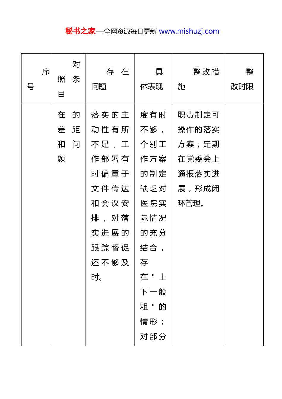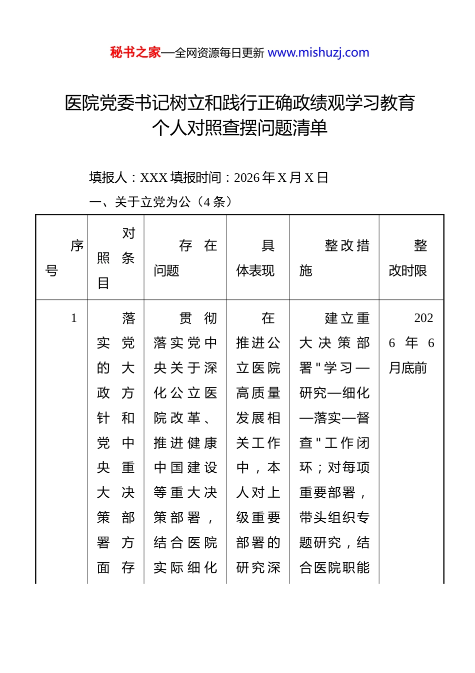 秘书之家—全网资源每日更新 www.mishuzj.com医院党委书记树立和践行正确政绩观学习教育个人对照查摆问题清单 填报人:XXX 填报时间:2026 年 X 月 X 日一、关于立党为公(4 条)序号对照条目存在问题具体表现整 改 措施整改时限1落实党的大政方针和党中央重大决策部署方面存贯彻落 实 党 中央 关 于 深化 公 立 医院 改 革 、推 进 健 康中 国 建 设等 重 大 决策 部 署 ,结 合 医 院实 际 细 化在推 进 公立 医 院高 质 量发 展 相关 工 作中 , 本人 对 上级 重 要部 署 的研 究 深建 立 重大 决 策 部署 " 学 习 —研究—细化—落实—督查 " 工 作 闭环;对每项重要部署,带头组织专题研究,结合医院职能2026 年 6月底前秘书之家—全网资源每日更新 www.mishuzj.com序号对照条目存在问题具体表现整 改 措施整改时限在的差距和问题落 实 的 主动 性 有 所不 足 , 工作 部 署 有时 偏 重 于文 件 传 达和 会 议 安排 , 对 落实 进 展 的跟 踪 督 促还 不 够 及时。度 有 时不 够 ,个 别 工作 方 案的 制 定缺 乏 对医 院 实际 情 况的 充 分结 合 ,存在 " 上下 一 般粗 " 的情 形 ;对 部 分职责制定可操作的落实方案;定期在党委会上通报落实进展,形成闭环管理。秘书之家—全网资源每日更新 www.mishuzj.com序号对照条目存在问题具体表现整 改 措施整改时限改 革 任务 的 阶段 性 落实 情 况跟 踪 问效 不 够及 时 ,督 促 推进 的 力度 有 待加强。2落实习近平总书对习近 平 总 书记 关 于 卫生 健 康 工本人 在 党委 理 论学 习 中将 习 近平总书记关于卫生健康工作的重要2026 年 5月底前秘书之家—全网资源每日更新 www.mishuzj.com序号对照条目存在问题具体表现整 改 措施整改时限记重要讲话和重要指示批示精神方面存在的差距和问题作 、 人 民至 上 生 命至 上 等 重要 论 述 的学习研究 , 深 度和 系 统 性有所不足 , 将 学习 成 果 转化 为 推 动医 院 工 作的 具 体 举措 还 不 够充 分 , 学用 转 化 的心 组 学习 时 ,对 习 近平 总 书记 关 于卫 生 健康 工 作重 要 论述 的 研讨发言 , 有时 偏 重于 梳 理归 纳 原文 , 结合 医 院论述列为中心组学习重点内容,每次学习后形成工作转化清单;在重要工作方案起草前,带头组织学习相关重要论述,推动理论学习成果在医院工作中的整体落实。秘书之家—全网资源每日更新 www.mishuzj.com序号对照条目存在问题具体表现整 改 措施整改时限自 觉 性 有待加强。改 革 发展 实 际深 入 剖析 的 力度 还 不够 ; 在推 进 医院 重 点工作时 , 引用 和 贯彻 习 近平 总 书记 最 新论 述 的精 准 性秘书之家—全网资源每日更新 www.mishuzj.com序号对照条目存在问题具体表现整 改 措施整改时限有 待 提升, " 学而不用 " 的问 题 在个 别 工作 环 节有 所 体现。3树立 " 全国一盘棋 " 思在统筹 医 院 自身 发 展 与服 务 区 域医 疗 卫 生在推 进 与基 层 医疗 机 构的 医 联加 强 大局 意 识 教育,将医院发展与区域医疗卫生整2026 年 6月底前秘书之家—全网资源每日更新 www.mishuzj.com序号对照条目存在问题具体表现整 改 措施整改时限想、服务服从大局方面存在的差距和问题大 局 的 关系 上 , 有时 存 在 就医 院 看 医院 、 全 局视 野 不 够宽的倾向 ; 在 推进 医 联 体建 设 、 对口 帮 扶 基层 医 疗 机构 等 工 作中 , 主 动服 务 大 局的 意 识 有体 协 作工作中 , 本人 有 时更 多 关注 医 院自 身 的业 务 发展 , 对如 何 通过 医 联体 建 设带 动 区域 医 疗卫 生 整体 水 平体布局紧密结合;制定医联体建设和对口帮扶工作专项方案,明确年度目标...