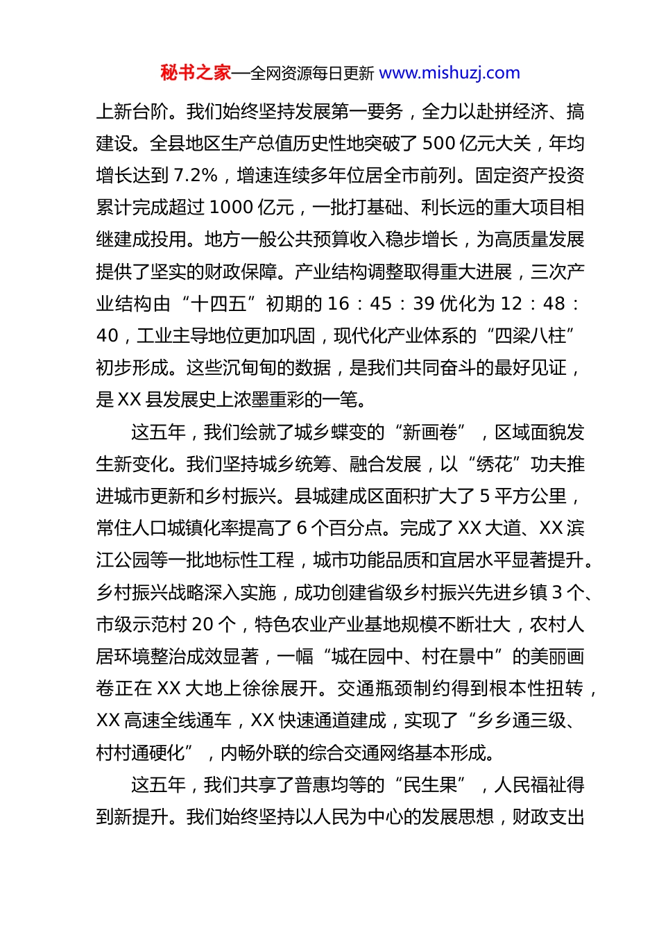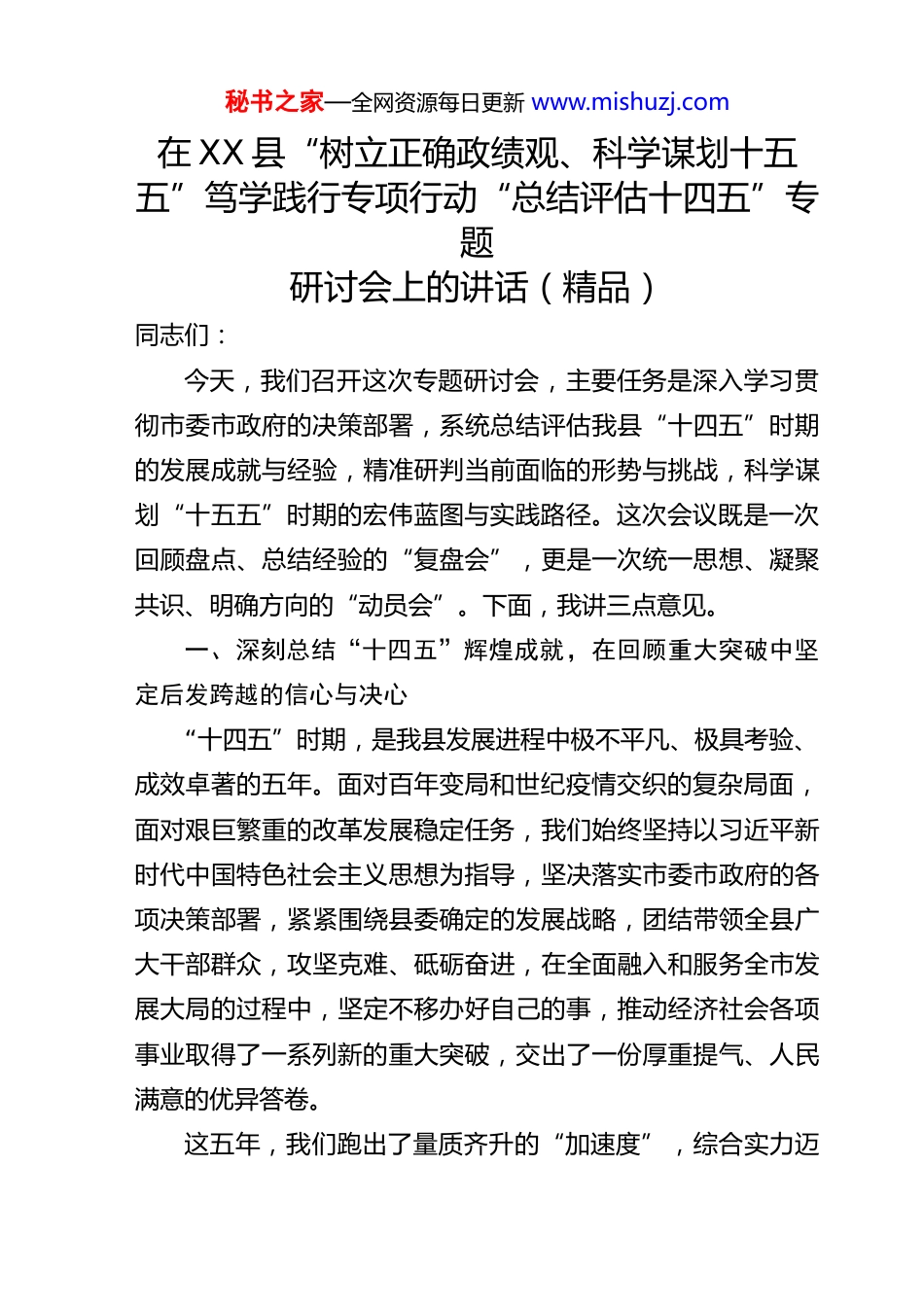 秘书之家—全网资源每日更新 www.mishuzj.com在 XX 县“树立正确政绩观、科学谋划十五五”笃学践行专项行动“总结评估十四五”专题研讨会上的讲话(精品)同志们:今天,我们召开这次专题研讨会,主要任务是深入学习贯彻市委市政府的决策部署,系统总结评估我县“十四五”时期的发展成就与经验,精准研判当前面临的形势与挑战,科学谋划“十五五”时期的宏伟蓝图与实践路径。这次会议既是一次回顾盘点、总结经验的“复盘会”,更是一次统一思想、凝聚共识、明确方向的“动员会”。下面,我讲三点意见。一、深刻总结“十四五”辉煌成就,在回顾重大突破中坚定后发跨越的信心与决心“十四五”时期,是我县发展进程中极不平凡、极具考验、成效卓著的五年。面对百年变局和世纪疫情交织的复杂局面,面对艰巨繁重的改革发展稳定任务,我们始终坚持以习近平新时代中国特色社会主义思想为指导,坚决落实市委市政府的各项决策部署,紧紧围绕县委确定的发展战略,团结带领全县广大干部群众,攻坚克难、砥砺奋进,在全面融入和服务全市发展大局的过程中,坚定不移办好自己的事,推动经济社会各项事业取得了一系列新的重大突破,交出了一份厚重提气、人民满意的优异答卷。这五年,我们跑出了量质齐升的“加速度”,综合实力迈秘书之家—全网资源每日更新 www.mishuzj.com上新台阶。我们始终坚持发展第一要务,全力以赴拼经济、搞建设。全县地区生产总值历史性地突破了 500 亿元大关,年均增长达到 7.2%,增速连续多年位居全市前列。固定资产投资累计完成超过 1000 亿元,一批打基础、利长远的重大项目相继建成投用。地方一般公共预算收入稳步增长,为高质量发展提供了坚实的财政保障。产业结构调整取得重大进展,三次产业结构由“十四五”初期的 16:45:39 优化为 12:48:40,工业主导地位更加巩固,现代化产业体系的“四梁八柱”初步形成。这些沉甸甸的数据,是我们共同奋斗的最好见证,是 XX 县发展史上浓墨重彩的一笔。这五年,我们绘就了城乡蝶变的“新画卷”,区域面貌发生新变化。我们坚持城乡统筹、融合发展,以“绣花”功夫推进城市更新和乡村振兴。县城建成区面积扩大了 5 平方公里,常住人口城镇化率提高了 6 个百分点。完成了 XX 大道、XX 滨江公园等一批地标性工程,城市功能品质和宜居水平显著提升。乡村振兴战略深入实施,成功创建省级乡村振兴先进乡镇 3 个、市级示范村 20 个,特色农业产业基地规模不断壮大,农村人居环境整治成效显著,一幅“城在园中、村在景中”的美丽画卷正在 XX 大地上徐徐展开。交通瓶颈制约得到根本性扭转,XX 高速全线通车,XX 快速通道建成,实现了“乡乡通三级、村村通硬化”,内畅外联的综合交通网络基本形成。这五年,我们共享了普惠均等的“民生果”,人民福祉得到新提升。我们始终坚持以人民为中心的发展思想,财政支出秘书之家—全网资源每日更新 www.mishuzj.com的 70%以上用于民生领域。城乡居民人均可支配收入分别达到45000 元和 23000 元,年均增速跑赢经济增速,群众的“钱袋子”更鼓了。教育事业优先发展,成功引进 XX 名校合作办学,新建改扩建中小学、幼儿园 30 余所,高考本科上线率屡创新高。健康 XX 建设扎实推进,县人民医院成功创建三级乙等综合医院,县域医疗服务能力大幅提升。社会保障体系更加健全,城乡低保、基本养老、基本医疗保险实现应保尽保。平安 XX、法治 XX 建设深入推进,社会大局保持和谐稳定,人民群众的获得感、幸福感、安全感更加充实、更有保障、更可持续。同志们,回顾“十四五”的发展历程,我们取得的成绩来之不易,积累的经验弥足珍贵。这些成绩的背后,是市委市政府坚强领导和亲切关怀的结果,是全县人民团结拼搏、辛勤耕耘的结果,也是我们对县域发展规律认识不断深化的结果。我们深刻体会到:第一,更突出的发展地位是我们赢得主动的“势”。我们主动将 XX 发展置于全市乃至更大区域的战略格局中去考量,积极承接中心城市功能疏解和产业转移,在区域协同发展中的战略地位和影响力显著提升,为我们争取政策、集聚资源、加快发展赢得了宝贵的战略主动。第...