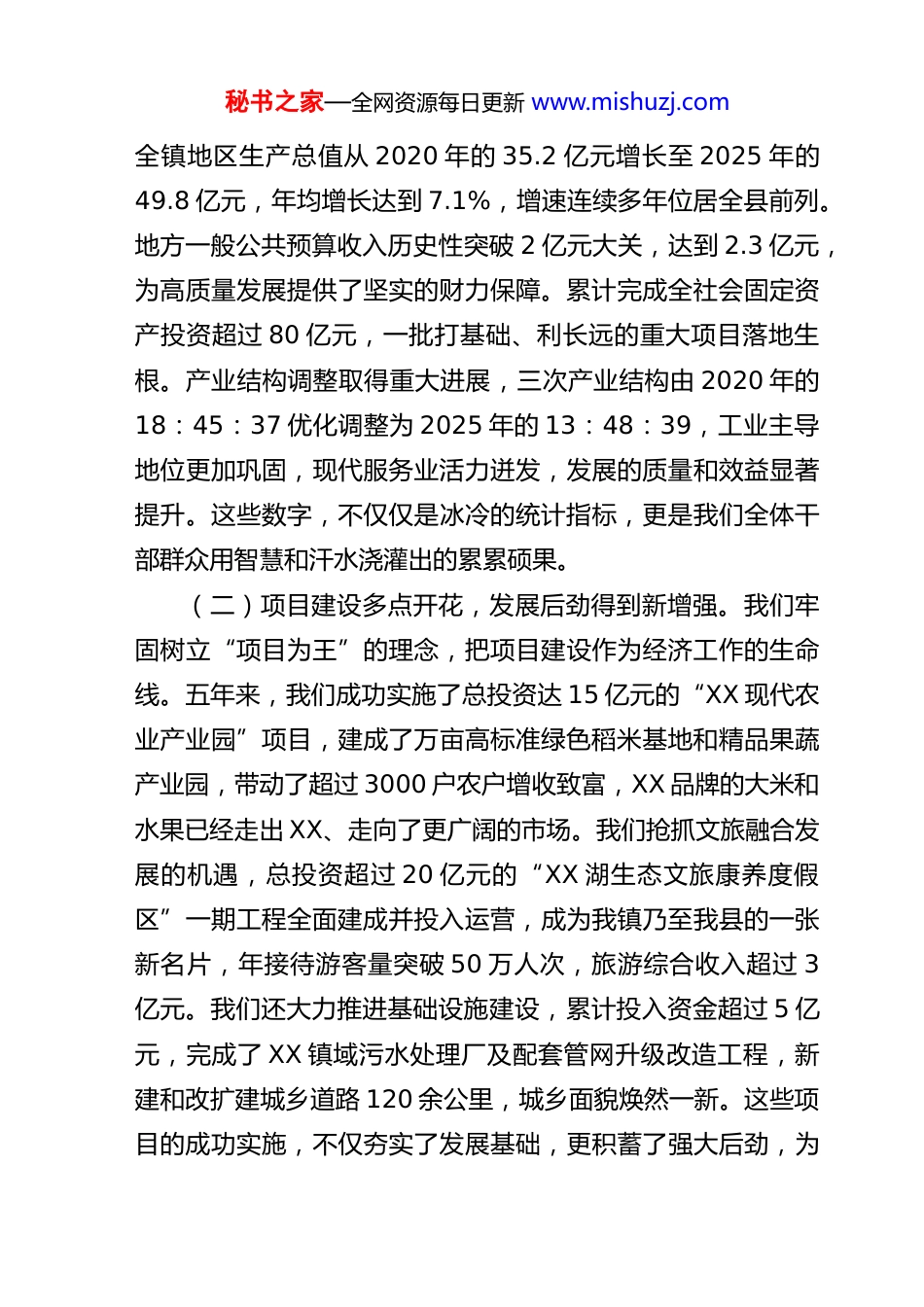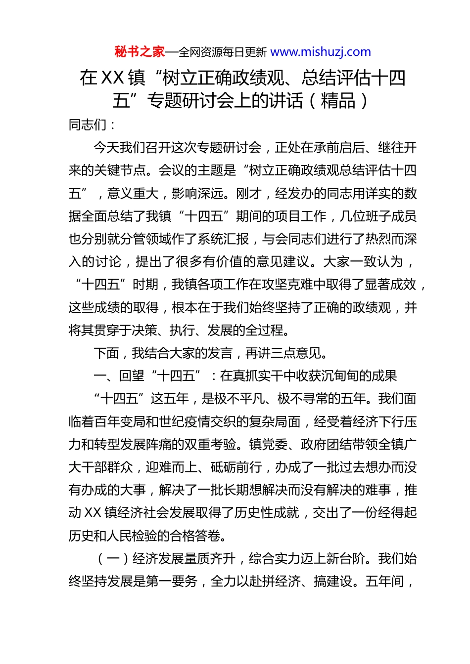 秘书之家—全网资源每日更新 www.mishuzj.com在 XX 镇“树立正确政绩观、总结评估十四五”专题研讨会上的讲话(精品)同志们:今天我们召开这次专题研讨会,正处在承前启后、继往开来的关键节点。会议的主题是“树立正确政绩观总结评估十四五”,意义重大,影响深远。刚才,经发办的同志用详实的数据全面总结了我镇“十四五”期间的项目工作,几位班子成员也分别就分管领域作了系统汇报,与会同志们进行了热烈而深入的讨论,提出了很多有价值的意见建议。大家一致认为,“十四五”时期,我镇各项工作在攻坚克难中取得了显著成效,这些成绩的取得,根本在于我们始终坚持了正确的政绩观,并将其贯穿于决策、执行、发展的全过程。下面,我结合大家的发言,再讲三点意见。一、回望“十四五”:在真抓实干中收获沉甸甸的成果“十四五”这五年,是极不平凡、极不寻常的五年。我们面临着百年变局和世纪疫情交织的复杂局面,经受着经济下行压力和转型发展阵痛的双重考验。镇党委、政府团结带领全镇广大干部群众,迎难而上、砥砺前行,办成了一批过去想办而没有办成的大事,解决了一批长期想解决而没有解决的难事,推动 XX 镇经济社会发展取得了历史性成就,交出了一份经得起历史和人民检验的合格答卷。(一)经济发展量质齐升,综合实力迈上新台阶。我们始终坚持发展是第一要务,全力以赴拼经济、搞建设。五年间,秘书之家—全网资源每日更新 www.mishuzj.com全镇地区生产总值从 2020 年的 35.2 亿元增长至 2025 年的49.8 亿元,年均增长达到 7.1%,增速连续多年位居全县前列。地方一般公共预算收入历史性突破 2 亿元大关,达到 2.3 亿元,为高质量发展提供了坚实的财力保障。累计完成全社会固定资产投资超过 80 亿元,一批打基础、利长远的重大项目落地生根。产业结构调整取得重大进展,三次产业结构由 2020 年的18:45:37 优化调整为 2025 年的 13:48:39,工业主导地位更加巩固,现代服务业活力迸发,发展的质量和效益显著提升。这些数字,不仅仅是冰冷的统计指标,更是我们全体干部群众用智慧和汗水浇灌出的累累硕果。(二)项目建设多点开花,发展后劲得到新增强。我们牢固树立“项目为王”的理念,把项目建设作为经济工作的生命线。五年来,我们成功实施了总投资达 15 亿元的“XX 现代农业产业园”项目,建成了万亩高标准绿色稻米基地和精品果蔬产业园,带动了超过 3000 户农户增收致富,XX 品牌的大米和水果已经走出 XX、走向了更广阔的市场。我们抢抓文旅融合发展的机遇,总投资超过 20 亿元的“XX 湖生态文旅康养度假区”一期工程全面建成并投入运营,成为我镇乃至我县的一张新名片,年接待游客量突破 50 万人次,旅游综合收入超过 3亿元。我们还大力推进基础设施建设,累计投入资金超过 5 亿元,完成了 XX 镇域污水处理厂及配套管网升级改造工程,新建和改扩建城乡道路 120 余公里,城乡面貌焕然一新。这些项目的成功实施,不仅夯实了发展基础,更积蓄了强大后劲,为秘书之家—全网资源每日更新 www.mishuzj.com未来的持续发展注入了不竭动力。(三)民生福祉持续改善,群众获得感实现新提升。我们始终坚持以人民为中心的发展思想,将每年财政支出的 70%以上用于民生领域。五年间,全镇城乡居民人均可支配收入分别从 3.8 万元和 1.9 万元增长到 5.1 万元和 2.7 万元,增速喜人。累计新增城镇就业岗位超过 6000 个,城乡基本养老保险、基本医疗保险参保率稳定在 98%以上。我们投资近 1.5 亿元,对镇中心学校和 5 所村级小学进行了标准化改造,教育教学环境得到根本性改善。建成了高标准的镇中心卫生院和 12 个一体化管理村卫生室,群众“小病不出村、大病不出镇”的愿望基本实现。乡村振兴战略深入实施,成功创建省级美丽乡村示范村 3 个,县级示范村 8 个。平安 XX 建设扎实推进,社会大局和谐稳定,人民群众的获得感、幸福感、安全感更加充实、更有保障、更可持续。(四)干部队伍担当作为,政绩观得到有效校准。成绩的取得,关键在人,关键在干部。五年来,我们坚持以政治建设为统领,持续加强干部队...