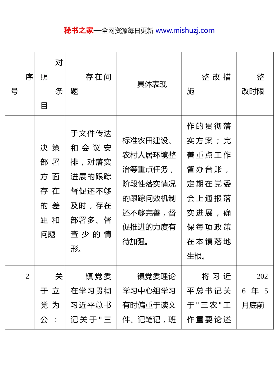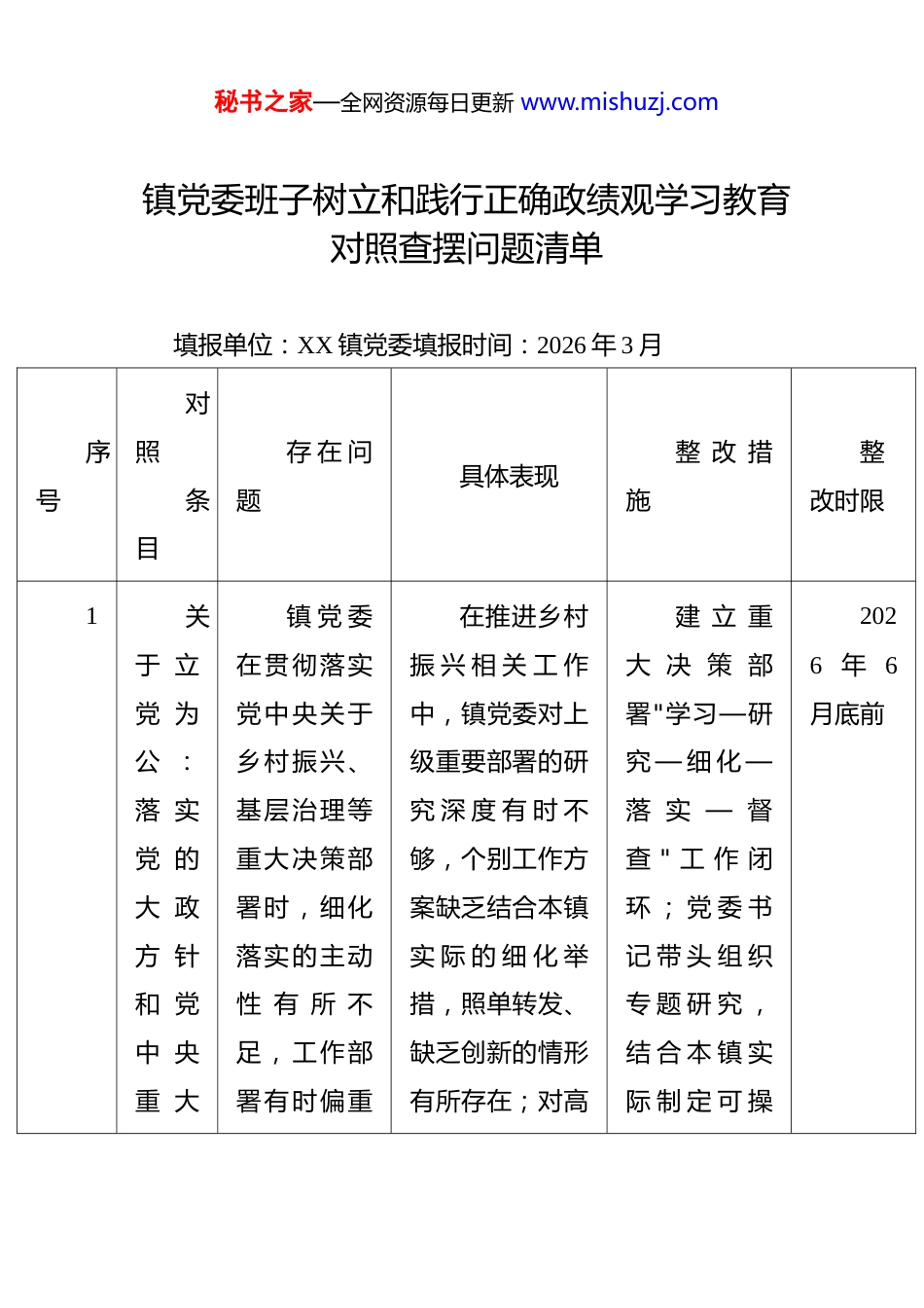 秘书之家—全网资源每日更新 www.mishuzj.com镇党委班子树立和践行正确政绩观学习教育对照查摆问题清单 填报单位:XX 镇党委填报时间:2026 年 3 月序号对照条目存 在 问题具体表现整 改 措施整改时限1关于 立党 为公 :落 实党 的大 政方 针和 党中 央重 大镇 党 委在贯彻落实党中央关于乡村振兴、基层治理等重大决策部署时,细化落实的主动性 有 所 不足,工作部署有时偏重在推进乡村振 兴 相 关 工 作中,镇党委对上级重要部署的研究 深 度 有 时 不够,个别工作方案缺乏结合本镇实 际 的 细 化 举措,照单转发、缺乏创新的情形有所存在;对高建 立 重大 决 策 部署"学习—研究 — 细 化 —落 实 — 督查 " 工 作 闭环 ; 党 委 书记 带 头 组 织专 题 研 究 ,结 合 本 镇 实际 制 定 可 操2026 年 6月底前秘书之家—全网资源每日更新 www.mishuzj.com序号对照条目存 在 问题具体表现整 改 措施整改时限决 策部 署方 面存 在的 差距 和问题于文件传达和 会 议 安排,对落实进展的跟踪督促还不够及时,存在部署多、督查 少 的 情形。标准农田建设、农村人居环境整治等重点任务,阶段性落实情况的跟踪问效机制还不够完善,督促推进的力度有待加强。作 的 贯 彻 落实 方 案 ; 完善 重 点 工 作督 办 台 账 ,定 期 在 党 委会 上 通 报 落实 进 展 , 确保 每 项 政 策在 本 镇 落 地生根。2关于 立党 为公 :镇 党 委在学习贯彻习近平总书记 关 于 " 三镇党委理论学习中心组学习有时偏重于读文件、记笔记,班将 习 近平 总 书 记 关于 " 三 农 " 工作 重 要 论 述2026 年 5月底前秘书之家—全网资源每日更新 www.mishuzj.com序号对照条目存 在 问题具体表现整 改 措施整改时限落 实习 近平 总书 记重 要讲 话和 重要 指示 批示 精神 方面 存在 的差 距和 问农"工作、基层治理等重要 论 述 方面,学习的系统性和深度 有 所 不足,将学习成果转化为推动本镇工作的具体举措还不够及时,学用转化的实效有待加强。子成员结合本镇工作实际深入研讨的质量有待提升;习近平总书记 关 于 乡 村 振兴、基层治理的最新重要论述,转化为本镇具体工作举措的主动性不足;个别村级党支部的学习教 育 存 在 走 形式、质量不高的情形,学习成果向基层传导的效列 为 中 心 组学 习 重 点 内容 , 每 次 学习 后 形 成 工作 转 化 清单 ; 加 强 对村 级 党 支 部学 习 教 育 的指 导 督 促 ;建立"学习—研 讨 — 转化 " 工 作 机制 , 推 动 理论 学 习 成 果在 具 体 工 作秘书之家—全网资源每日更新 www.mishuzj.com序号对照条目存 在 问题具体表现整 改 措施整改时限题果有待加强。中落实。3关于 立党 为公 :树立"全国 一盘棋"思想 、服 务服 从大 局镇 党 委在统筹本镇工作与县域发展大局的关系上,主动服务服从大局的意识有 时 不 够强 , 在 跨村、跨部门协调联动中的合力还有提升空间,在推进县域统一部署的重点工作时,镇党委有时更多关注本镇的局部利益,对如何服务县域整体发展大局的主动谋划不够;在配合上级开展专项工作时,协调配合的主动性有时不足,等待上 级 具 体 安 排加 强 大局 意 识 教育 , 将 本 镇工 作 与 县 域发 展 整 体 布局 紧 密 结合 ; 建 立 与上 级 部 门 和相 关 镇 街 主动 对 接 的 工作 机 制 ; 定期 研 究 本 镇工 作 与 县 域2026 年 6月底前秘书之家—全网资源每日更新 www.mishuzj.com序号对照条目存 在 问题具体表现整 改 措施整改时限方 面存 在的 差距 和问题就本镇看本镇、全局视野不够宽的倾向在个别工作中有所体现。多 、 主 动 对 接少;在处理跨村利 益 协 调 事 项时,统筹协调的力度有待加强。发 展 大 局 的结 合 点 , 强化 服 务 大 局的 主 动 性 ...