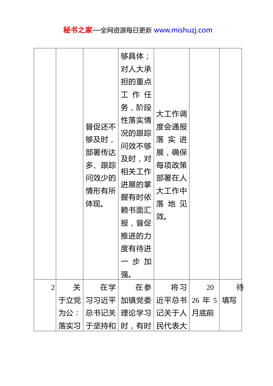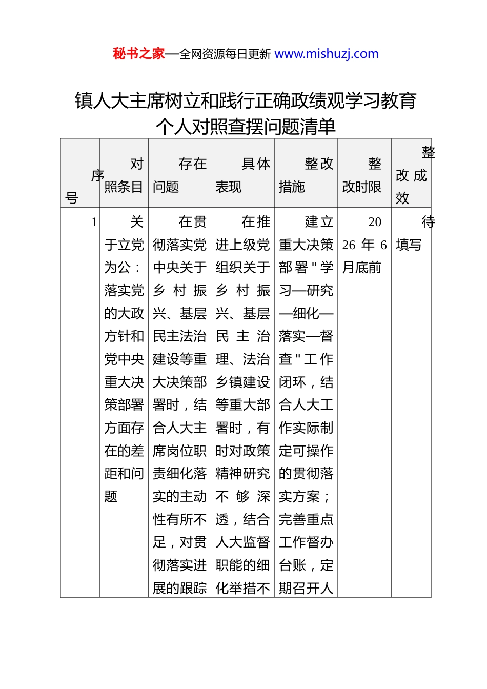 秘书之家—全网资源每日更新 www.mishuzj.com镇人大主席树立和践行正确政绩观学习教育个人对照查摆问题清单 序号对照条目存在问题具 体表现整 改措施整改时限整改 成效1关于立党为公:落实党的大政方针和党中央重大决策部署方面存在的差距和问题在贯彻落实党中央关于乡 村 振兴、基层民主法治建设等重大决策部署时,结合人大主席岗位职责细化落实的主动性有所不足,对贯彻落实进展的跟踪在 推进上级党组织关于乡 村 振兴、基层民 主 治理、法治乡镇建设等重大部署时,有时对政策精神研究不 够 深透,结合人大监督职能的细化举措不建 立重大决策部 署 " 学习—研究—细化—落实—督查 " 工 作闭环,结合人大工作实际制定可操作的贯彻落实方案;完善重点工作督办台账,定期召开人2026 年 6月底前待填写秘书之家—全网资源每日更新 www.mishuzj.com督促还不够及时,部署传达多、跟踪问效少的情形有所体现。够具体;对人大承担的重点工 作 任务,阶段性落实情况的跟踪问效不够及时,对相关工作进展的掌握有时依赖书面汇报,督促推进的力度有待进一 步 加强。大工作调度会通报落 实 进展,确保每项政策部署在人大工作中落 地 见效。2关于立党为公:落实习在学习习近平总书记关于坚持和在 参加镇党委理论学习时,有时将 习近平总书记关于人民代表大2026 年 5月底前待填写秘书之家—全网资源每日更新 www.mishuzj.com近平总书记重要讲话和重要指示批示精神方面存在的差距和问题完善人民代表大会制度、基层民主法治建设等重要论述方面,学习的系统性和深度有 所 不足,将学习成果转化为推动人大工作具体举措的自觉性有 待 加强,学用转化的实效有待提升。偏重于归纳梳理原文,结合人大主席岗位职责和乡镇实际深入研讨的力度还不够;习近平总书记关于人民代表大 会 制度、乡村振兴、基层治理的最新重要论述,转化为人大监督和代表工作具体举措的会制度和基层民主法治重要论述列为个人重点自 学 内容,每次学习后撰写结合本镇实际的学 习 体会;在谋划推进人大重点工作前,带头组织学习相关重要论述,推动理论学习成果在各项工作中具体秘书之家—全网资源每日更新 www.mishuzj.com主动性不足,学用转化的实效有待加强。落实。3关于立党为公:树立 " 全国一盘棋 " 思想、服务服从大局方面存在的差距和问题在统筹人大监督工作与镇党委整体工作大局 关 系上,主动服务服从大局的意识有时不够强,在推进跨部门协调联动工作中合力还有提 升 空间,就人在 推进上级人大统一部署的重点工作时,有时更多关注人大本身职能的落实,对如何通过人大监督工作服务镇党委整体发展大局的主动谋划不够;在配加 强大局意识教育,将人大监督工作与镇党委整体工作紧密结合;主动加强与镇党委、政府和各站所的对接联系,积极融入镇域整体工 作 格局;定期2026 年 6月底前待填写秘书之家—全网资源每日更新 www.mishuzj.com大本位看问题的局限性在个别工作中有 所 体现。合镇党委开展专项工作时,主动对接的积极性有 时 不足;在处理涉及全镇整体利益的重大事项时,全局视野有待进一步拓展,主动补位意识有待加强。研究人大工作与全镇发展大局的结合点,强化服务大局的主动性和 自 觉性。4关于立党为公:对照岗位职责作为乡镇人大主席,在统筹推进人 大 监有 时对人大各项工作推进情况的跟踪了解完 善人大主席岗位职责清单,对照职责逐2026 年 6月底前待填写秘书之家—全网资源每日更新 www.mishuzj.com履职方面存在的差距和问题督、代表联络、依法履职等各项职责方面,日常督促和指导还不够到位,在推进重点工作时系统谋划的深度有待加强,整体履职效能有待进一步提升。不 够 及时,对存在的薄弱环节发现不够早;在统筹推进人大监督、代表联络、依法审议等方面,协调各方力量形成合力的效果有 待 加强;对人大代表履职情况的日常指导和督促有所不足,个别工作项查缺补漏;建立人大工作定期调度机制,加强对各项工作落实情况的日常督促;定期开展人大工作专 项 检查,推动整体履职效 能 提升。秘书之家—全网资源每日更新 ww...