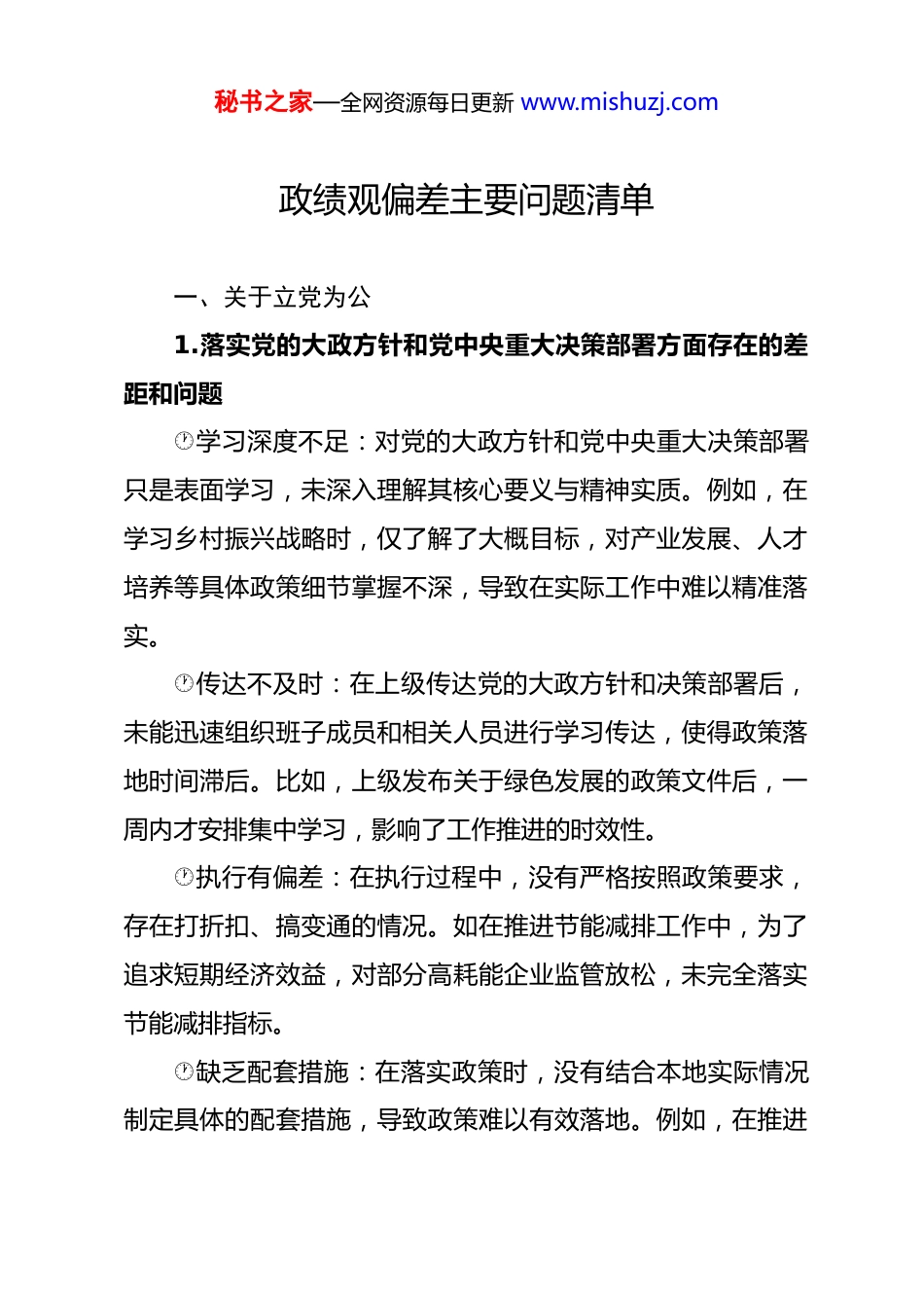 秘书之家—全网资源每日更新 www.mishuzj.com政绩观偏差主要问题清单一、关于立党为公1.落实党的大政方针和党中央重大决策部署方面存在的差距和问题学习深度不足:对党的大政方针和党中央重大决策部署只是表面学习,未深入理解其核心要义与精神实质。例如,在学习乡村振兴战略时,仅了解了大概目标,对产业发展、人才培养等具体政策细节掌握不深,导致在实际工作中难以精准落实。传达不及时:在上级传达党的大政方针和决策部署后,未能迅速组织班子成员和相关人员进行学习传达,使得政策落地时间滞后。比如,上级发布关于绿色发展的政策文件后,一周内才安排集中学习,影响了工作推进的时效性。执行有偏差:在执行过程中,没有严格按照政策要求,存在打折扣、搞变通的情况。如在推进节能减排工作中,为了追求短期经济效益,对部分高耗能企业监管放松,未完全落实节能减排指标。缺乏配套措施:在落实政策时,没有结合本地实际情况制定具体的配套措施,导致政策难以有效落地。例如,在推进秘书之家—全网资源每日更新 www.mishuzj.com数字乡村建设时,没有考虑本地网络基础设施薄弱的问题,未制定针对性的网络建设方案。监督检查不到位:对政策落实情况缺乏有效的监督检查机制,不能及时发现和解决执行过程中出现的问题。如在扶贫政策落实过程中,对扶贫资金的使用和项目进展情况监督不力,导致部分资金被挪用。协同配合不足:在落实政策过程中,各部门之间缺乏有效的协同配合,存在各自为政的现象。例如,在推进城市建设过程中,规划部门、建设部门和环保部门之间沟通不畅,导致项目建设出现重复施工、资源浪费等问题。忽视长期效果:过于注重短期政绩,忽视了政策的长期效果和可持续发展。如在发展旅游业时,过度开发旅游资源,破坏了生态环境,影响了旅游业的长期发展。缺乏创新意识:在落实政策时,习惯于按照传统方式方法执行,缺乏创新意识和探索精神。例如,在推进政务服务改革时,没有充分利用互联网技术,仍然采用传统的办事流程,导致办事效率低下。宣传不到位:对党的大政方针和决策部署宣传力度不够,群众对政策的知晓度和参与度不高。如在推广垃圾分类政策时,宣传方式单一,仅通过张贴海报进行宣传,没有开展深入的宣秘书之家—全网资源每日更新 www.mishuzj.com传活动,导致群众对垃圾分类的重要性认识不足。对新政策适应慢:面对新出台的政策,不能及时调整工作思路和方法,适应新政策的要求。例如,在国家出台新的税收政策后,财务人员未能及时学习和掌握新政策,导致企业纳税申报出现错误。2.落实习近平总书记重要讲话和重要指示批示精神方面存在的差距和问题学习不系统:对习近平总书记重要讲话和重要指示批示精神的学习缺乏系统性,碎片化学习较多,没有形成完整的知识体系。例如,在学习习近平总书记关于生态文明建设的重要讲话时,只关注了部分内容,没有全面深入学习。理解不深刻:对习近平总书记重要讲话和重要指示批示精神的理解停留在表面,没有深入领会其内涵和精神实质。如在学习习近平总书记关于乡村振兴的重要指示时,没有理解乡村振兴的全面性和系统性,只注重产业发展,忽视了生态、文化等方面的建设。落实不坚决:在落实习近平总书记重要讲话和重要指示批示精神时,存在打折扣、搞变通的情况。例如,在推进长江经济带生态保护工作中,没有严格按照总书记“共抓大保护、不搞大开发”的要求,仍然存在一些违规开发行为。秘书之家—全网资源每日更新 www.mishuzj.com缺乏跟踪问效:对习近平总书记重要讲话和重要指示批示精神的落实情况缺乏跟踪问效机制,不能及时掌握工作进展和存在的问题。如在落实总书记关于脱贫攻坚的重要指示时,对脱贫成效的跟踪评估不够及时,导致部分脱贫户出现返贫现象。结合实际不够:在落实习近平总书记重要讲话和重要指示批示精神时,没有结合本地实际情况,生搬硬套,导致政策执行效果不佳。例如,在推进农村厕所革命时,没有考虑本地的地理环境和群众生活习惯,采用了不适合的改厕模式,造成资源浪费。宣传教育不足:对习近平总书记重要讲话和重要指示批示精神的宣传教育不够深入,...