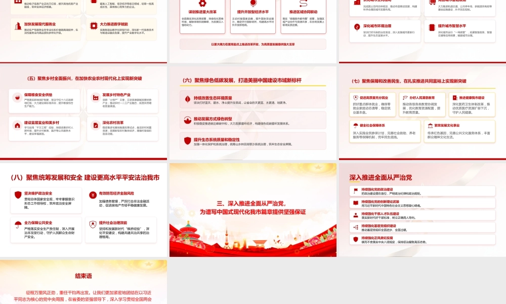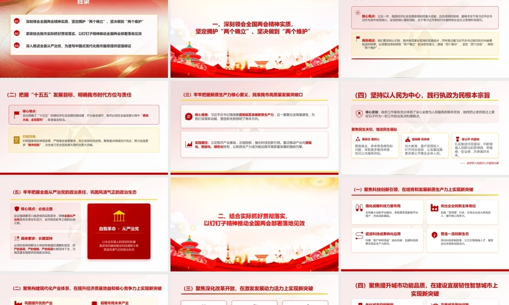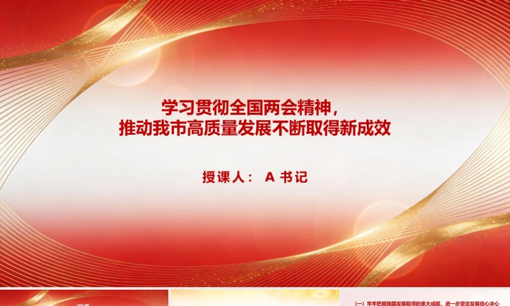 学习贯彻全国两会精神,推动我市高质量发展不断取得新成效授 课 人 : A 书 记目录01深刻领会全国两会精神实质,坚定拥护“两个确立”、坚决做到“两个维护”02紧密结合我市实际抓好贯彻落实,以钉钉子精神推动全国两会部署落地见效03深入推进全面从严治党,为谱写中国式现代化我市篇章提供坚强保证一、深刻领会全国两会精神实质,坚定拥护“两个确立”、坚决做到“两个维护”(一)牢牢把握我国发展取得的重大成就,进一步坚定发展信心决心核心观点:过去一年,我国经济社会发展取得新的重大成就,这些成绩的取得,最根本在于有习近平总书记作为党中央的核心、全党的核心掌舵领航,在于有习近平新时代中国特色社会主义思想科学指引。具体阐述:我们要深刻认识到,我市各项事业取得的发展进步,同样是沿着习近平总书记指引的方向奋勇前进的结果。必须更加深刻领悟“两个确立”的决定性意义,增强“四个意识”、坚定“四个自信”、做到“两个维护”。(二)把握“十五五”发展目标,明确我市时代方位与责任核心观点:会议明确了“十五五”时期经济社会发展的路线图,作为省会城市,我市必须在全省发展大局中“勇挑大梁、走在前列”,彰显省会担当。行动方向:对照国家规划审视发展,严格落实省委要求,充分发挥综合优势。聚焦重点领域先行先试,努力创造更多“我市经验”,为全省乃至全国发展大局作出更大贡献。(三)牢牢把握新质生产力核心要义,找准我市高质量发展突破口核心遵循:习近平总书记强调要因地制宜发展新质生产力,这一重要论述高屋建瓴,为我们培育新动能、塑造新优势指明了根本方向。实践路径:立足我市产业基础,正视短板,强化科技创新引领。重点推动产业向高端化、智能化、绿色化转型,让新质生产力成为驱动我市高质量发展的强劲引擎。(四)坚持以人民为中心,践行执政为民根本宗旨核心宗旨:政府工作报告充分体现了全心全意为人民服务的根本宗旨,始终把让老百姓过上更好日子作为一切工作的出发点和落脚点。聚焦民生关切,增进民生福祉惠民生 暖民心聚焦就业、养老等急难愁盼问题,采取更多惠民举措,优化公共服务供给。强保障 优供给加大教育、医疗资源投入,补齐民生短板,让发展成果更多更公平惠及全体人民。促公平 共富裕扎实推进共同富裕,不断增强人民群众的获得感、幸福感、安全感,共享美好未来。—— 始终把人民放在心中最高位置(五)牢牢把握全面从严治党的政治责任,巩固风清气正的政治生态核心观点:必由之路会议强调要深入推进党的自我革命,明确全面从严治党是党永葆生机活力、走好新的赶考之路的必由之路。具体要求:长期坚持必须时刻保持解决大党独有难题的清醒和坚定,把严的基调、严的措施、严的氛围长期坚持下去,为高质量发展提供坚强政治保证。自我革命 · 从严治党以永远在路上的坚韧和执着推进党风廉政建设和反腐败斗争营造风清气正的政治生态二、结合实际抓好贯彻落实,以钉钉子精神推动全国两会部署落地见效(一)聚焦科技创新引领,在培育和发展新质生产力上实现新突破强化战略科技力量布局支持重大创新平台建设,争取更多国家级平台落户,夯实创新基础。突出企业创新主体地位实施“双倍增”行动,引导企业加大研发投入,提升核心竞争力。促进科技成果转化应用完善“政产学研用金”结合机制,加速科技成果向现实生产力转化。营造一流创新生态深化科技体制改革,大力引育高端人才,激发全社会创新创造活力。(二)聚焦构建现代化产业体系,在提升经济质量效益和核心竞争力上实现新突破巩固提升优势产业推动电子信息产业迈向万亿级,提升其他优势产业能级,筑牢实体经济根基。前瞻布局未来产业瞄准人工智能、低空经济等前沿领域,培育一批高成长性、具有核心竞争力的企业。加快发展现代服务业推动生产性服务业向专业化和价值链高端延伸,生活性服务业向高品质和多样化升级。大力推进数字赋能实施制造业数字化转型行动,深化新一代信息技术与制造业融合发展,提升产业数字化水平。(三)聚焦深化改革开放,在激发发展动力活力上实现新突破谋划推进重大改革全面落实深化改革部署,持续优化营商环境,破除体制机制障碍,为...