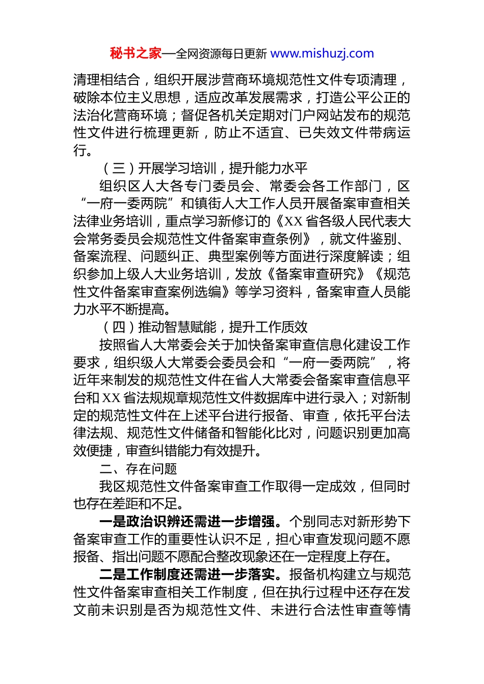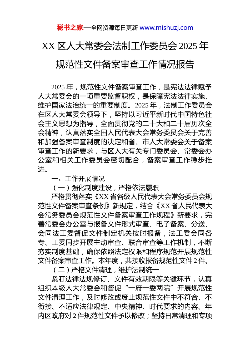 秘书之家—全网资源每日更新 www.mishuzj.comXX 区人大常委会法制工作委员会 2025 年规范性文件备案审查工作情况报告2025 年,规范性文件备案审查工作,是宪法法律赋予人大常委会的一项重要监督职权,是保障宪法法律实施、维护国家法治统一的重要制度。2025 年,法制工作委员会在区人大常委会领导下,坚持以习近平新时代中国特色社会主义思想为指导,全面贯彻党的二十大和二十届历次全会精神,认真落实全国人民代表大会常务委员会关于完善和加强备案审查制度的决定和省、市人大常委会关于备案审查工作的新要求,与区人大有关专门委员会、常委会办公室和相关工作委员会密切配合,备案审查工作稳步推进。一、工作开展情况(一)强化制度建设,严格依法履职严格贯彻落实《XX 省各级人民代表大会常务委员会规范性文件备案审查条例》新规定,结合《XX 省人民代表大会常务委员会规范性文件备案审查工作规程》新要求,完善常委会办公室与报备文件形式审查、电子备案、分送、会同法工委督促文件制定机关按时报备,法工委会同各专、工委同步开展主动审查、联合审查等工作机制,不断夯实制度基础,确保依照法定权限和程序规范开展规范性文件备案审查工作。本年度,共接收报备规范性文件 2 件。(二)严格文件清理,维护法制统一紧盯法律法规修订、文件有效期限等关键环节,认真组织本级人大常委会和督促“一府一委两院”开展规范性文件清理工作,及时修改或废止规范性文件中不符合、不衔接、不适应法律规定、中央精神、时代要求的内容。年内区政府对 2 件规范性文件予以修改;坚持日常清理和专项秘书之家—全网资源每日更新 www.mishuzj.com清理相结合,组织开展涉营商环境规范性文件专项清理,破除本位主义思想,适应改革发展需求,打造公平公正的法治化营商环境;督促各机关定期对门户网站发布的规范性文件进行梳理更新,防止不适宜、已失效文件带病运行。(三)开展学习培训,提升能力水平组织区人大各专门委员会、常委会各工作部门,区“一府一委两院”和镇街人大工作人员开展备案审查相关法律业务培训,重点学习新修订的《XX 省各级人民代表大会常务委员会规范性文件备案审查条例》,就文件鉴别、备案流程、问题纠正、典型案例等方面进行深度解读;组织参加上级人大业务培训,发放《备案审查研究》《规范性文件备案审查案例选编》等学习资料,备案审查人员能力水平不断提高。(四)推动智慧赋能,提升工作质效按照省人大常委会关于加快备案审查信息化建设工作要求,组织级人大常委会委员会和“一府一委两院”,将近年来制发的规范性文件在省人大常委会备案审查信息平台和 XX 省法规规章规范性文件数据库中进行录入;对新制定的规范性文件在上述平台进行报备、审查,依托平台法律法规、规范性文件储备和智能化比对,问题识别更加高效便捷,审查纠错能力有效提升。二、存在问题我区规范性文件备案审查工作取得一定成效,但同时也存在差距和不足。一是政治识辨还需进一步增强。个别同志对新形势下备案审查工作的重要性认识不足,担心审查发现问题不愿报备、指出问题不愿配合整改现象还在一定程度上存在。二是工作制度还需进一步落实。报备机构建立与规范性文件备案审查相关工作制度,但在执行过程中还存在发文前未识别是否为规范性文件、未进行合法性审查等情秘书之家—全网资源每日更新 www.mishuzj.com况,导致漏报、迟报问题发生。三是监督力度还需进一步加大。备案审查工作涉及面广、专业性强,现有备案审查工作队伍人员较少,业务能力有限,审查质量不高;针对未及时报送或漏报、瞒报情况,仍缺乏刚性责任追究手段。三、下一步工作(一)深化思想认识,强化组织保障深入学习贯彻习近平法治思想以及习近平总书记关于备案审查工作的重要论述,坚持以保障法律法规正确实施、贯彻落实全面依法治国决策部署为目标,将备案审查工作作为人大常委会年度重点工作项目内容,常委会会议定期听取和审议法工委备案审查工作情况报告,适时听取“一府一委两院”备案审查工作情况报告,切实推动备案审查工作深入开展、取得新成效、再上新台阶。(二)坚持问题导向,增强监督实效认真...