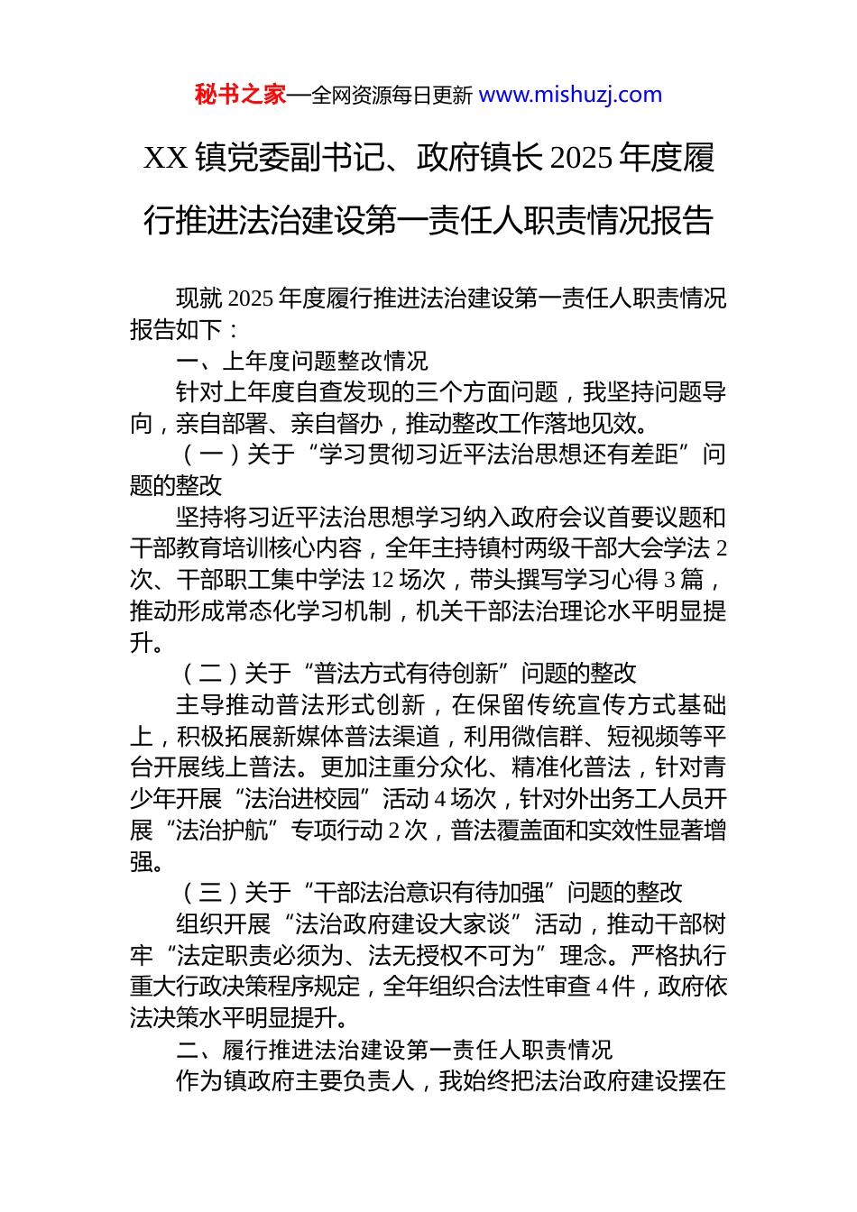 秘书之家—全网资源每日更新 www.mishuzj.comXX 镇党委副书记、政府镇长 2025 年度履行推进法治建设第一责任人职责情况报告现就 2025 年度履行推进法治建设第一责任人职责情况报告如下:一、上年度问题整改情况针对上年度自查发现的三个方面问题,我坚持问题导向,亲自部署、亲自督办,推动整改工作落地见效。(一)关于“学习贯彻习近平法治思想还有差距”问题的整改坚持将习近平法治思想学习纳入政府会议首要议题和干部教育培训核心内容,全年主持镇村两级干部大会学法 2次、干部职工集中学法 12 场次,带头撰写学习心得 3 篇,推动形成常态化学习机制,机关干部法治理论水平明显提升。(二)关于“普法方式有待创新”问题的整改主导推动普法形式创新,在保留传统宣传方式基础上,积极拓展新媒体普法渠道,利用微信群、短视频等平台开展线上普法。更加注重分众化、精准化普法,针对青少年开展“法治进校园”活动 4 场次,针对外出务工人员开展“法治护航”专项行动 2 次,普法覆盖面和实效性显著增强。(三)关于“干部法治意识有待加强”问题的整改组织开展“法治政府建设大家谈”活动,推动干部树牢“法定职责必须为、法无授权不可为”理念。严格执行重大行政决策程序规定,全年组织合法性审查 4 件,政府依法决策水平明显提升。二、履行推进法治建设第一责任人职责情况作为镇政府主要负责人,我始终把法治政府建设摆在秘书之家—全网资源每日更新 www.mishuzj.com全局工作的重要位置,认真履行推进法治建设第一责任人职责,带头尊法学法守法用法,推动法治政府建设取得新成效。(一)强化组织领导,夯实法治建设根基坚持把法治政府建设与经济社会发展同部署、同推进、同督促、同考核,及时研究解决“七中心合一”建设、综合行政执法改革等重点难点问题。制定年度法治政府建设工作计划,明确目标任务、责任分工和时限要求,层层压实责任。将法治建设纳入村级年度目标责任考核,占比提高到 10%,推动形成一级抓一级、层层抓落实的工作格局。(二)依法全面履职,提升政务服务效能深入推进“放管服”改革,持续优化营商环境,全年受理陇南市政务服务事项 114 件,办结 114 件,办结率100%。高标准建成“七中心合一”一站式治理的社会治安综合治理中心,整合司法所、派出所、交警中队等力量,推行“433”社会治安综合治理模式。联合相关部门常态化开展“日查夜巡”,全年受理矛盾纠纷 425 件,化解 418 件,化解率 98.3%,剩余 7 件落实“五位一体”包案责任制,社会大局保持和谐稳定。(三)严格依法决策,规范行政权力运行严格执行重大行政决策法定程序,建立健全政府法律顾问制度,落实重大决策合法性审查机制,全年组织合法性审查 2 件。全面推进政务公开,通过政府网站、政务公开栏等渠道,及时公开财政预算、重大项目、民生保障等重点领域信息,自觉接受人大、政协、纪检监察及社会监督。加强对政府内部层级监督,推动完善专门监督,纠正行政不作为、乱作为,行政复议纠错率控制在合理区间。(四)深化普法宣传,营造浓厚法治氛围组织实施“八五”普法规划,推动落实“谁执法谁普法”责任制。全年组织开展“3・15”消费者权益保护日、秘书之家—全网资源每日更新 www.mishuzj.com“6・26”国际禁毒日、“12・4”国家宪法日等大型法治宣传活动 15 场次,发放宣传资料 1000 余份,解答群众咨询 20余人次。加强对重点对象普法,举办各类法治讲座 10 场次,培训人员 132 余人次。带头讲法治课 2 次,做学法用法表率。(五)优化法律服务,践行法治为民宗旨推动建立镇公共法律服务中心和村级公共法律服务站,配备必要办公设施和人员,制定工作制度和服务流程,为群众提供法律咨询、法律援助、人民调解等一站式法律服务。全年接待群众咨询 50 余人次,办理法律援助案件 2 件。组织开展法律服务进乡村活动 4 场次,为群众提供法律咨询 60 余人次。三、存在的问题对照新时代法治政府建设新要求,结合工作实际,我认真梳理分析,当前法治建设还存在以下突出问题和短板不足:(一)理论学习的深度和系统性有待加强对习近平法治思...