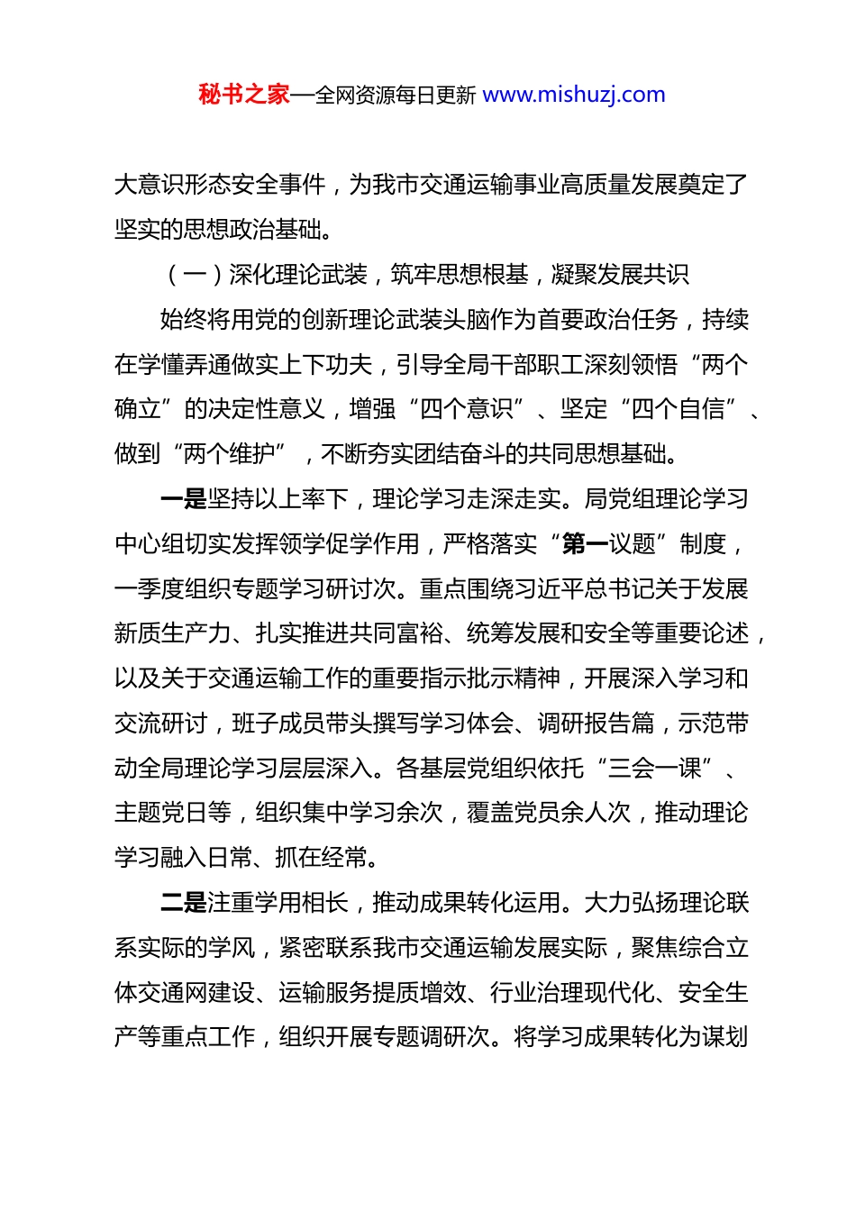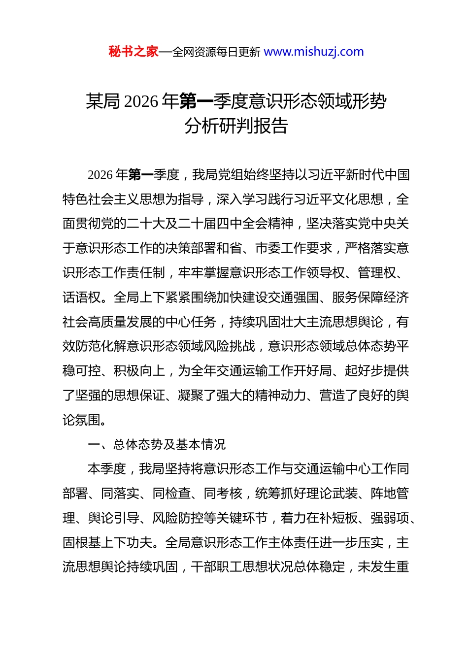秘书之家—全网资源每日更新 www.mishuzj.com某局 2026 年第一季度意识形态领域形势分析研判报告 2026 年第一季度,我局党组始终坚持以习近平新时代中国特色社会主义思想为指导,深入学习践行习近平文化思想,全面贯彻党的二十大及二十届四中全会精神,坚决落实党中央关于意识形态工作的决策部署和省、市委工作要求,严格落实意识形态工作责任制,牢牢掌握意识形态工作领导权、管理权、话语权。全局上下紧紧围绕加快建设交通强国、服务保障经济社会高质量发展的中心任务,持续巩固壮大主流思想舆论,有效防范化解意识形态领域风险挑战,意识形态领域总体态势平稳可控、积极向上,为全年交通运输工作开好局、起好步提供了坚强的思想保证、凝聚了强大的精神动力、营造了良好的舆论氛围。一、总体态势及基本情况本季度,我局坚持将意识形态工作与交通运输中心工作同部署、同落实、同检查、同考核,统筹抓好理论武装、阵地管理、舆论引导、风险防控等关键环节,着力在补短板、强弱项、固根基上下功夫。全局意识形态工作主体责任进一步压实,主流思想舆论持续巩固,干部职工思想状况总体稳定,未发生重秘书之家—全网资源每日更新 www.mishuzj.com大意识形态安全事件,为我市交通运输事业高质量发展奠定了坚实的思想政治基础。(一)深化理论武装,筑牢思想根基,凝聚发展共识始终将用党的创新理论武装头脑作为首要政治任务,持续在学懂弄通做实上下功夫,引导全局干部职工深刻领悟“两个确立”的决定性意义,增强“四个意识”、坚定“四个自信”、做到“两个维护”,不断夯实团结奋斗的共同思想基础。一是坚持以上率下,理论学习走深走实。局党组理论学习中心组切实发挥领学促学作用,严格落实“第一议题”制度,一季度组织专题学习研讨次。重点围绕习近平总书记关于发展新质生产力、扎实推进共同富裕、统筹发展和安全等重要论述,以及关于交通运输工作的重要指示批示精神,开展深入学习和交流研讨,班子成员带头撰写学习体会、调研报告篇,示范带动全局理论学习层层深入。各基层党组织依托“三会一课”、主题党日等,组织集中学习余次,覆盖党员余人次,推动理论学习融入日常、抓在经常。二是注重学用相长,推动成果转化运用。大力弘扬理论联系实际的学风,紧密联系我市交通运输发展实际,聚焦综合立体交通网建设、运输服务提质增效、行业治理现代化、安全生产等重点工作,组织开展专题调研次。将学习成果转化为谋划秘书之家—全网资源每日更新 www.mishuzj.com工作的思路、破解难题的举措、推动发展的能力,例如,在优化公交线网布局、提升农村公路管养水平、推进智慧交通建设等具体工作中,自觉运用新发展理念指导实践,形成了一批具有针对性、操作性的工作方案和政策建议,切实将学习成效体现到推动交通运输高质量发展的实际行动上。三是创新方式载体,激发全员学习热情。积极适应新时代干部职工学习特点,创新学习形式和载体。开设“交通大讲堂”,邀请专家学者、业务骨干授课期;举办“书香交通”读书分享会、“青年思享汇”等活动场;充分利用“学习强国”学习平台、局内网学习专栏、微信公众号等线上阵地,推送学习资料、交流学习心得。通过线上线下相结合、集中学习与个人自学相补充,营造了浓厚的学习氛围,有效提升了理论学习的吸引力和感染力,干部职工的政治素养和理论水平得到进一步提升。(二)强化阵地建设,规范宣传管理,壮大主流舆论深刻认识意识形态阵地的极端重要性,坚持守土有责、守土负责、守土尽责,不断加强各类意识形态阵地的建设、管理和运用,确保可管可控、风清气正,持续巩固壮大奋进新时代的主流思想舆论。一是严格内容审核,管好用好自有平台。严格执行信息发秘书之家—全网资源每日更新 www.mishuzj.com布“三审三校”制度,对局官方网站、微信公众号、内部刊物、宣传栏等各类宣传载体发布的信息内容进行严格政治把关和内容审核,确保导向正确、内容准确、表述规范。一季度,局属各平台累计发布各类信息余条,未出现任何政治性、导向性错误。同时,加强对局属单位网站、新媒体账号的日常监管和指导,定期开展排查清理,确保全局宣传阵地规范...