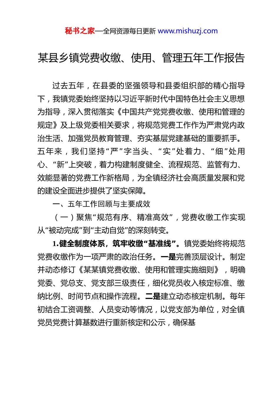 秘书之家—全网资源每日更新 www.mishuzj.com某县乡镇党费收缴、使用、管理五年工作报告 过去五年,在县委的坚强领导和县委组织部的精心指导下,我镇党委始终坚持以习近平新时代中国特色社会主义思想为指导,深入贯彻落实《中国共产党党费收缴、使用和管理的规定》及上级党委相关要求,将规范党费工作作为严肃党内政治生活、加强党员教育管理、夯实基层党建基础的重要抓手。“”“”“”五年来,我们坚持 严 字当头、 实 处着力、 细 处用“”心、 新 上突破,着力构建制度健全、流程规范、监管有力、效能显著的党费工作新格局,为全镇经济社会高质量发展和党的建设全面进步提供了坚实保障。一、五年工作回顾与主要成效(一)“”聚焦 规范有序、精准高效 ,党费收缴工作实现“”“”从 被动完成 到 主动自觉 的深刻转变。1.“”健全制度体系,筑牢收缴 基准线 。镇党委始终将规范党费收缴作为一项严肃的政治任务。一是完善顶层设计。制定并动态修订《某某镇党费收缴、使用和管理实施细则》,明确党委、党总支、党支部三级责任,细化党员收入核定标准、缴纳比例、时间节点和操作流程。二是建立动态核定机制。每年初结合工资调整、人员变动等情况,以党支部为单位,对全镇党员党费计算基数进行重新核定和公示,确保基秘书之家—全网资源每日更新 www.mishuzj.com数准确、标准统一。针对农村党员、离退休党员、流动党员、非公有制经济组织和社会组织党员等不同群体特点,分类制定收缴指引,确保全覆盖、无遗漏。三是强化政策宣传与教育。将党费收缴规定纳入党员日常教育、主题党日、新党员培训的重要内容,通过书记讲党课、发放明白卡、微信群推送等方式,反复宣讲按时足额交纳党费是党员应尽义务和基本要求,有效增强了党员的组织观念和缴费自觉性。2.“”创新收缴方式,打通便捷 快车道 。为适应新时代党员流动性增强、支付方式多元化的特点,积极探索便捷高效的收缴模式。一是“”推广线上缴费平台。依托 复兴壹号 等党建信息化平台或本地政务 APP,开通党费线上缴纳功能,支持微信、支付宝、银联等多种支付方式,方便党员特别是流动党员、年轻党员随时随地缴纳党费。二是保留线下传统渠道。充分考虑农村老党员、不熟悉智能手机操作党员的实际,保留党支部现场收取、委托代缴等传统方式,并提供必要帮助。三是“实行 党”“”费交纳日 制度。固定每月或每季度某一天为 党费交纳日 ,集中提醒、集中收取,培养党员定期交纳的习惯。五年来,全镇党员党费自觉缴纳率从 2021 年的 85%稳步提升至 2025 年的99.2%,拖欠现象基本杜绝。3.“”严格过程管理,拧紧责任 螺丝扣 。一是规范收缴手续。统一使用中组部规定的《党费证》,详细记录党员交纳情况。党支部指定专人负责收缴,及时开具收据,按时将党费秘书之家—全网资源每日更新 www.mishuzj.com存入上级党组织指定账户或镇党费专用账户,严禁个人长期保管。二是落实公示公开。各党支部每季度在党务公开栏公示党费收缴情况,包括党员名单、应交数额、实交数额等,接受党员群众监督。镇党委每年向全镇党组织和党员代表报告党费收支情况。三是加强督促检查。将党费收缴情况纳入基层党建年度考核和党组织书记述职评议内容。镇党委组织部门定期开展专项检查或随机抽查,对收缴不及时、管理不规范的党组织进行提醒、通报,并督促整改。(二)“”聚焦 围绕中心、服务大局 ,党费使用效能实现“”“”从 保障基本 到 激励提升 的持续优化。1.“”严格遵循使用范围,确保 好钢用在刀刃上 。始终坚持党费用于党的活动的基本定位,严格限定使用范围。五年来,镇管党费支出重点投向以下方面:一是党员教育培训。累计投入某某万元,用于举办各类党员轮训班、专题培训班、现场教学,购买学习资料,建设远程教育站点等,培训党员某万余人次,有力提升了党员队伍素质。二是订阅党报党刊和学习教育资料。每年安排专项经费,为基层党组织和困难党员订阅《人民日报》、《求是》等党报党刊,购买党史、党章及重要理论学习读本。三是“开展党内活动。支持各党支部开展 三会一”课 、主题党日、组织生活会...