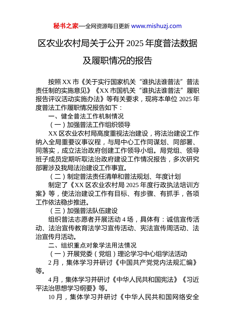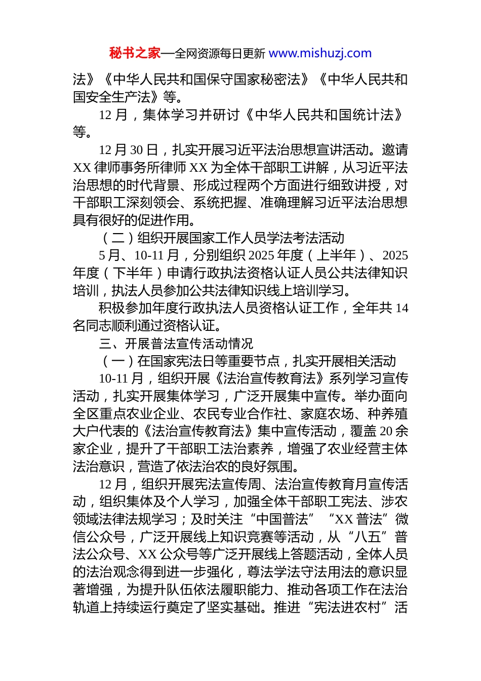 秘书之家—全网资源每日更新 www.mishuzj.com区农业农村局关于公开 2025 年度普法数据及履职情况的报告按照 XX 市《关于实行国家机关“谁执法谁普法”普法责任制的实施意见》《XX 市国机关“谁执法谁普法”履职报告评议活动实施办法》等有关要求,现将本单位 2025 年度普法工作履职情况报告如下:一、健全普法工作机制情况(一)加强普法工作组织领导XX 区农业农村局高度重视法治建设,将法治建设工作纳入全局重要议事议程,与局中心工作同谋划、同部署、同落实,成立法治政府创建工作领导小组。局党组、领导班子成员定期听取法治政府建设工作情况报告,多次研究部署涉及我局法治建设工作事宜。(二)制定普法责任清单和普法规划、年度计划制定了《XX 区农业农村局 2025 年度行政执法培训方案》等,使法治建设工作有目标、有步骤、有抓手,各项工作依法稳步推进。(三)加强普法队伍建设组织普法志愿者开展活动 4 场,具体有:诚信宣传活动、法治宣传教育法学习宣传活动、宪法宣传周活动、法治宣传月活动。二、组织重点对象学法用法情况(一)开展党委(党组)理论学习中心组学法活动2 月,集体学习并研讨《中国共产党党内法规汇编》等。4 月,集体学习并研讨《中华人民共和国宪法》《习近平法治思想学习纲要》等。10 月,集体学习并研讨《中华人民共和国网络安全秘书之家—全网资源每日更新 www.mishuzj.com法》《中华人民共和国保守国家秘密法》《中华人民共和国安全生产法》等。12 月,集体学习并研讨《中华人民共和国统计法》等。12 月 30 日,扎实开展习近平法治思想宣讲活动。邀请XX 律师事务所律师 XX 为全体干部职工讲解,从习近平法治思想的时代背景、形成过程两个方面进行细致讲授,对干部职工深刻领会、系统把握、准确理解习近平法治思想具有很好的促进作用。(二)组织开展国家工作人员学法考法活动5 月、10-11 月,分别组织 2025 年度(上半年)、2025年度(下半年)申请行政执法资格认证人员公共法律知识培训,执法人员参加公共法律知识线上培训学习。积极参加年度行政执法人员资格认证工作,全年共 14名同志顺利通过资格认证。三、开展普法宣传活动情况(一)在国家宪法日等重要节点,扎实开展相关活动10-11 月,组织开展《法治宣传教育法》系列学习宣传活动,扎实开展集体学习,广泛开展集中宣传。举办面向全区重点农业企业、农民专业合作社、家庭农场、种养殖大户代表的《法治宣传教育法》集中宣传活动,覆盖 20 余家企业,提升了干部职工法治素养,增强了农业经营主体法治意识,营造了依法治农的良好氛围。12 月,组织开展宪法宣传周、法治宣传教育月宣传活动,组织集体及个人学习,加强全体干部职工宪法、涉农领域法律法规学习;及时关注“中国普法”“XX 普法”微信公众号,广泛开展线上知识竞赛等活动,从“八五”普法公众号、XX 公众号等广泛开展线上答题活动,全体人员的法治观念得到进一步强化,尊法学法守法用法的意识显著增强,为提升队伍依法履职能力、推动各项工作在法治轨道上持续运行奠定了坚实基础。推进“宪法进农村”活秘书之家—全网资源每日更新 www.mishuzj.com动,开展送法下乡 5 次,发放宣传资料数百份,覆盖群众数百人次;向村民发放《XX 省农产品质量安全监督管理规定》等宣传材料,向村民普及农业生产、农产品质量安全等相关知识,在各农户张贴普法宣传海报,现场介绍相关政策法规重点内容,解答农户问题,有效提升了群众的宪法意识和法治素养,营造了尊法学法守法用法的浓厚社会氛围。(二)围绕重点工作开展普法活动9 月,组织开展诚信宣传活动,前往商户及基层村社、进行一对一讲解,重点解读《XX 省社会信用条例》核心内容,宣读“XXYY”倡议书,发放宣传资料 130 余份,普及了社会信用体系建设相关政策知识,为“XXYY”建设营造共同参与的积极氛围。严格履行主要负责人法治建设第一责任人职责,成立以局主要领导为组长、各分管领导为副组长、相关业务科室为成员的全面统筹推进专项普法工作小组,及时召开相关会议,传达相关会议精神,同时将优化营商环境相关情况纳入日常办公会,对涉...