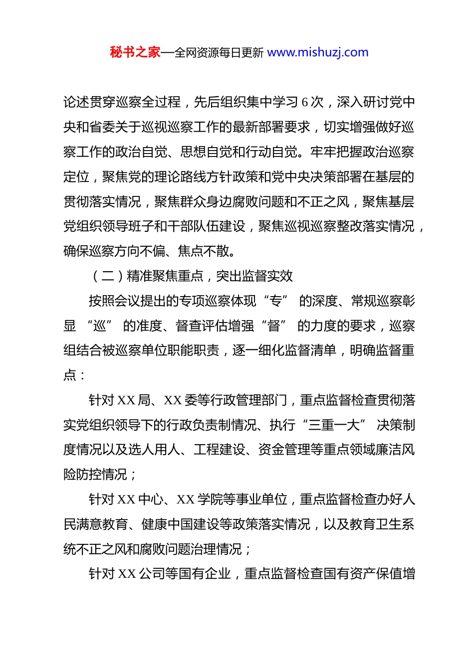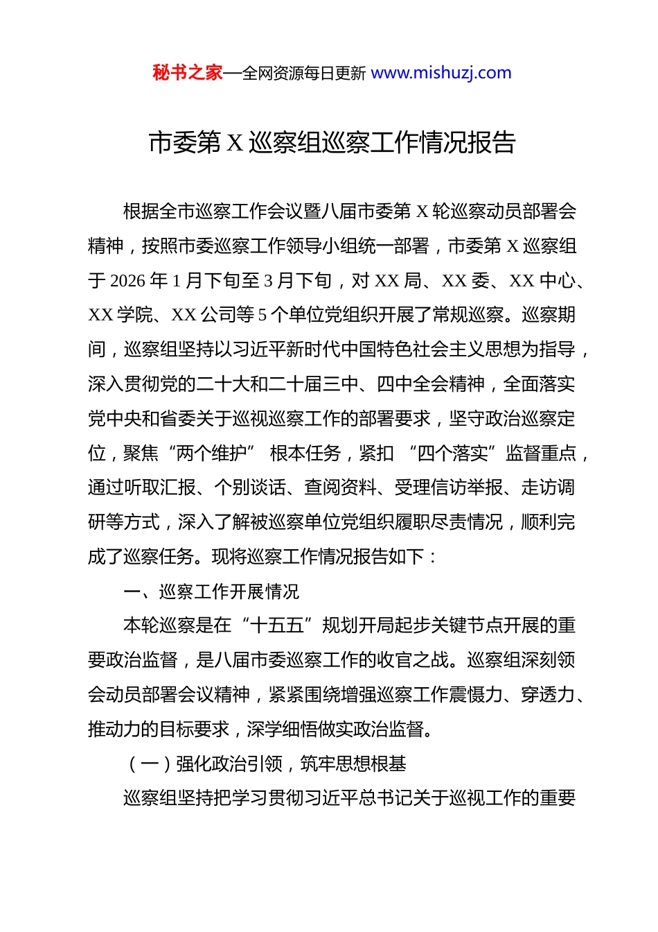 秘书之家—全网资源每日更新 www.mishuzj.com市委第 X 巡察组巡察工作情况报告 根据全市巡察工作会议暨八届市委第 X 轮巡察动员部署会精神,按照市委巡察工作领导小组统一部署,市委第 X 巡察组于 2026 年 1 月下旬至 3 月下旬,对 XX 局、XX 委、XX 中心、XX 学院、XX 公司等 5 个单位党组织开展了常规巡察。巡察期间,巡察组坚持以习近平新时代中国特色社会主义思想为指导,深入贯彻党的二十大和二十届三中、四中全会精神,全面落实党中央和省委关于巡视巡察工作的部署要求,坚守政治巡察定位,聚焦“两个维护” 根本任务,紧扣 “四个落实”监督重点,通过听取汇报、个别谈话、查阅资料、受理信访举报、走访调研等方式,深入了解被巡察单位党组织履职尽责情况,顺利完成了巡察任务。现将巡察工作情况报告如下:一、巡察工作开展情况本轮巡察是在“十五五”规划开局起步关键节点开展的重要政治监督,是八届市委巡察工作的收官之战。巡察组深刻领会动员部署会议精神,紧紧围绕增强巡察工作震慑力、穿透力、推动力的目标要求,深学细悟做实政治监督。(一)强化政治引领,筑牢思想根基巡察组坚持把学习贯彻习近平总书记关于巡视工作的重要秘书之家—全网资源每日更新 www.mishuzj.com论述贯穿巡察全过程,先后组织集中学习 6 次,深入研讨党中央和省委关于巡视巡察工作的最新部署要求,切实增强做好巡察工作的政治自觉、思想自觉和行动自觉。牢牢把握政治巡察定位,聚焦党的理论路线方针政策和党中央决策部署在基层的贯彻落实情况,聚焦群众身边腐败问题和不正之风,聚焦基层党组织领导班子和干部队伍建设,聚焦巡视巡察整改落实情况,确保巡察方向不偏、焦点不散。(二)精准聚焦重点,突出监督实效按照会议提出的专项巡察体现“专” 的深度、常规巡察彰显 “巡” 的准度、督查评估增强“督” 的力度的要求,巡察组结合被巡察单位职能职责,逐一细化监督清单,明确监督重点:针对 XX 局、XX 委等行政管理部门,重点监督检查贯彻落实党组织领导下的行政负责制情况、执行“三重一大” 决策制度情况以及选人用人、工程建设、资金管理等重点领域廉洁风险防控情况;针对 XX 中心、XX 学院等事业单位,重点监督检查办好人民满意教育、健康中国建设等政策落实情况,以及教育卫生系统不正之风和腐败问题治理情况;针对 XX 公司等国有企业,重点监督检查国有资产保值增秘书之家—全网资源每日更新 www.mishuzj.com值、企业改革发展、党风廉政建设等情况。(三)创新方式方法,提升巡察质量巡察组坚持守正创新,综合运用多种方式发现问题:广泛开展个别谈话,累计谈话 186 人次,覆盖被巡察单位领导班子成员、中层干部、基层代表以及服务对象,深入了解干部群众反映强烈的突出问题;深入查阅档案资料,调阅党建、人事、财务、项目等各类资料 2800 余份,梳理分析制度执行、资金使用、项目管理等方面存在的问题;认真受理信访举报,设置专门举报信箱和电话,受理群众来信来访来电 43 件次,从中发现问题线索;实地走访调研,深入基层单位、项目现场、服务窗口等场所开展实地和实地检查,核实了解政策落实和工作推进情况;强化贯通融合,加强与纪检监察、组织人事、审计财政等部门的协作配合,充分运用已有监督成果,提高巡察精准度。(四)严明纪律作风,树立良好形象巡察组严格执行中央八项规定及其实施细则精神,严守巡察工作纪律,坚持实事求是、依规依纪依法开展工作。建立组务会工作议事规则,重大问题集体研究决定。严格遵守保密纪律,不泄露巡察工作秘密。坚持同题共答,与被巡察单位党组织坦诚沟通、形成共识。巡察期间未发生任何违规违纪行为,秘书之家—全网资源每日更新 www.mishuzj.com树立了巡察干部良好形象。二、巡察发现的主要问题通过深入巡察,共发现各类问题 157 个,其中政治建设方面问题 28 个、思想建设方面问题 21 个、组织建设方面问题 35个、作风建设方面问题 31 个、纪律建设方面问题 26 个、反腐倡廉方面问题 16 个。移交问题线索 12 条。主要问题集中在以下方面:(一)贯彻落实党的理论路线方...