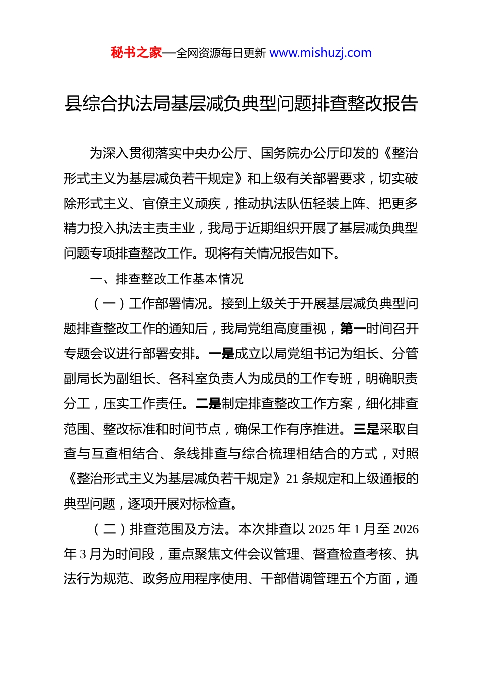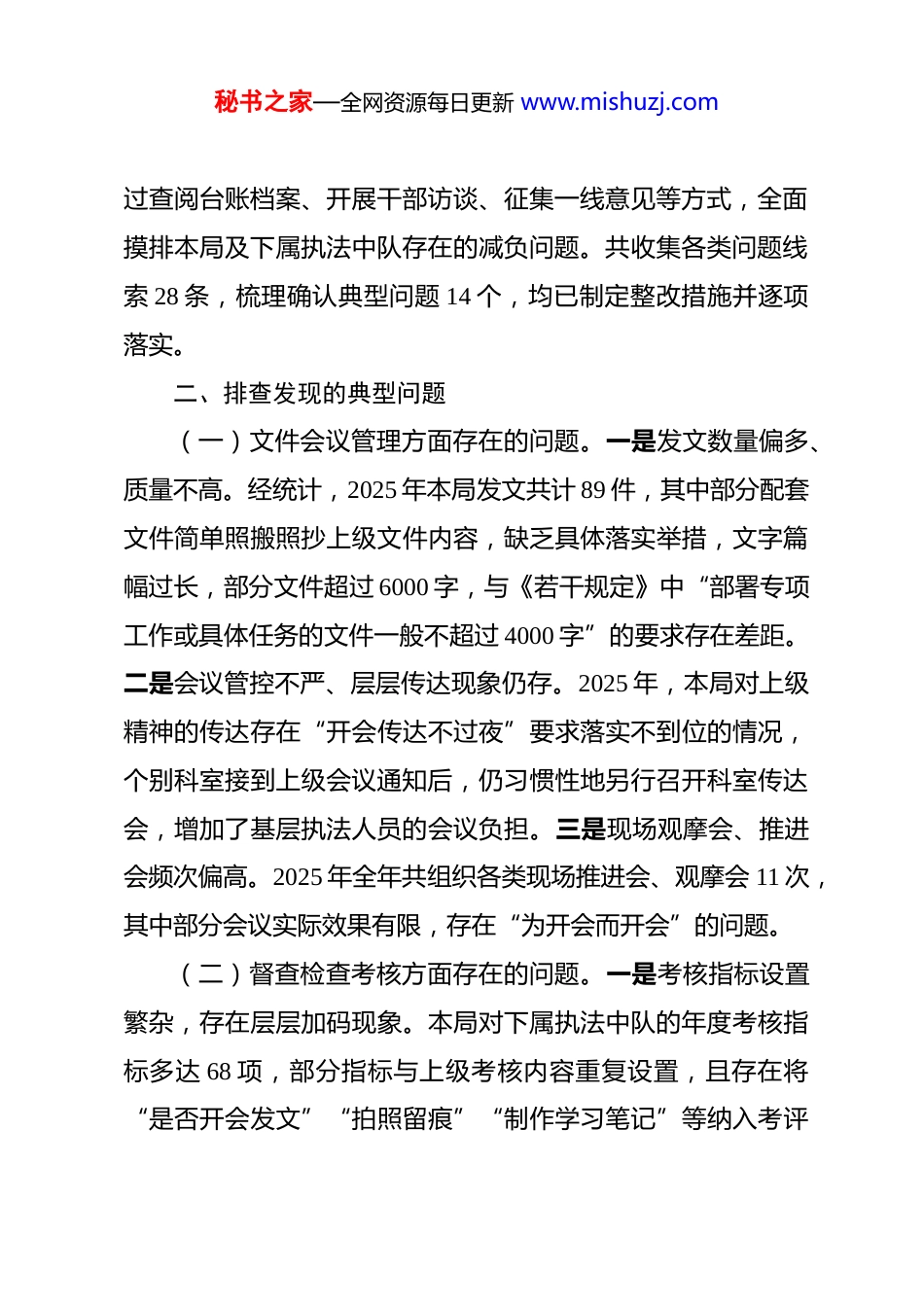 秘书之家—全网资源每日更新 www.mishuzj.com县综合执法局基层减负典型问题排查整改报告 为深入贯彻落实中央办公厅、国务院办公厅印发的《整治形式主义为基层减负若干规定》和上级有关部署要求,切实破除形式主义、官僚主义顽疾,推动执法队伍轻装上阵、把更多精力投入执法主责主业,我局于近期组织开展了基层减负典型问题专项排查整改工作。现将有关情况报告如下。一、排查整改工作基本情况(一)工作部署情况。接到上级关于开展基层减负典型问题排查整改工作的通知后,我局党组高度重视,第一时间召开专题会议进行部署安排。一是成立以局党组书记为组长、分管副局长为副组长、各科室负责人为成员的工作专班,明确职责分工,压实工作责任。二是制定排查整改工作方案,细化排查范围、整改标准和时间节点,确保工作有序推进。三是采取自查与互查相结合、条线排查与综合梳理相结合的方式,对照《整治形式主义为基层减负若干规定》21 条规定和上级通报的典型问题,逐项开展对标检查。(二)排查范围及方法。本次排查以 2025 年 1 月至 2026年 3 月为时间段,重点聚焦文件会议管理、督查检查考核、执法行为规范、政务应用程序使用、干部借调管理五个方面,通秘书之家—全网资源每日更新 www.mishuzj.com过查阅台账档案、开展干部访谈、征集一线意见等方式,全面摸排本局及下属执法中队存在的减负问题。共收集各类问题线索 28 条,梳理确认典型问题 14 个,均已制定整改措施并逐项落实。二、排查发现的典型问题(一)文件会议管理方面存在的问题。一是发文数量偏多、质量不高。经统计,2025 年本局发文共计 89 件,其中部分配套文件简单照搬照抄上级文件内容,缺乏具体落实举措,文字篇幅过长,部分文件超过 6000 字,与《若干规定》中“部署专项工作或具体任务的文件一般不超过 4000 字”的要求存在差距。二是会议管控不严、层层传达现象仍存。2025 年,本局对上级精神的传达存在“开会传达不过夜”要求落实不到位的情况,个别科室接到上级会议通知后,仍习惯性地另行召开科室传达会,增加了基层执法人员的会议负担。三是现场观摩会、推进会频次偏高。2025 年全年共组织各类现场推进会、观摩会 11 次,其中部分会议实际效果有限,存在“为开会而开会”的问题。(二)督查检查考核方面存在的问题。一是考核指标设置繁杂,存在层层加码现象。本局对下属执法中队的年度考核指标多达 68 项,部分指标与上级考核内容重复设置,且存在将“是否开会发文”“拍照留痕”“制作学习笔记”等纳入考评秘书之家—全网资源每日更新 www.mishuzj.com依据的问题,与《若干规定》明确要求相悖。二是督查检查频次偏高,执法人员迎检负担较重。2025 年本局对各执法中队开展各类督查检查累计 23 次,平均每个中队全年接受督查近 8 次,部分中队反映迎检准备工作占用了大量日常执法时间。三是考核结果反馈不及时,整改时间留足不够。部分考核结束后,结果反馈周期较长,给被考核单位留下的整改时限不足,导致整改工作流于表面。(三)执法行为规范方面存在的问题。一是个别执法人员存在执法程序不规范问题。排查发现,2025 年有 3 起行政处罚案件存在执法文书填写不完整、送达程序不规范等问题,个别案件出现未严格执行罚缴分离规定的情形,与司法部规范涉企行政执法的明确要求存在差距。二是执法检查频次管控不到位,存在对同一企业重复检查问题。经核查,2025 年本局对辖区内部分中小企业的年度执法检查次数超出规定上限,其中 1 家企业全年接受各类检查达 14 次,超出标准化定级企业检查频次上限,对企业正常生产经营造成一定影响。三是行政裁量权基准执行不统一。各执法中队对同类违法行为的处罚标准存在差异,部分案件出现“类案不同罚”问题,裁量尺度不一致影响了执法公信力。(四)政务应用程序使用方面存在的问题。一是政务应用秘书之家—全网资源每日更新 www.mishuzj.com程序使用管理不规范,存在强制要求基层人员定期登录打卡的情形,部分应用程序设置了积分排名、统计在线时长等功能,违反了《若干规定》相关禁止性要求。二是数据多头报送问题仍未...