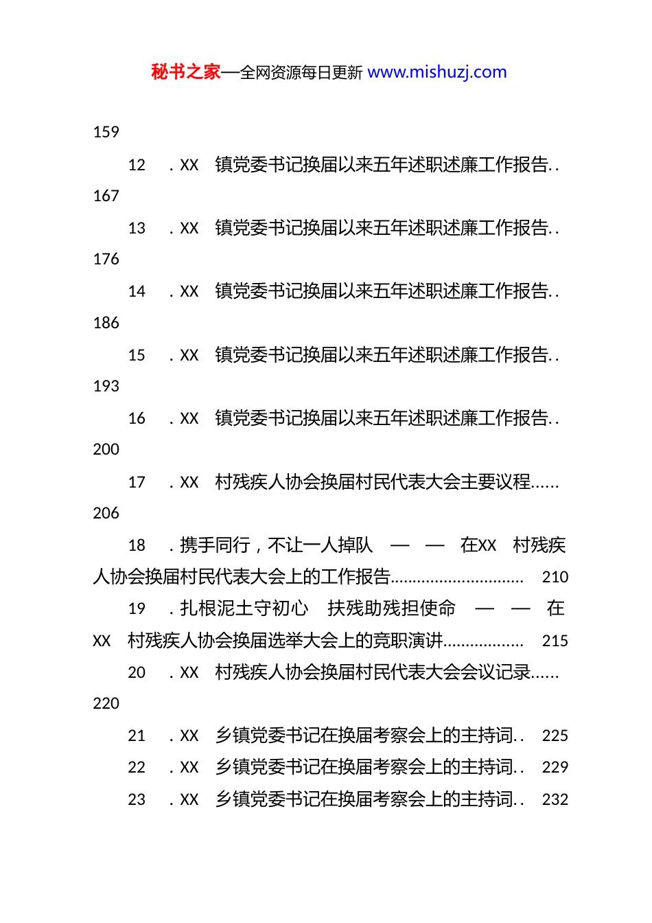 秘书之家—全网资源每日更新 www.mishuzj.com乡 镇 ( 村 、 街 道 、 社 区 ) 换 届工 作 报 告 、 述 职 报 告 、 主 持 词 、领 导 讲 话 汇 编1 .乡镇党代会(换届)工作报告:初心百年再跨越 奋力谱写新篇章 全力以赴再创发展新佳绩..............................42 .2026年XX国企党委换届工作报告..................173 .公司党委换届工作报告..........................................384 .乡镇党委换届工作报告..........................................625 .中国移动通信集团XX有限公司XX分公司党委换届工作报告.................................................................................786 .XX自来水公司党支部换届工作报告..................917 .机关党委换届工作报告:夯实堡垒强根基 凝心聚力促发展.....................................................................................1038 .水投集团党委换届工作报告..................................1109 .中国移动通信集团XX有限公司XX分公司党委换届工作报告.................................................................................12310.镇五年换届党代会工作报告..............................14611.XX镇党委书记换届以来五年述职述廉工作报告..秘书之家—全网资源每日更新 www.mishuzj.com15912.XX镇党委书记换届以来五年述职述廉工作报告..16713.XX镇党委书记换届以来五年述职述廉工作报告..17614.XX镇党委书记换届以来五年述职述廉工作报告..18615.XX镇党委书记换届以来五年述职述廉工作报告..19316.XX镇党委书记换届以来五年述职述廉工作报告..20017.XX村残疾人协会换届村民代表大会主要议程......20618.携手同行,不让一人掉队 ——在XX村残疾人协会换届村民代表大会上的工作报告..............................21019.扎根泥土守初心 扶残助残担使命 ——在XX村残疾人协会换届选举大会上的竞职演讲..................21520.XX村残疾人协会换届村民代表大会会议记录......22021.XX乡镇党委书记在换届考察会上的主持词..22522.XX乡镇党委书记在换届考察会上的主持词..22923.XX乡镇党委书记在换届考察会上的主持词..232秘书之家—全网资源每日更新 www.mishuzj.com24.全县乡镇机构改革暨村“两委”换届选举工作会议主持词.....................................................................................23525.市长在XX县调研村“两委”换届与乡村振兴工作座谈会上的讲话.....................................................................23826.全区村(社区) 团组织换届工作指引手册..24627.县村(居)“两委”换届工作总结..................27328.县委书记在2025年全县村(社区)“两委”换届准备工作会议上的讲话.........................................................28029.乡镇党委关于2025年度村(社区)“两委”换届工作阶段性进展情况的调研报告..........................................29530.在全市市村(社区)“两委”换届工作推进会上的通报讲话.................................................................................30531.在XX镇严肃换届纪律加强换届风气监督工作部署会议上的讲话.........................................................................31132.在XX市物业管理协会换届大会上的致辞......32033.在2025年度全市村(社区)“两委”换届工作推进会上的通报讲话.................................................................32434.在单位党组织换届选举工作业务培训会议上的培训稿.............................................................................................330秘书之家—全网资源每日更新 www.mishuzj.com乡 镇 党 代 会 ( 换 届 ) 工 作 报 告 :初 心 百 年 再 跨 越 奋 力 谱 写 新 篇章 全 力 以 赴 再 创 发 展 新 佳 绩各位代表、...