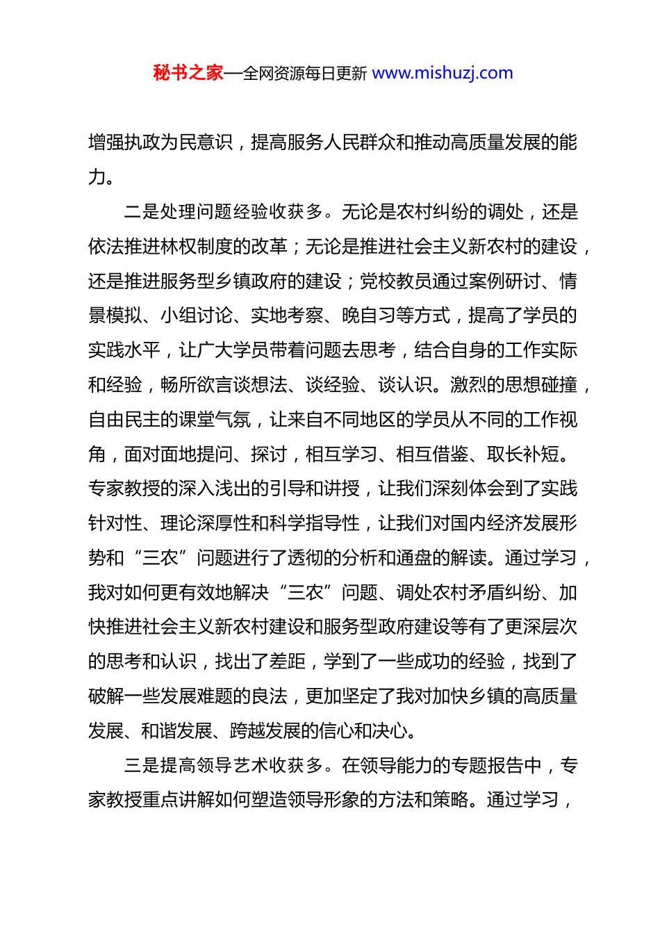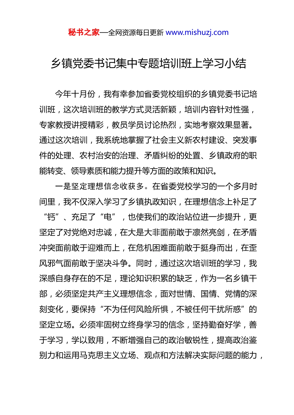 秘书之家—全网资源每日更新 www.mishuzj.com乡镇党委书记集中专题培训班上学习小结今年十月份,我有幸参加省委党校组织的乡镇党委书记培训班,这次培训班的教学方式灵活新颖,培训内容针对性强,专家教授讲授精彩,教员学员讨论热烈,实地考察效果显著。通过这次培训,我系统地掌握了社会主义新农村建设、突发事件的处理、农村治安的治理、矛盾纠纷的处置、乡镇政府的职能转变、领导素质和能力提升等方面的政策和知识。一是坚定理想信念收获多。在省委党校学习的一个多月时间里,我不仅深入学习了乡镇执政知识,在理想信念上补足了“钙”、充足了“电”,也使我们的政治站位进一步提升,更坚定了对党绝对忠诚,在大是大非面前敢于凛然亮剑,在矛盾冲突面前敢于迎难而上,在危机困难面前敢于挺身而出,在歪风邪气面前敢于坚决斗争。同时,通过这次培训班的学习,我深感自身存在的不足,理论知识积累的缺乏,作为一名乡镇干部,必须坚定共产主义理想信念,面对世情、国情、党情的深刻变化,要保持“不为任何风险所惧,不被任何干扰所惑”的坚定立场。必须牢固树立终身学习的信念,坚持勤奋好学,善于学习,学以致用,不断增强自己的政治敏锐性,提高政治鉴别力和运用马克思主义立场、观点和方法解决实际问题的能力,秘书之家—全网资源每日更新 www.mishuzj.com增强执政为民意识,提高服务人民群众和推动高质量发展的能力。二是处理问题经验收获多。无论是农村纠纷的调处,还是依法推进林权制度的改革;无论是推进社会主义新农村的建设,还是推进服务型乡镇政府的建设;党校教员通过案例研讨、情景模拟、小组讨论、实地考察、晚自习等方式,提高了学员的实践水平,让广大学员带着问题去思考,结合自身的工作实际和经验,畅所欲言谈想法、谈经验、谈认识。激烈的思想碰撞,自由民主的课堂气氛,让来自不同地区的学员从不同的工作视角,面对面地提问、探讨,相互学习、相互借鉴、取长补短。专家教授的深入浅出的引导和讲授,让我们深刻体会到了实践针对性、理论深厚性和科学指导性,让我们对国内经济发展形势和“三农”问题进行了透彻的分析和通盘的解读。通过学习,我对如何更有效地解决“三农”问题、调处农村矛盾纠纷、加快推进社会主义新农村建设和服务型政府建设等有了更深层次的思考和认识,找出了差距,学到了一些成功的经验,找到了破解一些发展难题的良法,更加坚定了我对加快乡镇的高质量发展、和谐发展、跨越发展的信心和决心。三是提高领导艺术收获多。在领导能力的专题报告中,专家教授重点讲解如何塑造领导形象的方法和策略。通过学习,秘书之家—全网资源每日更新 www.mishuzj.com我深刻体会到作为一名基层干部要成为一名卓越的领导者,在工作中要加强学习,不断提升个人素养和人格魅力,以德感人,以行服人。要培养志存高远、清正廉洁、诚实守信、以身作则、言行一致、勇于担当、宽容大度、关爱他人的崇高人格。要培养敏捷的思考力、正确的决断力、敏锐的洞察力、坚决的执行力和全面的协调力。在工作中坚持做到诚信为本、平等待人。要勤于学习,不断充实自己,用知识和能力提高人格魅力。勇于实践,善于总结,不断塑造和完善人格魅力。要积极参加各种领导活动,主动接受挑战,在实践中增长才干,锻炼人格;要经常与人沟通思想,用自己的人格魅力感染他人,教育他人,鼓舞他人;要严格管好亲朋好友和身边工作人员,使他们成为展示自己人格的重要窗口;要从小事做起,探寻和创造建立良好人缘的切入点、结合处和连接部;要敢于同各种不法、不良行为作斗争,增强塑造人格魅力的勇气和力量。四是提升团队意识收获多。通过小组讨论和班级开展的各种活动,我深刻地感受到团结协作,强化团队精神的重要性。现代社会是一个信息化的社会,知识和信息正在迅速改变着人们的生活方式,思维方式和工作方式。在激烈的竞争环境中,大量的工作往往需要在群体的共同协作下,才能高效率地圆满完成,而一个缺乏工作策略,不善于团结协作的人,往往会事秘书之家—全网资源每日更新 www.mishuzj.com倍功半,其最终也会被时代和团队所抛弃。所以在工作中必须做到从大局出发,以集体利益为...