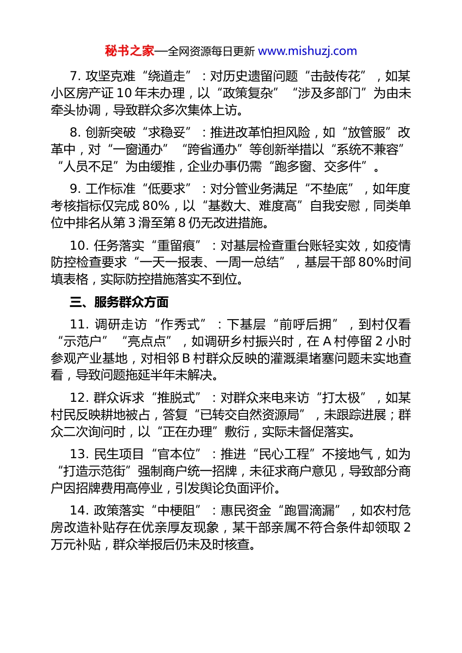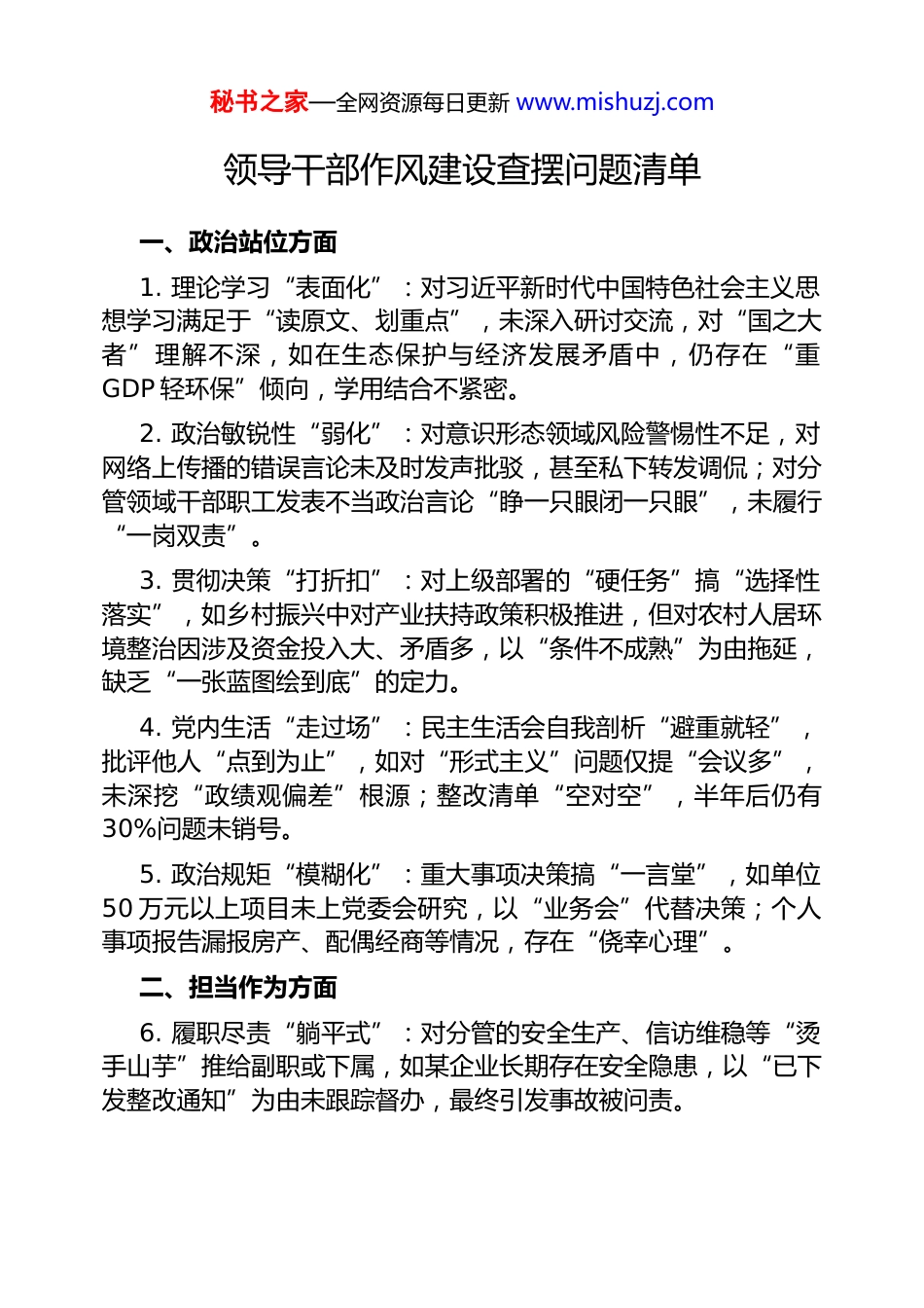 秘书之家—全网资源每日更新 www.mishuzj.com领导干部作风建设查摆问题清单一、政治站位方面1. 理论学习“表面化”:对习近平新时代中国特色社会主义思想学习满足于“读原文、划重点”,未深入研讨交流,对“国之大者”理解不深,如在生态保护与经济发展矛盾中,仍存在“重GDP 轻环保”倾向,学用结合不紧密。2. 政治敏锐性“弱化”:对意识形态领域风险警惕性不足,对网络上传播的错误言论未及时发声批驳,甚至私下转发调侃;对分管领域干部职工发表不当政治言论“睁一只眼闭一只眼”,未履行“一岗双责”。3. 贯彻决策“打折扣”:对上级部署的“硬任务”搞“选择性落实”,如乡村振兴中对产业扶持政策积极推进,但对农村人居环境整治因涉及资金投入大、矛盾多,以“条件不成熟”为由拖延,缺乏“一张蓝图绘到底”的定力。4. 党内生活“走过场”:民主生活会自我剖析“避重就轻”,批评他人“点到为止”,如对“形式主义”问题仅提“会议多”,未深挖“政绩观偏差”根源;整改清单“空对空”,半年后仍有30%问题未销号。5. 政治规矩“模糊化”:重大事项决策搞“一言堂”,如单位50 万元以上项目未上党委会研究,以“业务会”代替决策;个人事项报告漏报房产、配偶经商等情况,存在“侥幸心理”。二、担当作为方面6. 履职尽责“躺平式”:对分管的安全生产、信访维稳等“烫手山芋”推给副职或下属,如某企业长期存在安全隐患,以“已下发整改通知”为由未跟踪督办,最终引发事故被问责。秘书之家—全网资源每日更新 www.mishuzj.com7. 攻坚克难“绕道走”:对历史遗留问题“击鼓传花”,如某小区房产证 10 年未办理,以“政策复杂”“涉及多部门”为由未牵头协调,导致群众多次集体上访。8. 创新突破“求稳妥”:推进改革怕担风险,如“放管服”改革中,对“一窗通办”“跨省通办”等创新举措以“系统不兼容”“人员不足”为由缓推,企业办事仍需“跑多窗、交多件”。9. 工作标准“低要求”:对分管业务满足“不垫底”,如年度考核指标仅完成 80%,以“基数大、难度高”自我安慰,同类单位中排名从第 3 滑至第 8 仍无改进措施。10. 任务落实“重留痕”:对基层检查重台账轻实效,如疫情防控检查要求“一天一报表、一周一总结”,基层干部 80%时间填表格,实际防控措施落实不到位。三、服务群众方面11. 调研走访“作秀式”:下基层“前呼后拥”,到村仅看“示范户”“亮点点”,如调研乡村振兴时,在 A 村停留 2 小时参观产业基地,对相邻 B 村群众反映的灌溉渠堵塞问题未实地查看,导致问题拖延半年未解决。12. 群众诉求“推脱式”:对群众来电来访“打太极”,如某村民反映耕地被占,答复“已转交自然资源局”,未跟踪进展;群众二次询问时,以“正在办理”敷衍,实际未督促落实。13. 民生项目“官本位”:推进“民心工程”不接地气,如为“打造示范街”强制商户统一招牌,未征求商户意见,导致部分商户因招牌费用高停业,引发舆论负面评价。14. 政策落实“中梗阻”:惠民资金“跑冒滴漏”,如农村危房改造补贴存在优亲厚友现象,某干部亲属不符合条件却领取 2万元补贴,群众举报后仍未及时核查。秘书之家—全网资源每日更新 www.mishuzj.com15. 服务效率“慢半拍”:对群众“急难愁盼”响应迟缓,如某社区老人反映电梯故障,物业上报后,分管领导以“需走招标程序”为由拖延 1 个月维修,期间老人爬楼梯摔倒住院。四、廉洁自律方面16. 交往边界“不清晰”:与管理服务对象“亲清不分”,如接受企业主安排的“私人宴请”“旅游度假”,虽未直接谋利,但在项目审批中“开口子”,导致公平竞争受损。17. 家风建设“宽松软”:对配偶子女管教不严,如妻子通过“打招呼”为亲属承揽工程,本人知情未制止;子女升学、婚丧事宜大操大办,收受管理服务对象礼金 10 万元。18. 公务消费“超标准”:以“工作需要”为由违规报销,如出差住五星级酒店、乘坐头等舱,虚列“接待费”“调研费”掩盖高消费,年度“三公经费”超预算 30%。19. 资产监管“失严谨”:对单位国有资产“重购置轻管理”,如采购的办公设备未登记入账,部分设备被私自带...