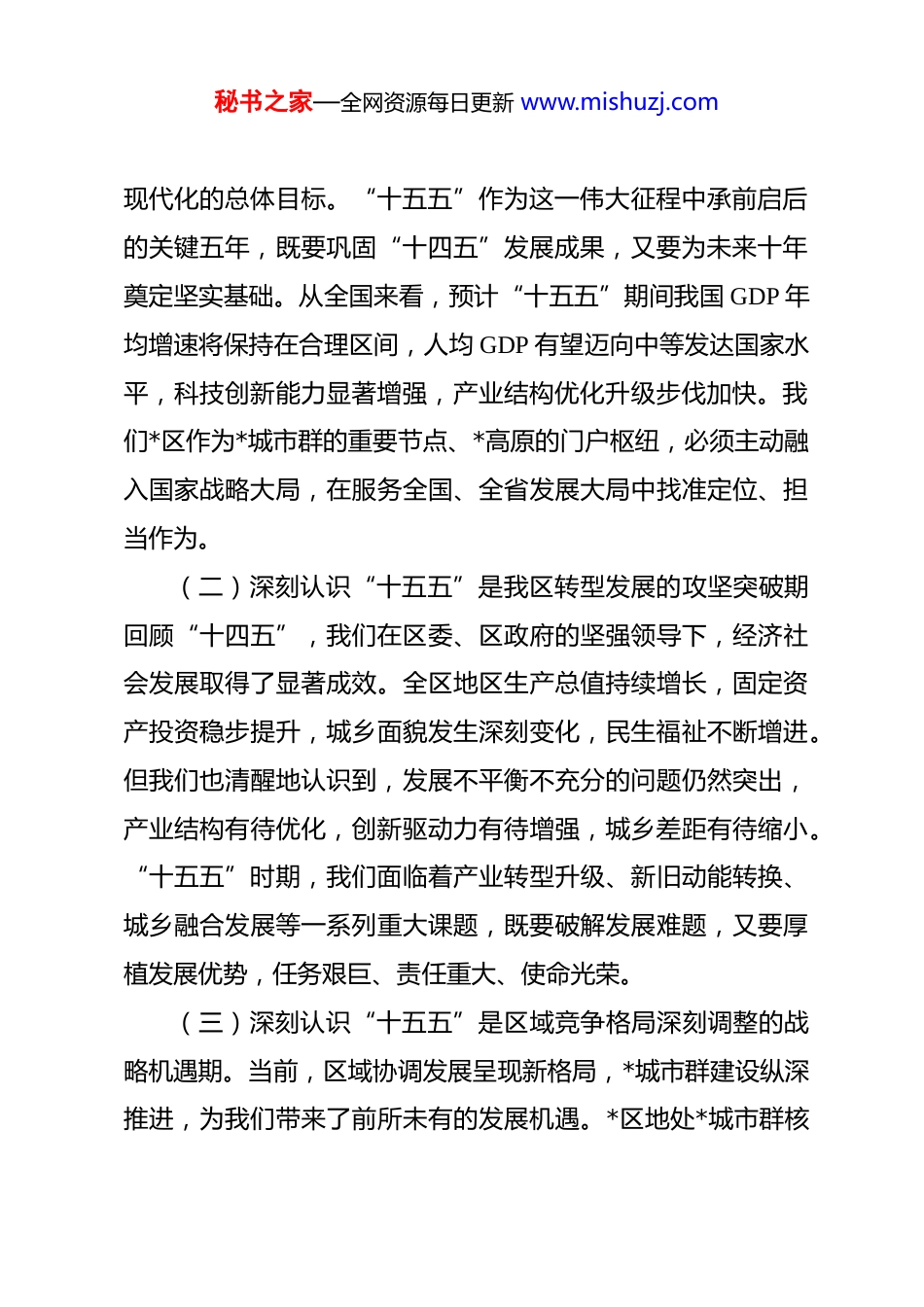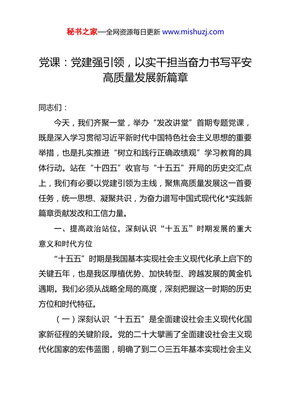 秘书之家—全网资源每日更新 www.mishuzj.com党课:党建强引领,以实干担当奋力书写平安高质量发展新篇章 同志们:今天,我们齐聚一堂,举办“发改讲堂”首期专题党课,既是深入学习贯彻习近平新时代中国特色社会主义思想的重要举措,也是扎实推进“树立和践行正确政绩观”学习教育的具体行动。站在“十四五”收官与“十五五”开局的历史交汇点上,我们有必要以党建引领为主线,聚焦高质量发展这一首要任务,统一思想、凝聚共识,为奋力谱写中国式现代化*实践新篇章贡献发改和工信力量。一、提高政治站位,深刻认识“十五五”时期发展的重大意义和时代方位“十五五”时期是我国基本实现社会主义现代化承上启下的关键五年,也是我区厚植优势、加快转型、跨越发展的黄金机遇期。我们必须从战略全局的高度,深刻把握这一时期的历史方位和时代特征。(一)深刻认识“十五五”是全面建设社会主义现代化国家新征程的关键阶段。党的二十大擘画了全面建设社会主义现代化国家的宏伟蓝图,明确了到二〇三五年基本实现社会主义秘书之家—全网资源每日更新 www.mishuzj.com现代化的总体目标。“十五五”作为这一伟大征程中承前启后的关键五年,既要巩固“十四五”发展成果,又要为未来十年奠定坚实基础。从全国来看,预计“十五五”期间我国 GDP 年均增速将保持在合理区间,人均 GDP 有望迈向中等发达国家水平,科技创新能力显著增强,产业结构优化升级步伐加快。我们*区作为*城市群的重要节点、*高原的门户枢纽,必须主动融入国家战略大局,在服务全国、全省发展大局中找准定位、担当作为。(二)深刻认识“十五五”是我区转型发展的攻坚突破期回顾“十四五”,我们在区委、区政府的坚强领导下,经济社会发展取得了显著成效。全区地区生产总值持续增长,固定资产投资稳步提升,城乡面貌发生深刻变化,民生福祉不断增进。但我们也清醒地认识到,发展不平衡不充分的问题仍然突出,产业结构有待优化,创新驱动力有待增强,城乡差距有待缩小。“十五五”时期,我们面临着产业转型升级、新旧动能转换、城乡融合发展等一系列重大课题,既要破解发展难题,又要厚植发展优势,任务艰巨、责任重大、使命光荣。(三)深刻认识“十五五”是区域竞争格局深刻调整的战略机遇期。当前,区域协调发展呈现新格局,*城市群建设纵深推进,为我们带来了前所未有的发展机遇。*区地处*城市群核秘书之家—全网资源每日更新 www.mishuzj.com心腹地,区位优势独特、资源禀赋优越、发展潜力巨大。我们必须抢抓机遇、主动作为,在区域协同发展中抢占先机、赢得主动,努力将区位优势转化为发展优势,将资源禀赋转化为发展动能,全力建设*高原硒都、*城市群重要节点。二、准确把握区情实际,科学谋划“十五五”发展蓝图和重点任务谋划好“十五五”发展,既要仰望星空、胸怀大局,又要脚踏实地、立足实际。发改和工信部门作为经济社会发展的“参谋部”“作战部”“施工队”“店小二”,必须率先吃透区情、把准脉搏,为区委、区政府科学决策提供坚实支撑。(一)全面回顾总结“十四五”发展成就与经验。“十四五”以来,全区上下坚持稳中求进工作总基调,完整准确全面贯彻新发展理念,经济社会发展取得长足进步。经济实力稳步提升,预计“十四五”末地区生产总值较“十三五”末增长*%以上,年均增速高于全省平均水平;产业结构持续优化,三次产业结构比例更加协调,特色农业提质增效,工业经济转型升级,服务业发展势头良好;项目建设成效显著,累计实施重点项目*个,完成投资*亿元;民生福祉不断改善,城镇和农村居民人均可支配收入年均增长分别达到*%和*%;生态环境持续向好,绿色发展理念深入人心。这些成绩的取得,为“十五秘书之家—全网资源每日更新 www.mishuzj.com五”发展奠定了坚实基础、积累了宝贵经验。(二)精准研判当前面临的机遇挑战和短板不足。从机遇看,国家重大战略叠加效应持续释放,*城市群建设步伐加快,为我们承接产业转移、融入区域发展提供了广阔空间;新一轮科技革命和产业变革深入发展,为我们培育新质生产力、实现换道超车提供了难得契机;国家和省市稳增长政策持续加力,为我们扩大有...