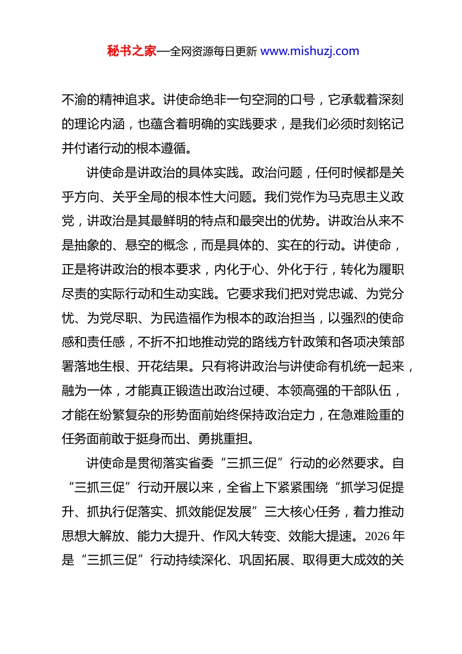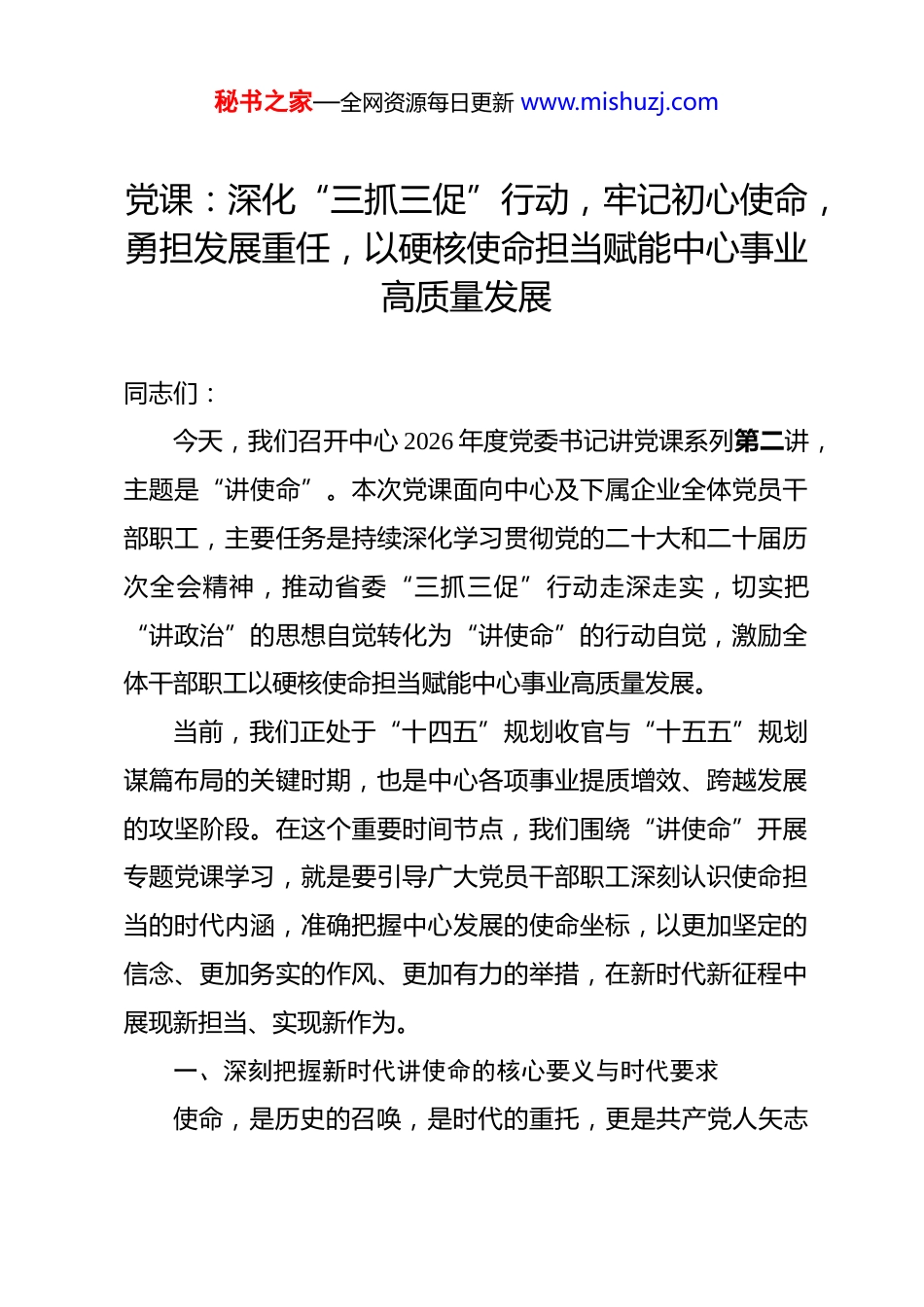 秘书之家—全网资源每日更新 www.mishuzj.com党课:深化“三抓三促”行动,牢记初心使命,勇担发展重任,以硬核使命担当赋能中心事业高质量发展 同志们:今天,我们召开中心 2026 年度党委书记讲党课系列第二讲,主题是“讲使命”。本次党课面向中心及下属企业全体党员干部职工,主要任务是持续深化学习贯彻党的二十大和二十届历次全会精神,推动省委“三抓三促”行动走深走实,切实把“讲政治”的思想自觉转化为“讲使命”的行动自觉,激励全体干部职工以硬核使命担当赋能中心事业高质量发展。当前,我们正处于“十四五”规划收官与“十五五”规划谋篇布局的关键时期,也是中心各项事业提质增效、跨越发展的攻坚阶段。在这个重要时间节点,我们围绕“讲使命”开展专题党课学习,就是要引导广大党员干部职工深刻认识使命担当的时代内涵,准确把握中心发展的使命坐标,以更加坚定的信念、更加务实的作风、更加有力的举措,在新时代新征程中展现新担当、实现新作为。一、深刻把握新时代讲使命的核心要义与时代要求使命,是历史的召唤,是时代的重托,更是共产党人矢志秘书之家—全网资源每日更新 www.mishuzj.com不渝的精神追求。讲使命绝非一句空洞的口号,它承载着深刻的理论内涵,也蕴含着明确的实践要求,是我们必须时刻铭记并付诸行动的根本遵循。讲使命是讲政治的具体实践。政治问题,任何时候都是关乎方向、关乎全局的根本性大问题。我们党作为马克思主义政党,讲政治是其最鲜明的特点和最突出的优势。讲政治从来不是抽象的、悬空的概念,而是具体的、实在的行动。讲使命,正是将讲政治的根本要求,内化于心、外化于行,转化为履职尽责的实际行动和生动实践。它要求我们把对党忠诚、为党分忧、为党尽职、为民造福作为根本的政治担当,以强烈的使命感和责任感,不折不扣地推动党的路线方针政策和各项决策部署落地生根、开花结果。只有将讲政治与讲使命有机统一起来,融为一体,才能真正锻造出政治过硬、本领高强的干部队伍,才能在纷繁复杂的形势面前始终保持政治定力,在急难险重的任务面前敢于挺身而出、勇挑重担。讲使命是贯彻落实省委“三抓三促”行动的必然要求。自“三抓三促”行动开展以来,全省上下紧紧围绕“抓学习促提升、抓执行促落实、抓效能促发展”三大核心任务,着力推动思想大解放、能力大提升、作风大转变、效能大提速。2026 年是“三抓三促”行动持续深化、巩固拓展、取得更大成效的关秘书之家—全网资源每日更新 www.mishuzj.com键之年。我们中心作为服务保障类单位,必须进一步提高政治站位,强化责任担当,将“三抓三促”行动的各项要求,精准融入到日常工作的每一个环节、每一项任务之中。具体而言,一要把讲使命体现在抓学习的扎实成效上,通过系统深入学习党的创新理论、前沿业务知识和必备专业技能,不断克服“本领恐慌”,提升履职尽责的能力水平;二要把讲使命体现在抓执行的坚决力度上,发扬钉钉子精神,一锤接着一锤敲,确保各项决策部署不折不扣执行到位、取得实效;三要把讲使命体现在抓效能的显著提升上,以更加优质、高效、便捷的服务保障,为中心事业的高质量发展注入强劲动力。讲使命是推动中心高质量发展的内在动力。当前,中心正处在转型发展、创新发展的关键时期,既面临前所未有的战略机遇,也面临诸多严峻复杂的挑战。特别是随着*新区职教园区建设的深入推进,“十大基地”建设全面铺开,我们肩负的责任更加重大,承担的任务更加艰巨,承载的使命也更加光荣。讲使命,就是要胸怀“国之大者”,深刻把握中心在区域发展格局中的战略定位,自觉将个人的成长进步融入中心发展的大局,将本职工作的成效融入事业发展的全局。要以“时时放心不下”的责任感和“事事落实到位”的执行力,聚焦主责主业,勇于攻坚克难,全力以赴答好新时代赋予我们的发展答卷。秘书之家—全网资源每日更新 www.mishuzj.com二、精准锚定中心发展的使命坐标与实践路径同志们,使命不是虚无缥缈的概念,而是具体实在的责任它需要我们在实际工作中去体现、去践行。结合中心发展的现实需要和长远目标,我们必须将践行初心、担当使命的要求,精准落实到以下重...