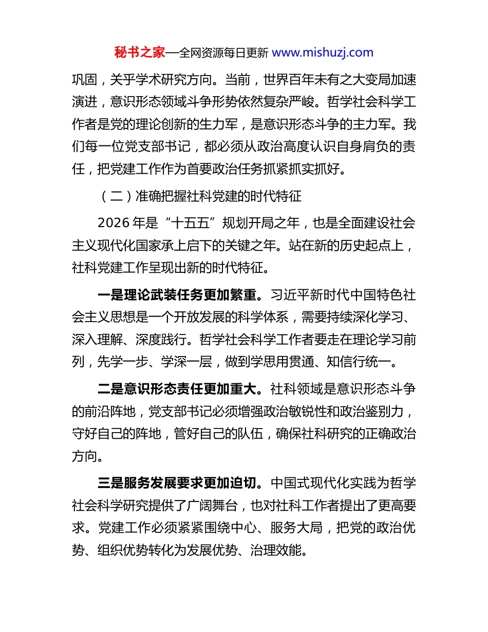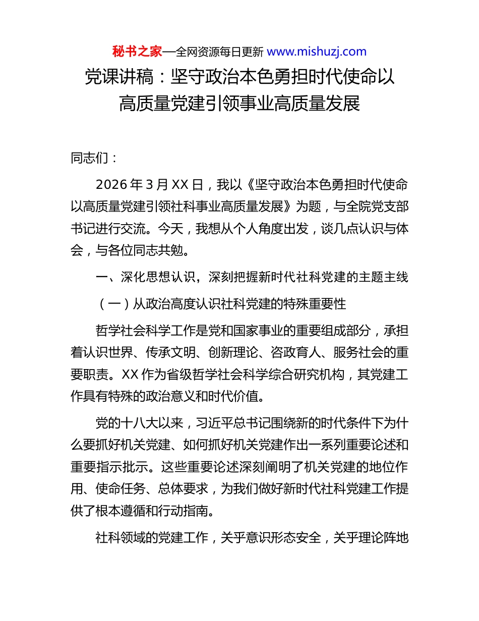 秘书之家—全网资源每日更新 www.mishuzj.com党课讲稿:坚守政治本色勇担时代使命以高质量党建引领事业高质量发展同志们:2026 年 3 月 XX 日,我以《坚守政治本色勇担时代使命以高质量党建引领社科事业高质量发展》为题,与全院党支部书记进行交流。今天,我想从个人角度出发,谈几点认识与体会,与各位同志共勉。一、深化思想认识,深刻把握新时代社科党建的主题主线(一)从政治高度认识社科党建的特殊重要性哲学社会科学工作是党和国家事业的重要组成部分,承担着认识世界、传承文明、创新理论、咨政育人、服务社会的重要职责。XX 作为省级哲学社会科学综合研究机构,其党建工作具有特殊的政治意义和时代价值。党的十八大以来,习近平总书记围绕新的时代条件下为什么要抓好机关党建、如何抓好机关党建作出一系列重要论述和重要指示批示。这些重要论述深刻阐明了机关党建的地位作用、使命任务、总体要求,为我们做好新时代社科党建工作提供了根本遵循和行动指南。社科领域的党建工作,关乎意识形态安全,关乎理论阵地秘书之家—全网资源每日更新 www.mishuzj.com巩固,关乎学术研究方向。当前,世界百年未有之大变局加速演进,意识形态领域斗争形势依然复杂严峻。哲学社会科学工作者是党的理论创新的生力军,是意识形态斗争的主力军。我们每一位党支部书记,都必须从政治高度认识自身肩负的责任,把党建工作作为首要政治任务抓紧抓实抓好。(二)准确把握社科党建的时代特征2026 年是“十五五”规划开局之年,也是全面建设社会主义现代化国家承上启下的关键之年。站在新的历史起点上,社科党建工作呈现出新的时代特征。一是理论武装任务更加繁重。习近平新时代中国特色社会主义思想是一个开放发展的科学体系,需要持续深化学习、深入理解、深度践行。哲学社会科学工作者要走在理论学习前列,先学一步、学深一层,做到学思用贯通、知信行统一。二是意识形态责任更加重大。社科领域是意识形态斗争的前沿阵地,党支部书记必须增强政治敏锐性和政治鉴别力,守好自己的阵地,管好自己的队伍,确保社科研究的正确政治方向。三是服务发展要求更加迫切。中国式现代化实践为哲学社会科学研究提供了广阔舞台,也对社科工作者提出了更高要求。党建工作必须紧紧围绕中心、服务大局,把党的政治优势、组织优势转化为发展优势、治理效能。秘书之家—全网资源每日更新 www.mishuzj.com(三)深刻理解高质量党建的内涵要义高质量党建是新时代党建工作的目标追求和核心要求。对社科机构而言,高质量党建应体现在以下几个方面:第一,政治站位要有高度。坚持党对哲学社会科学工作的全面领导,自觉用习近平新时代中国特色社会主义思想指导学术研究,把党的理论路线方针政策贯穿研究全过程。第二,组织建设要有力度。党支部是党的基础组织,是党在社会基层组织中的战斗堡垒。要健全组织体系,完善工作机制,提升组织力,增强战斗力。第三,队伍建设要有温度。社科工作者是党的宝贵财富,党支部书记要关心关爱党员群众,营造团结和谐、干事创业的良好氛围。第四,融合发展要有深度。党建与业务不能“两张皮”,要找准结合点、着力点,以党建引领业务发展,以业务发展检验党建成效。二、锚定职责定位,准确把握新时代党支部书记的职责使命(一)做政治上的明白人党支部书记首先是党的干部,政治性是第一属性。必须旗帜鲜明讲政治,做到对党绝对忠诚。秘书之家—全网资源每日更新 www.mishuzj.com一是坚定政治信仰。习近平新时代中国特色社会主义思想是当代中国马克思主义、二十一世纪马克思主义,是中华文化和中国精神的时代精华。要持续深入学习,做到入脑入心、真学真信、笃信笃行。要把学习作为一种政治责任、一种精神追求、一种生活方式,带着信念学、带着感情学、带着使命学。二是增强政治能力。不断提高政治判断力、政治领悟力、政治执行力,在大是大非面前头脑清醒、立场坚定。善于从政治上看问题,善于把握政治大局,使讲政治的要求从外部要求转化为内在主动。三是严守政治纪律。把党的政治纪律和政治规矩挺在前面,自觉维护党中央权威和集中统一领导。在学术研究、理论宣传、咨政...