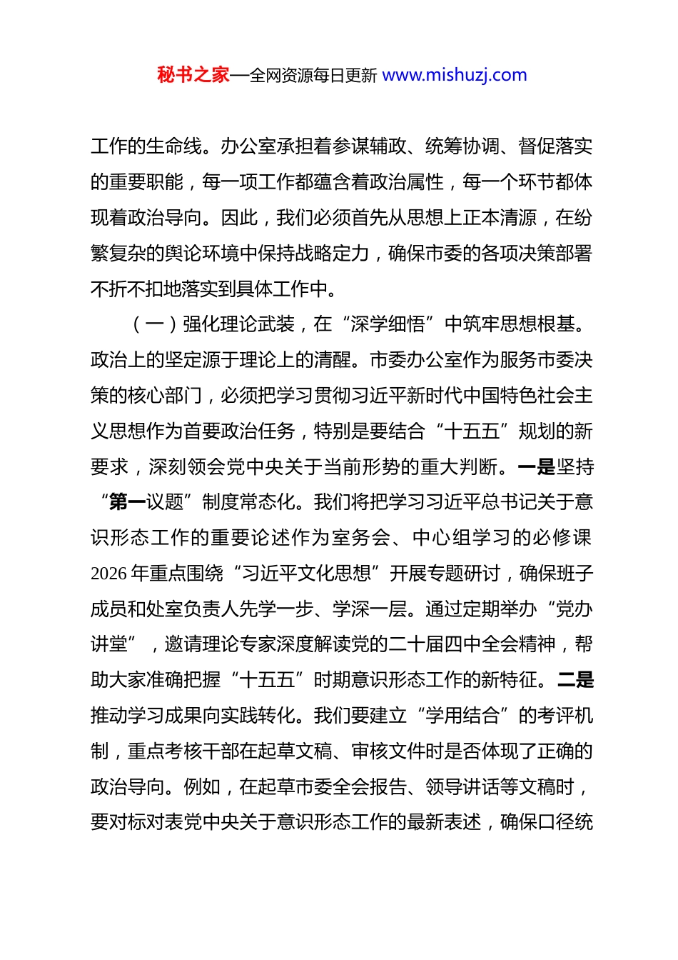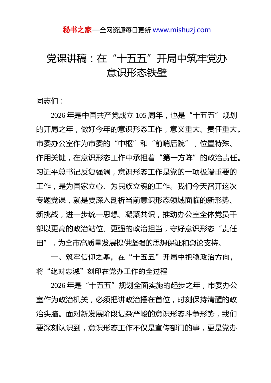 秘书之家—全网资源每日更新 www.mishuzj.com党课讲稿:在“十五五”开局中筑牢党办意识形态铁壁 同志们:2026 年是中国共产党成立 105 周年,也是“十五五”规划的开局之年,做好今年的意识形态工作,意义重大、责任重大。市委办公室作为市委的“中枢”和“前哨后院”,位置特殊、作用关键,在意识形态工作中承担着“第一方阵”的政治责任。习近平总书记反复强调,意识形态工作是党的一项极端重要的工作,是为国家立心、为民族立魂的工作。我们今天召开这次专题党课,就是要深入剖析当前意识形态领域面临的新形势、新挑战,进一步统一思想、凝聚共识,推动办公室全体党员干部以更高的政治站位、更强的政治担当,守好意识形态“责任田”,为全市高质量发展提供坚强的思想保证和舆论支持。一、筑牢信仰之基,在“十五五”开局中把稳政治方向,将“绝对忠诚”刻印在党办工作的全过程2026 年是“十五五”规划全面实施的起步之年,市委办公室作为政治机关,必须把讲政治摆在首位,时刻保持清醒的政治头脑。面对新发展阶段复杂严峻的意识形态斗争形势,我们要深刻认识到,意识形态工作不仅是宣传部门的事,更是党办秘书之家—全网资源每日更新 www.mishuzj.com工作的生命线。办公室承担着参谋辅政、统筹协调、督促落实的重要职能,每一项工作都蕴含着政治属性,每一个环节都体现着政治导向。因此,我们必须首先从思想上正本清源,在纷繁复杂的舆论环境中保持战略定力,确保市委的各项决策部署不折不扣地落实到具体工作中。(一)强化理论武装,在“深学细悟”中筑牢思想根基。政治上的坚定源于理论上的清醒。市委办公室作为服务市委决策的核心部门,必须把学习贯彻习近平新时代中国特色社会主义思想作为首要政治任务,特别是要结合“十五五”规划的新要求,深刻领会党中央关于当前形势的重大判断。一是坚持“第一议题”制度常态化。我们将把学习习近平总书记关于意识形态工作的重要论述作为室务会、中心组学习的必修课2026 年重点围绕“习近平文化思想”开展专题研讨,确保班子成员和处室负责人先学一步、学深一层。通过定期举办“党办讲堂”,邀请理论专家深度解读党的二十届四中全会精神,帮助大家准确把握“十五五”时期意识形态工作的新特征。二是推动学习成果向实践转化。我们要建立“学用结合”的考评机制,重点考核干部在起草文稿、审核文件时是否体现了正确的政治导向。例如,在起草市委全会报告、领导讲话等文稿时,要对标对表党中央关于意识形态工作的最新表述,确保口径统秘书之家—全网资源每日更新 www.mishuzj.com一、导向鲜明。我们将建立“文稿政治审核台账”,对每一份经手的重要文件进行政治立场、政治方向的严格筛查,坚决杜绝“低级红”“高级黑”现象。三是创新学习载体增强实效。针对办公室工作节奏快、任务重的特点,我们将利用“微课堂”“碎片化学习”等模式,在机关内网开设“意识形态应知应会”专栏,每月更新学习题库,组织开展“线上+线下”知识竞赛。通过建立“学习积分制”,将学习情况纳入干部年度考核,倒逼干部变“被动学”为“主动钻”,真正让党的创新理论入脑入心,成为指导党办工作的“定盘星”。(二)压实政治责任,在“知责尽责”中拧紧责任链条。意识形态工作责任制是“硬约束”,不是“橡皮筋”。市委办公室必须带头落实《党委(党组)意识形态工作责任制实施细则》,确保责任层层传导、压紧压实。一是构建“全链条”责任体系。我们将严格落实“一岗双责”,明确主要负责同志是第一责任人,班子成员对分管领域负主体责任,处室负责人为直接责任人。今年,我们将重新修订《市委办公室意识形态工作责任清单》,将责任细化到具体岗位,确保每一项工作都有人抓、有人管。建立“季度研判、半年通报、年终述职”的工作机制,定期分析办公室内部及联系领域意识形态风险点,形成“研判—部署—落实—反馈”的工作闭环。二是强化“全过秘书之家—全网资源每日更新 www.mishuzj.com程”督查问效。我们将把意识形态工作纳入办公室内部督查的重要内容,与业务工作同部署、同检查、同考核。针对文件流转、会议组织、信息报送等关键环节,开展定...