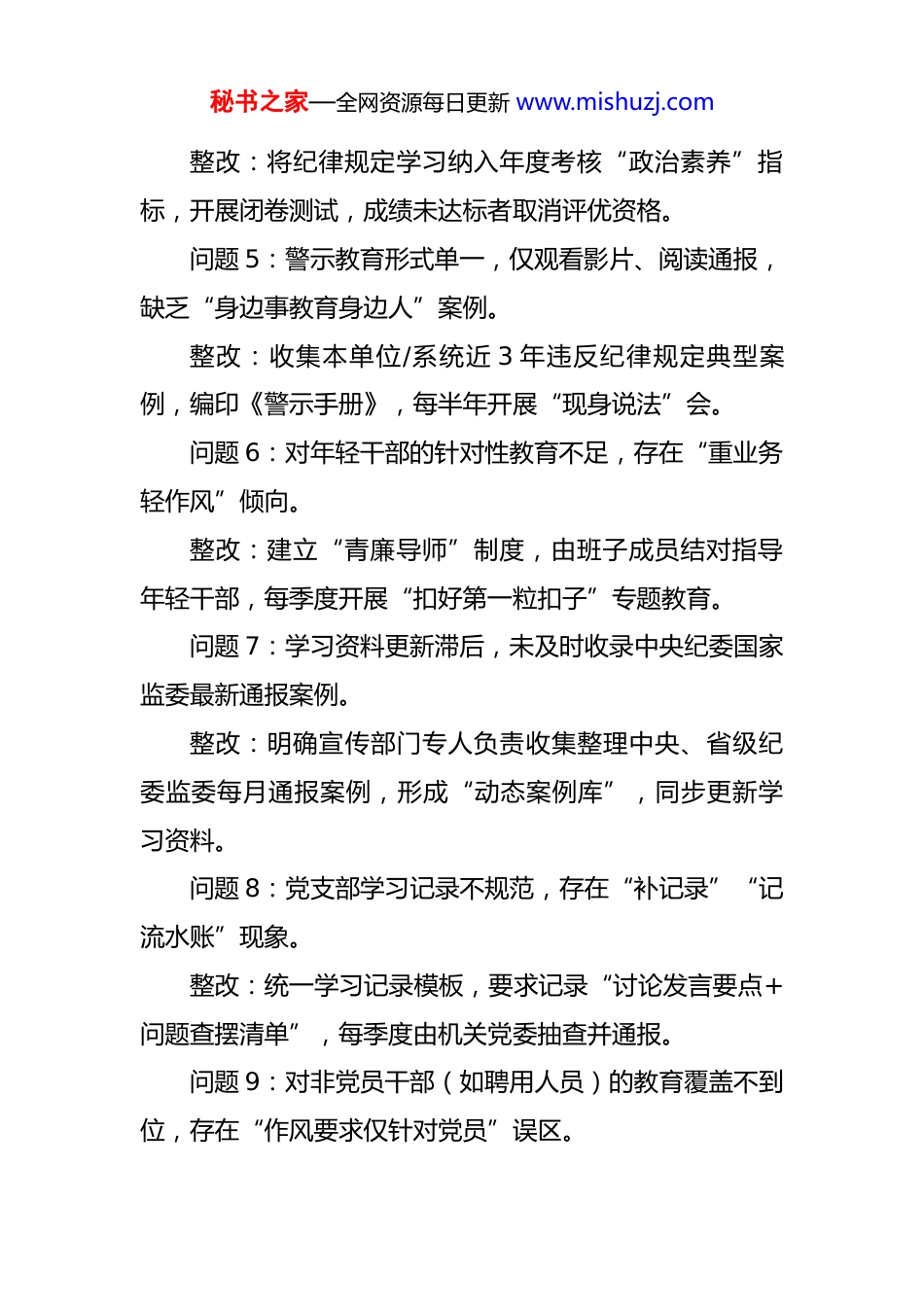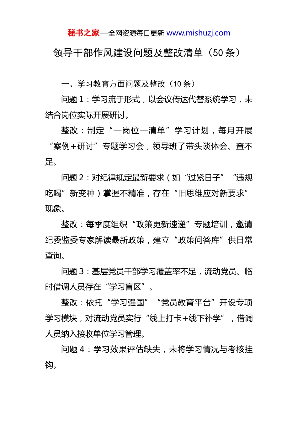 秘书之家—全网资源每日更新 www.mishuzj.com领导干部作风建设问题及整改清单(50 条)一、学习教育方面问题及整改(10 条)问题 1:学习流于形式,以会议传达代替系统学习,未结合岗位实际开展研讨。整改:制定“一岗位一清单”学习计划,每月开展“案例+研讨”专题学习会,领导班子带头谈体会、查不足。问题 2:对纪律规定最新要求(如“过紧日子”“违规吃喝”新变种)掌握不精准,存在“旧思维应对新要求”现象。整改:每季度组织“政策更新速递”专题培训,邀请纪委监委专家解读最新政策,建立“政策问答库”供日常查询。问题 3:基层党员干部学习覆盖率不足,流动党员、临时借调人员存在“学习盲区”。整改:依托“学习强国”“党员教育平台”开设专项学习模块,对流动党员实行“线上打卡+线下补学”,借调人员纳入接收单位学习管理。问题 4:学习效果评估缺失,未将学习情况与考核挂钩。秘书之家—全网资源每日更新 www.mishuzj.com整改:将纪律规定学习纳入年度考核“政治素养”指标,开展闭卷测试,成绩未达标者取消评优资格。问题 5:警示教育形式单一,仅观看影片、阅读通报,缺乏“身边事教育身边人”案例。整改:收集本单位/系统近 3 年违反纪律规定典型案例,编印《警示手册》,每半年开展“现身说法”会。问题 6:对年轻干部的针对性教育不足,存在“重业务轻作风”倾向。整改:建立“青廉导师”制度,由班子成员结对指导年轻干部,每季度开展“扣好第一粒扣子”专题教育。问题 7:学习资料更新滞后,未及时收录中央纪委国家监委最新通报案例。整改:明确宣传部门专人负责收集整理中央、省级纪委监委每月通报案例,形成“动态案例库”,同步更新学习资料。问题 8:党支部学习记录不规范,存在“补记录”“记流水账”现象。整改:统一学习记录模板,要求记录“讨论发言要点+问题查摆清单”,每季度由机关党委抽查并通报。问题 9:对非党员干部(如聘用人员)的教育覆盖不到位,存在“作风要求仅针对党员”误区。秘书之家—全网资源每日更新 www.mishuzj.com整改:将非党员干部纳入作风教育体系,签订《作风建设承诺书》,违反规定的参照党纪要求处理。问题 10:学习教育与业务工作“两张皮”,未结合审批、采购、调研等具体业务讲纪律。整改:开展“业务+纪律”融合培训,针对财务报销、公务接待等关键环节,编制“操作规范+负面清单”手册。二、作风建设突出问题及整改(30 条)(一)形式主义、官僚主义问题(10 条)问题 11:调研“走过场”,提前“踩点”“打招呼”,只看“示范户”不看“问题点”。整改:实行“四不两直”(不发通知、不打招呼、不听汇报、不用陪同接待,直奔基层、直插现场)调研,调研后形成“问题清单+解决时限”报告。问题 12:文件“空转”,照搬上级文件,未结合实际细化措施,存在“上下一般粗”现象。整改:严格文件审核,要求转发文件必须附“本地化落实举措”,字数压缩 30%以上,无实质内容的文件一律不发。问题 13:会议“层层套开”,同一事项省、市、县重复开会,基层干部“赶会”耗时。整改:实行“会议审批制”,能合并的合并、能套开秘书之家—全网资源每日更新 www.mishuzj.com的套开,单项工作会议原则上不超过 1 小时,视频会议直接开到基层。问题 14:督查检查“重留痕轻实效”,过度要求“拍照打卡”“台账精美”。整改:推行“实绩评价”,督查检查以问题解决率、群众满意度为核心指标,台账只需“关键数据+佐证材料”,禁止过度留痕。问题 15:窗口服务“推绕拖”,以“政策未明确”“权限不在我”为由推诿群众诉求。整改:设立“办不成事”反映窗口,实行“首问负责制+限时办结制”,超时未办事项由分管领导牵头督办。问题 16:考核指标“虚高空”,脱离基层实际设定“不可能完成的任务”。整改:建立考核指标“基层评议”机制,新增指标需征求乡镇(街道)意见,不合理指标一律取消。问题 17:责任“甩锅”,将本属部门职责的工作以“属地管理”名义下压基层。整改:制定“职责清单”,明确“属地管理”事项需经合法性审查,严禁随意下派任务。问题 18:表态多落实少,“口号震天响...