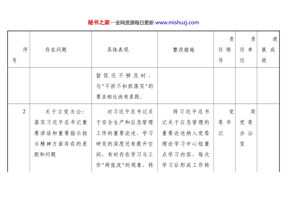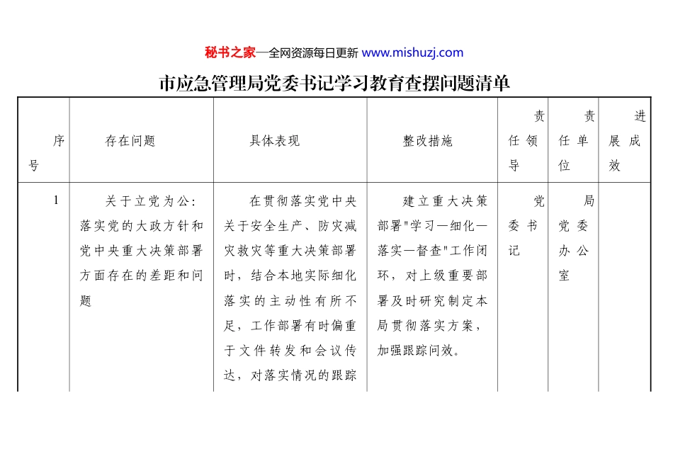 秘书之家—全网资源每日更新 www.mishuzj.com市应急管理局党委书记学习教育查摆问题清单 序号存在问题具体表现整改措施责任 领导责任 单位进展 成效1关于立党为公:落实党的大政方针和党中央重大决策部署方面存在的差距和问题在贯彻落实党中央关于安全生产、防灾减灾救灾等重大决策部署时,结合本地实际细化落 实 的 主 动 性 有 所 不足,工作部署有时偏重于 文 件 转 发 和 会 议 传达,对落实情况的跟踪建立重大决策部署"学习—细化—落实—督查"工作闭环,对上级重要部署及时研究制定本局贯彻落实方案,加强跟踪问效。党委 书记局党 委办 公室秘书之家—全网资源每日更新 www.mishuzj.com序号存在问题具体表现整改措施责任 领导责任 单位进展 成效督 促 还 不 够 及 时 ,与"不折不扣抓落实"的要求相比尚有差距。2关于立党为公:落实习近平总书记重要讲话和重要指示批示精神方面存在的差距和问题对习近平总书记关于安全生产和应急管理工作的重要论述,学习研究的深度还有提升空间,有时存在学习与工作"两张皮"的现象,将将习近平总书记关于应急管理的重要论述纳入党委理论学习中心组重点学习内容,每次学习后形成工作转党委 书记局党 委办 公室秘书之家—全网资源每日更新 www.mishuzj.com序号存在问题具体表现整改措施责任 领导责任 单位进展 成效学习成果转化为推动应急管理工作高质量发展的 具 体 举 措 还 不 够 充分。化清单,确保学以致用。3关于立党为公:树立"全国一盘棋"思想、服务服从大局方面存在的差距和问题在统筹推进应急管理工作与地方经济社会发 展 大 局 的 协 调 配 合上,有时存在就本部门工作看本部门工作的局主动加强与发改、住建、自然资源等相关部门的协调配合,在重大安全风险防控、应急党委 书记局相 关科室秘书之家—全网资源每日更新 www.mishuzj.com序号存在问题具体表现整改措施责任 领导责任 单位进展 成效限,跨部门协调联动的主动性有待加强,服务服从大局的意识还需进一步强化。救援保障等工作中强 化 " 一 盘 棋 " 意识,定期开展跨部门协调会商。4关于立党为公:对照岗位职责履职方面存在的差距和问题在履行应急管理综合监督职责中,对部分行业领域安全风险的研判还不够系统全面,对基层应急管理能力建设制定年度履职清单,对照岗位职责逐项查缺补漏;加强对基层应急管理 工 作 的 业 务 指党委 书记局办 公室秘书之家—全网资源每日更新 www.mishuzj.com序号存在问题具体表现整改措施责任 领导责任 单位进展 成效的指导支持力度有待加强,在推动全市应急管理体系和能力现代化方面,工作的系统性和前瞻性还有提升空间。导,定期开展基层调研,推动工作重心下移。5关于为民造福:坚持人民至上、践行全心全意为人民服务宗旨方面存在的差距在推进应急管理工作中,"人民至上、生命至上"理念的贯彻还需进一步强化,个别工将群众满意度作为衡量应急管理工作成效的重要标准,定期开展群众党委 书记局相 关科室秘书之家—全网资源每日更新 www.mishuzj.com序号存在问题具体表现整改措施责任 领导责任 单位进展 成效和问题作 环 节 存 在 重 程 序 合规、轻群众实际获得感的倾向,应急救援能力建设与群众对安全保障的期待之间还有一定差距。安全感调查,将调查结果作为改进工作的重要依据。6关于为民造福:深入基层、联系服务群众方面存在的差距本人深入基层开展调研的频次有待提高,对基层安全生产工作的建立定期深入基层调研制度,每季度至少赴基层企党委 书记局办 公室秘书之家—全网资源每日更新 www.mishuzj.com序号存在问题具体表现整改措施责任 领导责任 单位进展 成效和问题实际困难和一线群众的真实诉求,有时依赖书面材料了解,实地走访和直接听取意见的机会相对偏少,"坐在办公室看材料"多于深入一线摸实情的问题有所存在。业和乡镇开展一次实地调研,重点了解安全生产薄弱环节 和 群 众 关 切 问题,形成调研报告并推动问题解决。7关于为民造福:在推动化解应急管建立信访问题党局秘书之家—全网资源每日更新 www.mish...