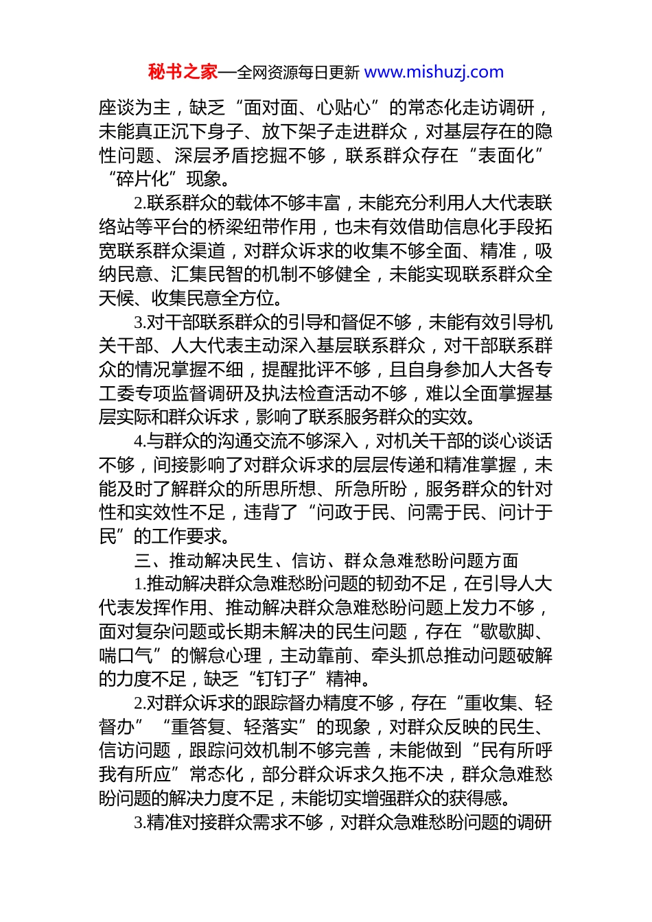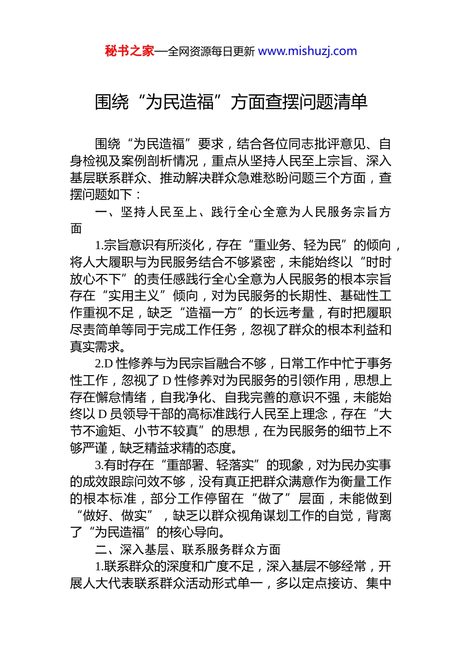 秘书之家—全网资源每日更新 www.mishuzj.com围绕“为民造福”方面查摆问题清单围绕“为民造福”要求,结合各位同志批评意见、自身检视及案例剖析情况,重点从坚持人民至上宗旨、深入基层联系群众、推动解决群众急难愁盼问题三个方面,查摆问题如下:一、坚持人民至上、践行全心全意为人民服务宗旨方面1.宗旨意识有所淡化,存在“重业务、轻为民”的倾向,将人大履职与为民服务结合不够紧密,未能始终以“时时放心不下”的责任感践行全心全意为人民服务的根本宗旨存在“实用主义”倾向,对为民服务的长期性、基础性工作重视不足,缺乏“造福一方”的长远考量,有时把履职尽责简单等同于完成工作任务,忽视了群众的根本利益和真实需求。2.D 性修养与为民宗旨融合不够,日常工作中忙于事务性工作,忽视了 D 性修养对为民服务的引领作用,思想上存在懈怠情绪,自我净化、自我完善的意识不强,未能始终以 D 员领导干部的高标准践行人民至上理念,存在“大节不逾矩、小节不较真”的思想,在为民服务的细节上不够严谨,缺乏精益求精的态度。3.有时存在“重部署、轻落实”的现象,对为民办实事的成效跟踪问效不够,没有真正把群众满意作为衡量工作的根本标准,部分工作停留在“做了”层面,未能做到“做好、做实”,缺乏以群众视角谋划工作的自觉,背离了“为民造福”的核心导向。二、深入基层、联系服务群众方面1.联系群众的深度和广度不足,深入基层不够经常,开展人大代表联系群众活动形式单一,多以定点接访、集中秘书之家—全网资源每日更新 www.mishuzj.com座谈为主,缺乏“面对面、心贴心”的常态化走访调研,未能真正沉下身子、放下架子走进群众,对基层存在的隐性问题、深层矛盾挖掘不够,联系群众存在“表面化”“碎片化”现象。2.联系群众的载体不够丰富,未能充分利用人大代表联络站等平台的桥梁纽带作用,也未有效借助信息化手段拓宽联系群众渠道,对群众诉求的收集不够全面、精准,吸纳民意、汇集民智的机制不够健全,未能实现联系群众全天候、收集民意全方位。3.对干部联系群众的引导和督促不够,未能有效引导机关干部、人大代表主动深入基层联系群众,对干部联系群众的情况掌握不细,提醒批评不够,且自身参加人大各专工委专项监督调研及执法检查活动不够,难以全面掌握基层实际和群众诉求,影响了联系服务群众的实效。4.与群众的沟通交流不够深入,对机关干部的谈心谈话不够,间接影响了对群众诉求的层层传递和精准掌握,未能及时了解群众的所思所想、所急所盼,服务群众的针对性和实效性不足,违背了“问政于民、问需于民、问计于民”的工作要求。三、推动解决民生、信访、群众急难愁盼问题方面1.推动解决群众急难愁盼问题的韧劲不足,在引导人大代表发挥作用、推动解决群众急难愁盼问题上发力不够,面对复杂问题或长期未解决的民生问题,存在“歇歇脚、喘口气”的懈怠心理,主动靠前、牵头抓总推动问题破解的力度不足,缺乏“钉钉子”精神。2.对群众诉求的跟踪督办精度不够,存在“重收集、轻督办”“重答复、轻落实”的现象,对群众反映的民生、信访问题,跟踪问效机制不够完善,未能做到“民有所呼我有所应”常态化,部分群众诉求久拖不决,群众急难愁盼问题的解决力度不足,未能切实增强群众的获得感。3.精准对接群众需求不够,对群众急难愁盼问题的调研秘书之家—全网资源每日更新 www.mishuzj.com分析不够深入,未能精准把握群众需求的重点和难点,在推动解决问题时缺乏针对性举措,未能结合群众实际需求找准解决问题的有效路径,服务群众存在“大水漫灌”现象,难以满足群众多样化、个性化的民生需求。4.对典型案例的反思不够深刻,对照典型案例剖析时,未能深刻反思人大系统在民生问题、群众诉求办理中可能存在的不作为、慢作为问题,对调研视察、建议办理等工作中涉及的民生领域作风问题思考分析不多,未能从案例中汲取教训、完善机制,影响了民生问题和群众急难愁盼问题的解决效能。